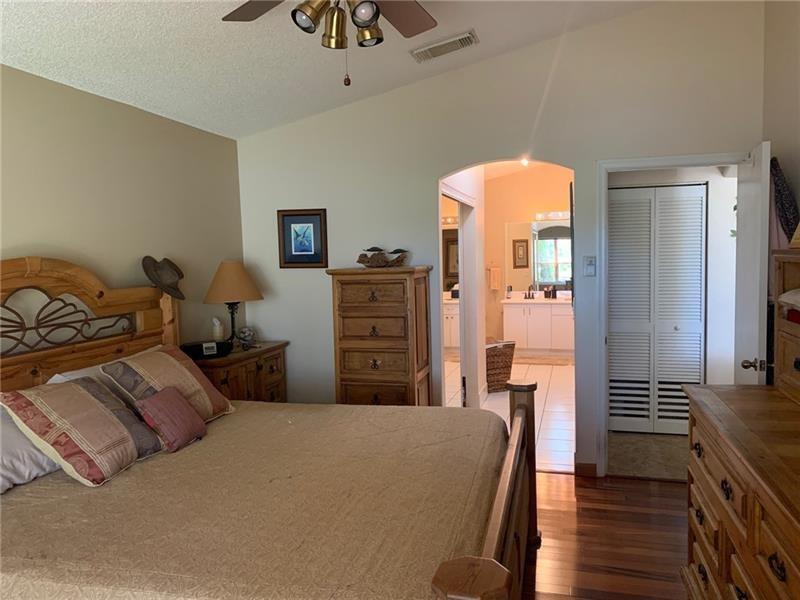 LAKEFRONT 3/2 home on tree-lined, shady street. Mature lush landscaping. Many coconut palms overlooking an east facing lake view and private backyard with brick paver patio. Tiled throughout except rich Brazilian Koa wood floors in each bedroom. Each closet is custom designed. Stainless steel Samsung kitchen appliances. 2 car garage is air conditioned, insulated and has 2 fans. Small dogs or cat will love the custom made doggie door. Accordion shutters. 50 amp panel connection ready to connect to a generator for hurricane preparedness. Oakridge amenities offer Tennis Courts, Basketball Court, Vita course, Boat storage and a brand new deluxe Children's Playground.