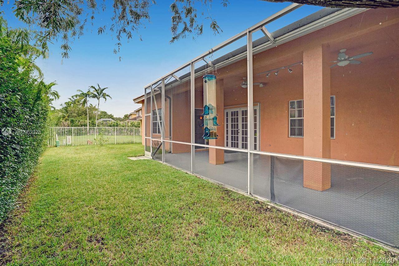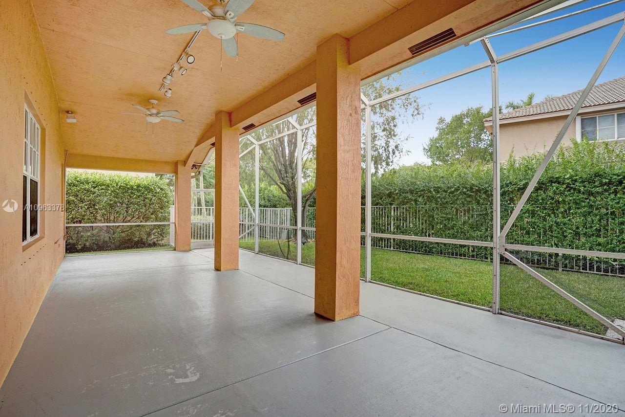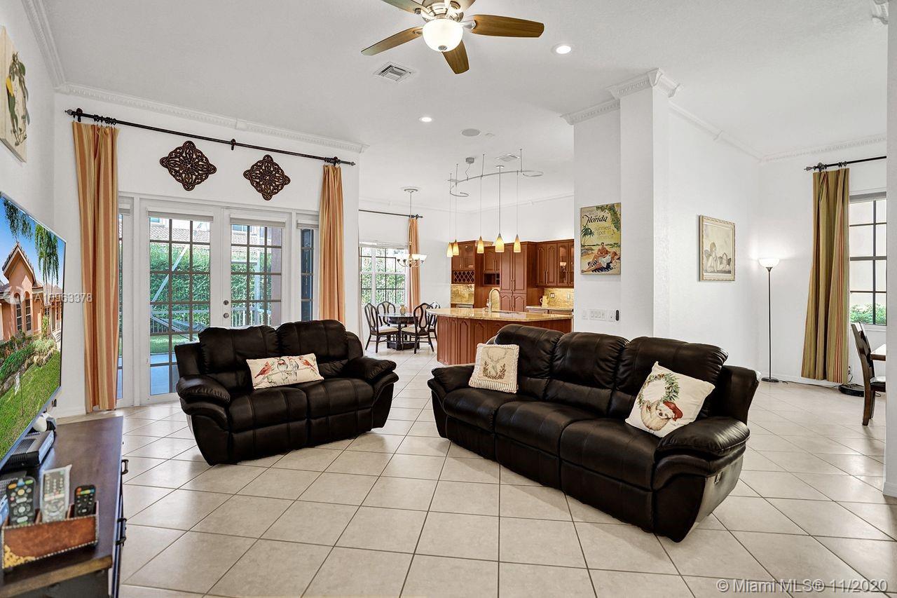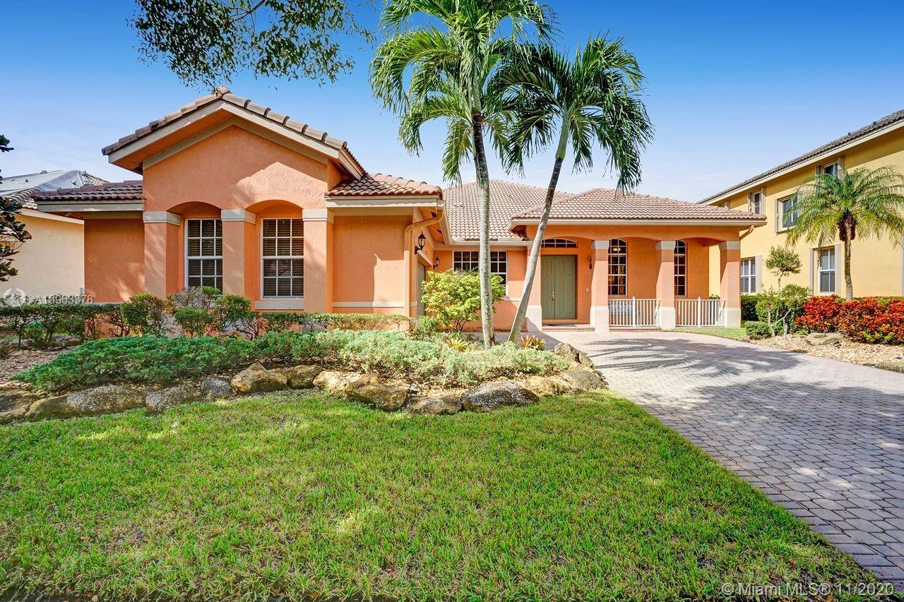 Spectacular family home in Weston desirable Savanna resort style community. One story 4 bedrooms, 2.5 baths, open concept living area with high ceilings, crown molding. Front porch and nice curb appeal. Newer kitchen is spacious with granite countertops, a separate breakfast area, built-in bar, a desk and plenty of cabinet space. Large kitchen island provides extra eating space. There is an oversize covered and screened in back patio/porch for extra outdoor living perfect for entertaining. Master bedroom has also high ceilings with organized closet space. Separate laundry area leads to two car garage with plenty of storage. Tile floor on living area and laminate wood floor on bedrooms. The two-bathroom showers were recently remodeled. Close to A+ schools.