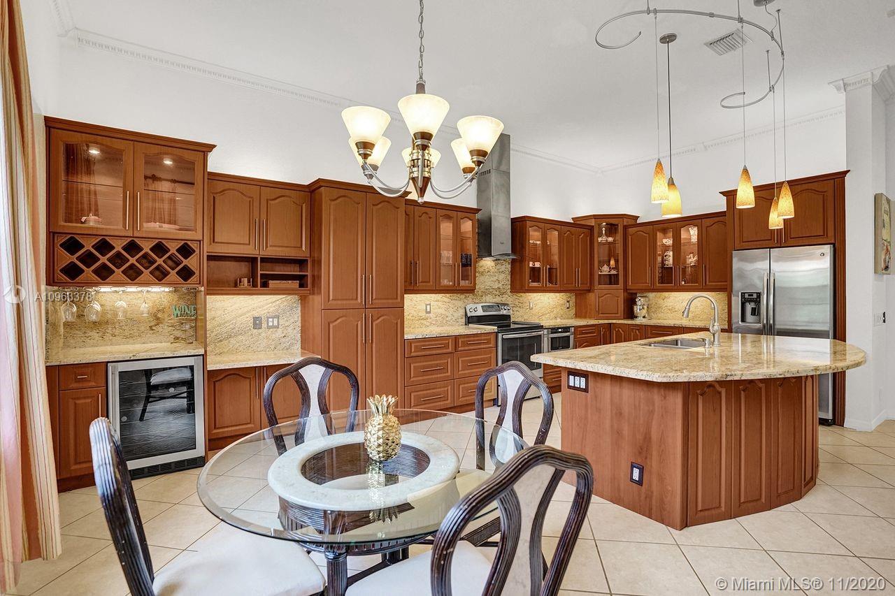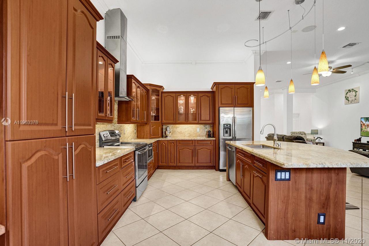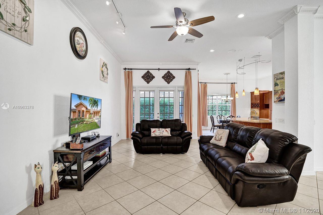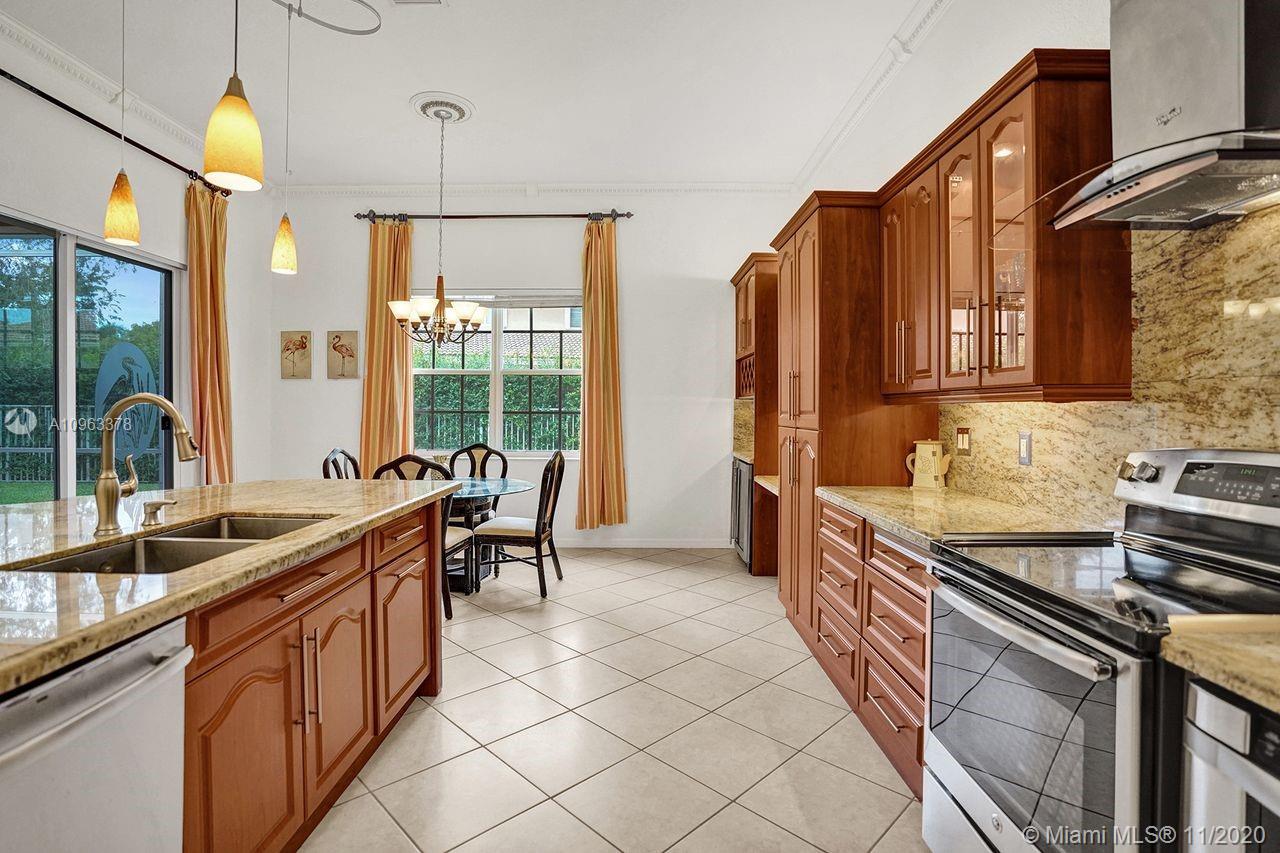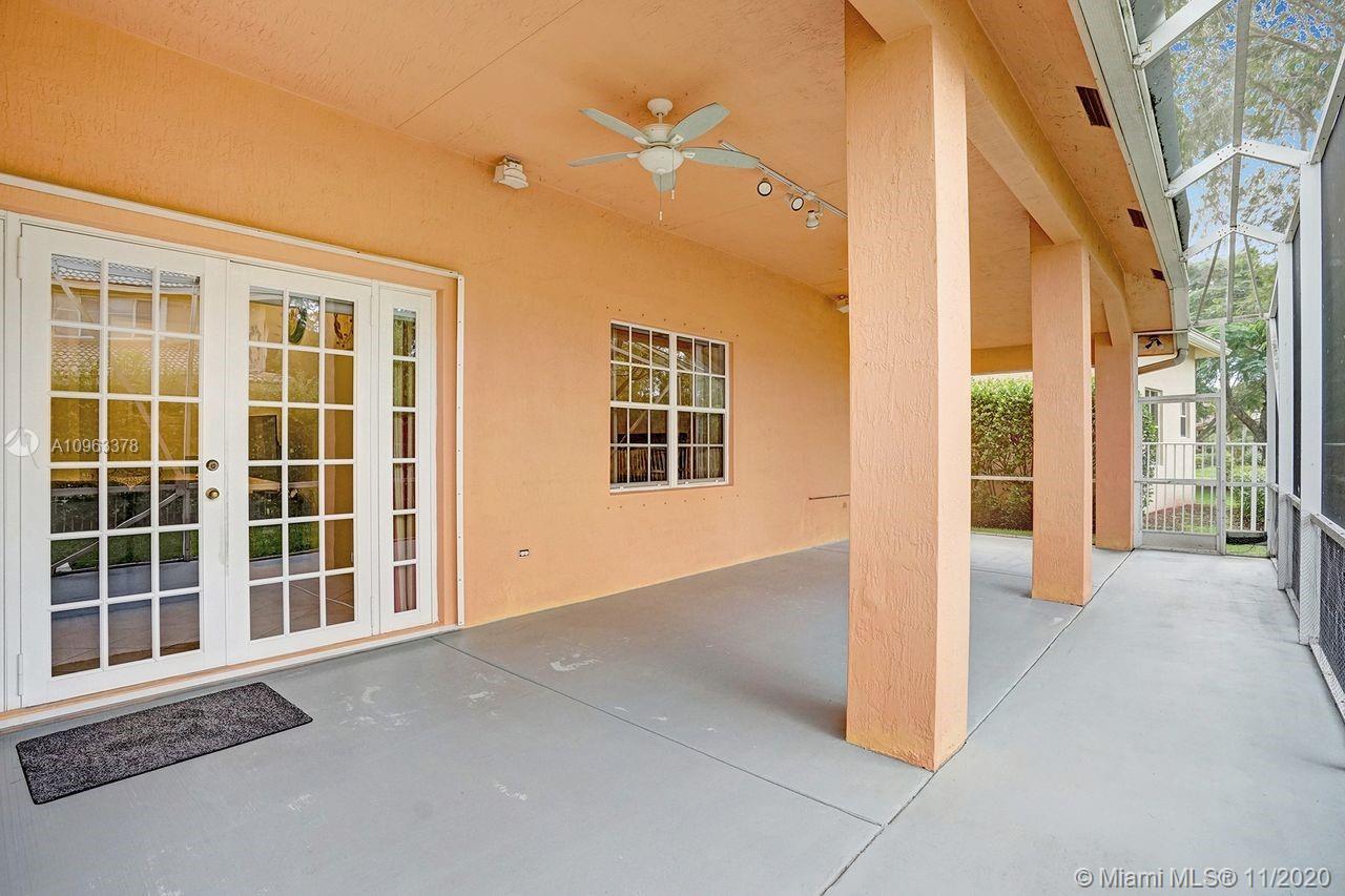 Spectacular family home in Weston desirable Savanna resort style community. One story 4 bedrooms, 2.5 baths, open concept living area with high ceilings, crown molding. Front porch and nice curb appeal. Newer kitchen is spacious with granite countertops, a separate breakfast area, built-in bar, a desk and plenty of cabinet space. Large kitchen island provides extra eating space. There is an oversize covered and screened in back patio/porch for extra outdoor living perfect for entertaining. Master bedroom has also high ceilings with organized closet space. Separate laundry area leads to two car garage with plenty of storage. Tile floor on living area and laminate wood floor on bedrooms. The two-bathroom showers were recently remodeled. Close to A+ schools.