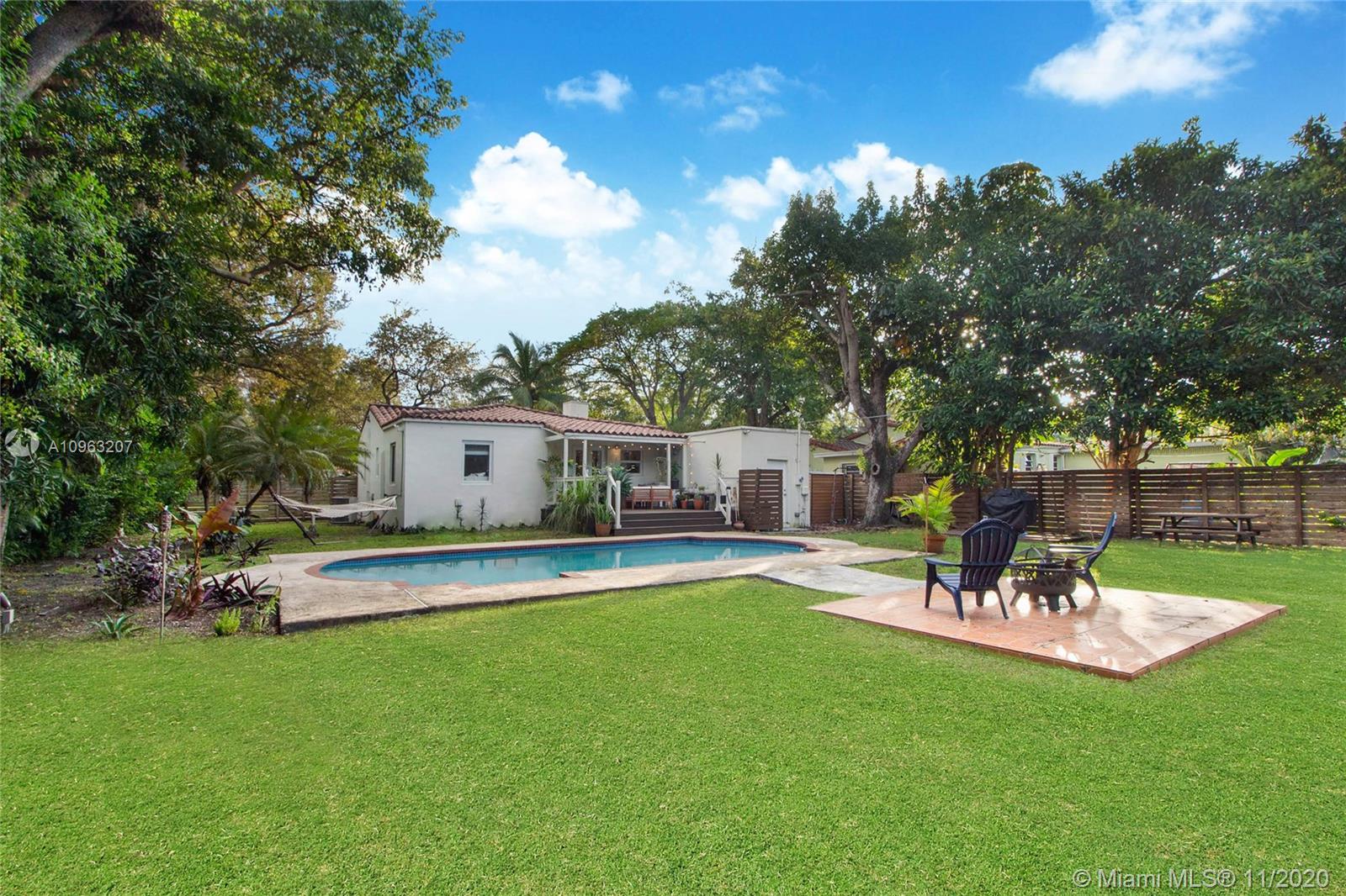 Beautifully renovated home in the heart of Miami Shores. This home is set on a large lot with an enormous backyard and oversized pool—smartly planned floorplan with split 3 bedrooms. The master features a walk-in closet. The master bath has dual vanities/dual shower with designer tiling. The second bath has gorgeous tile, and modern The property is light and bright, with vaulted ceilings, impact windows and doors. The kitchen is renovated with newer stainless steel appliances: a security system & many additional upgrades throughout.