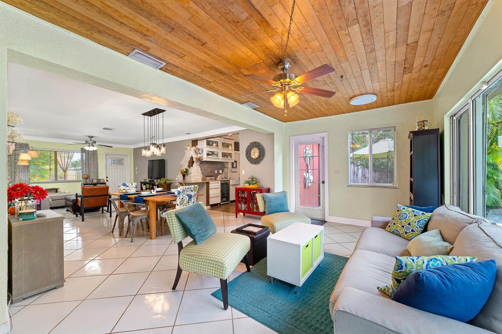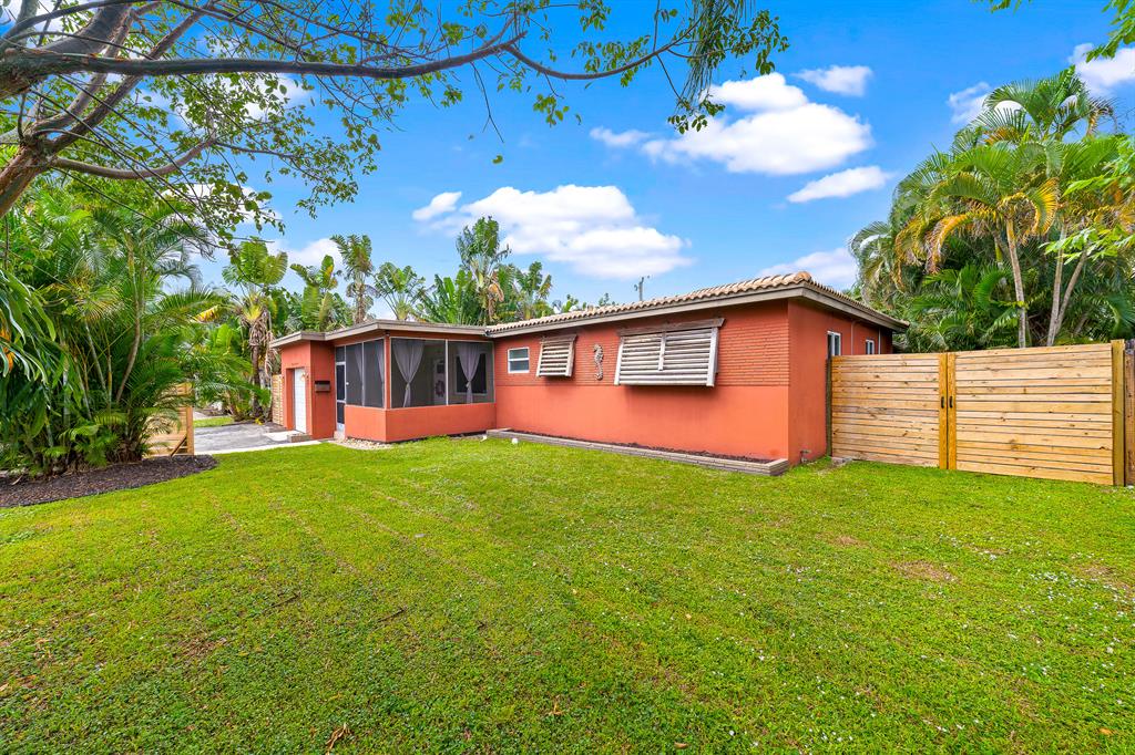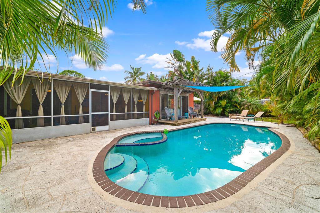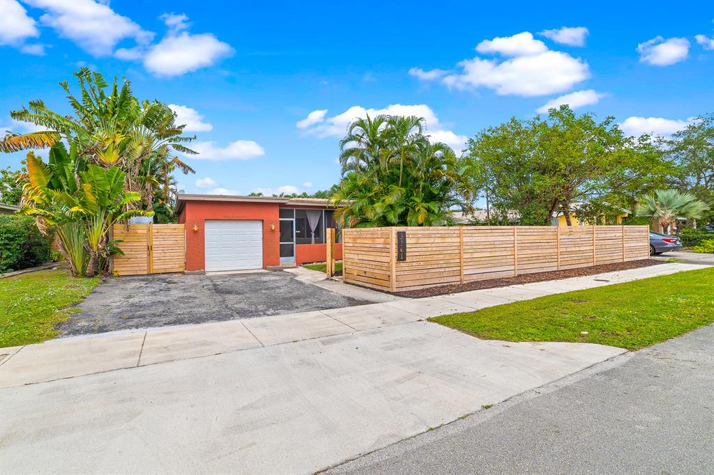 This charming Fort Lauderdale home features lush landscaping with a private front yard, ample driveway parking, a one car garage and comfortable front porch. The home has a modern beachy feel and is extremely well maintained. The property boasts an updated kitchen with newer stainless steel appliances and white cabinetry. The open concept tiled living room opens up into the dining room on through to a cozy seating area. Both secondary bedrooms overlook the pool and private backyard and have wood flooring. The primary bedroom has newer carpeting and plenty of space. Both bathrooms have been updated. The backyard has a tropical feel with large pool and total privacy. The large rear screened porch has ample room for entertaining and relaxing. The home has some impact windows and the