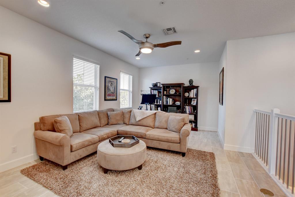 Rarely available upgraded end unit townhome in recently built popular Pointe 100 community. Enjoy the spacious 2 story home with master bedroom down and huge loft plus 3 bedrooms upstairs. The private back has covered patio and serene canal views. White kitchen with quartz counters, mosaic tile backsplash, stainless steel appliances and added upper cabinets for extra storage. Entire home has neutral tile floors. Stairs are wood with iron and wood railing. Other features include wood blinds, impact windows, large walk in closet in master with custom fitted cabinets, large shower in master bath. Furniture negotiable, barely used and in excellent condition. Close proximity to community pool and clubhouse with exercise facility. Membership optional.