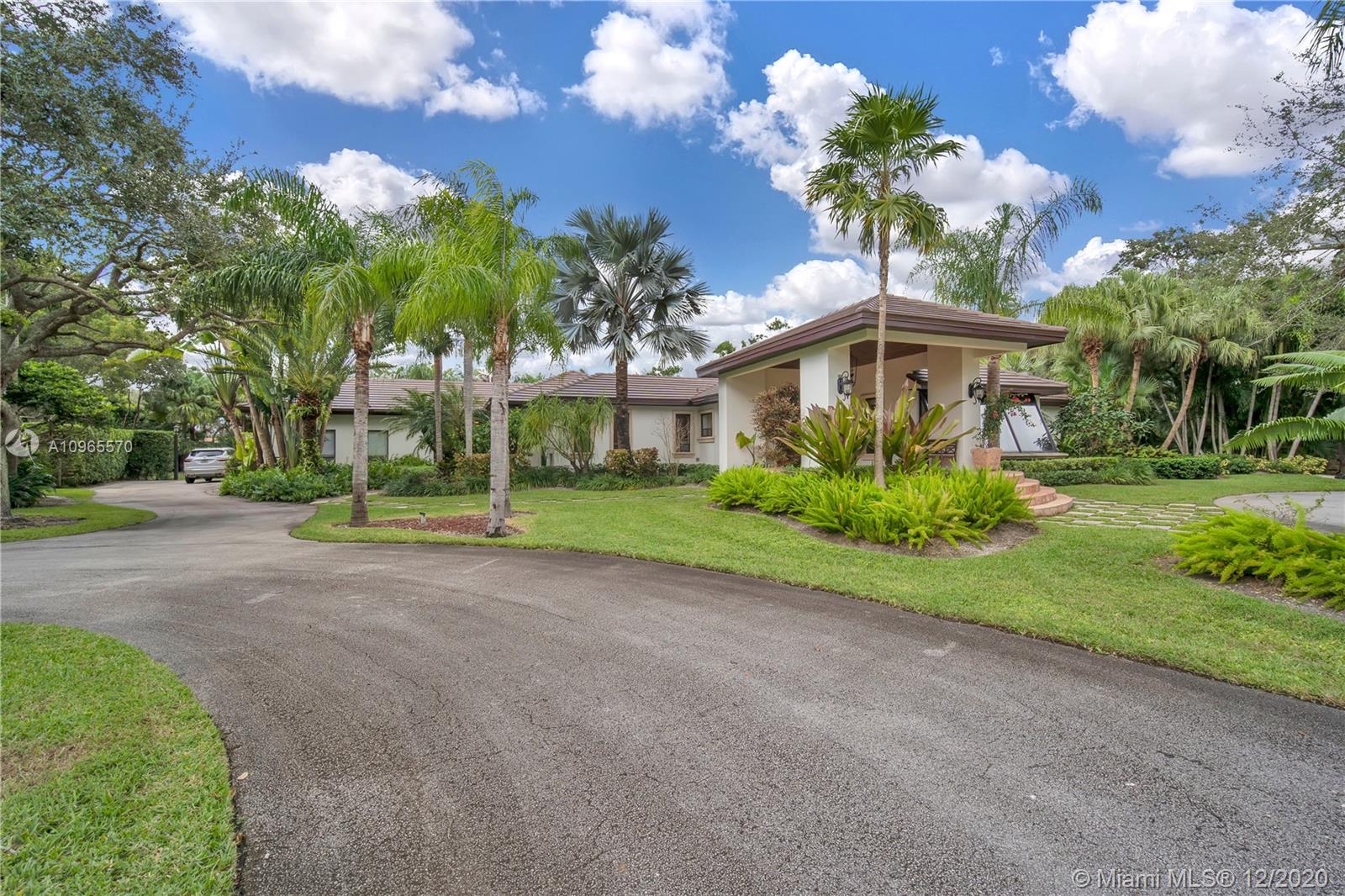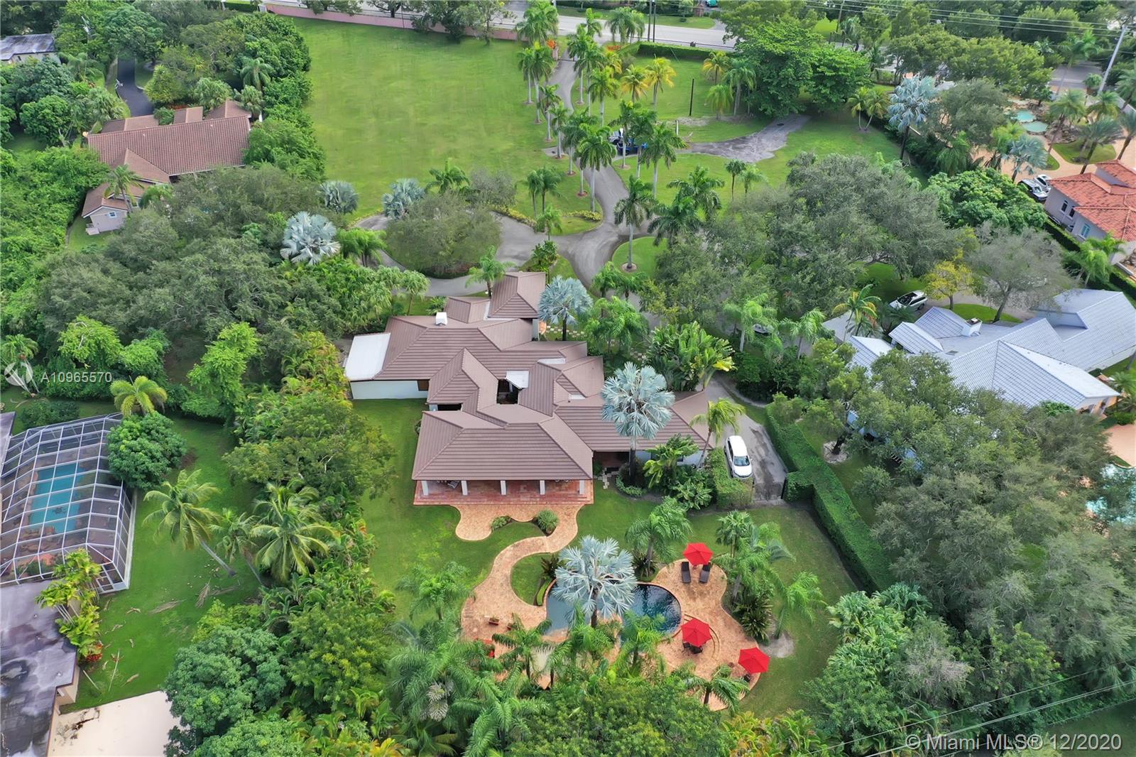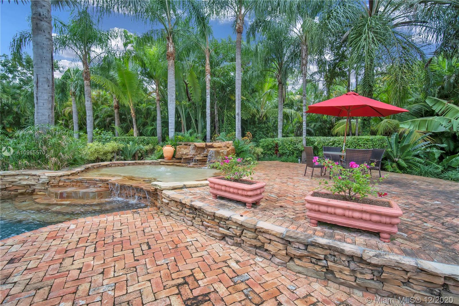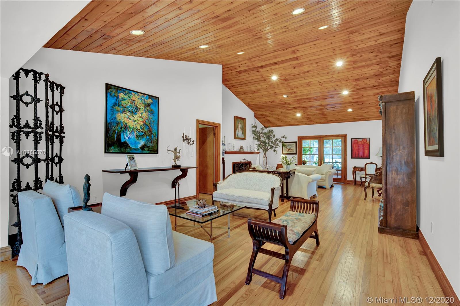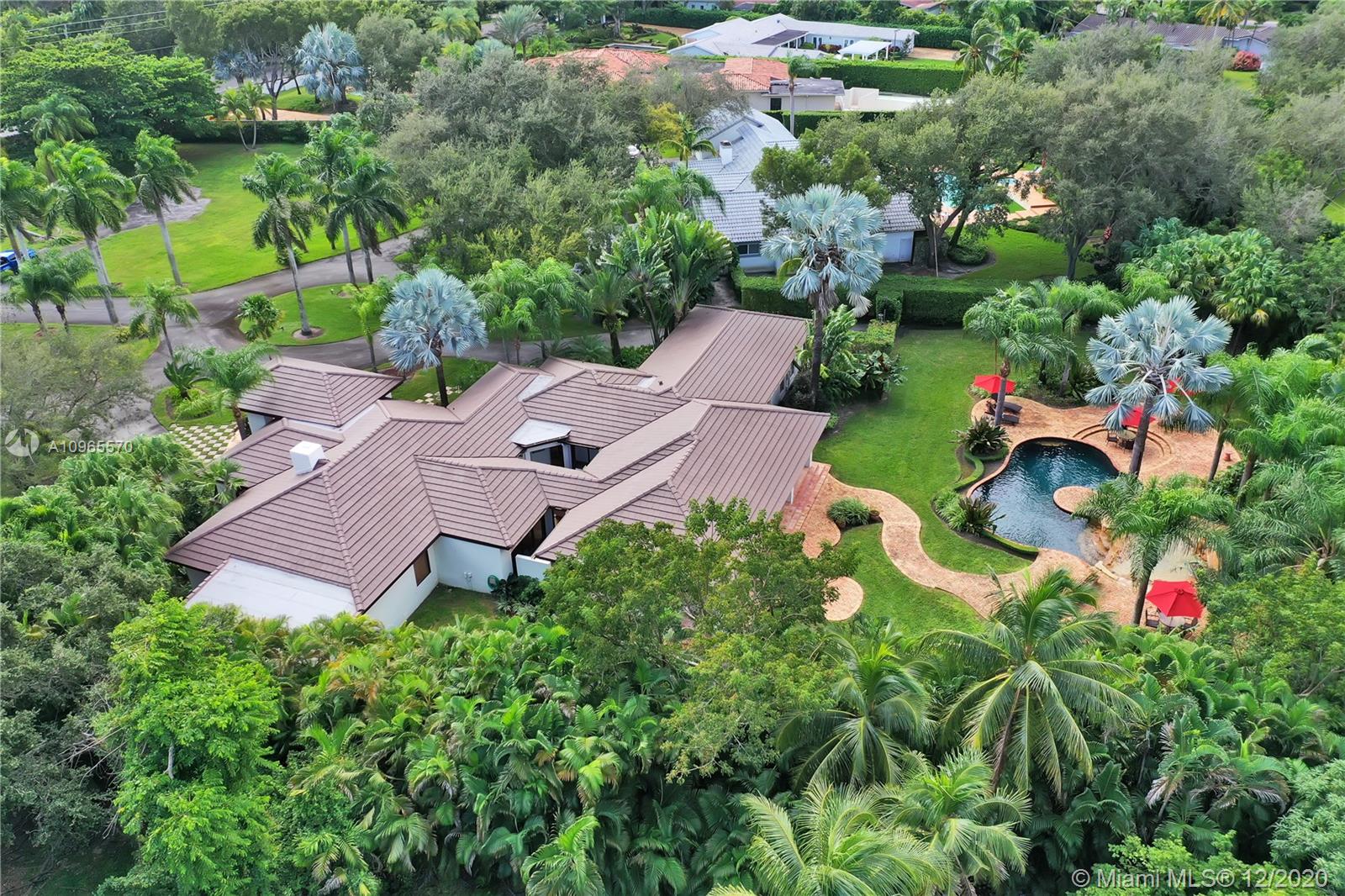 Resort Style living in Pinecrest. Large 4/3.5 home on 41,817 Sq. Ft. lot located in a gated enclave. Enter the great room with beautifully restored original oak wood floors and an 18ft tongue and groove ceiling. The family room with tray ceiling is surrounded by a courtyard and wraparound terrace. Sit in the den with the interior planter for some quiet time. Master suite and 1 Ensuite bedroom located on one side of the house, other two bedrooms with a Jack & Jill bathroom are on the other side. Transport yourself to a resort as you walk the terrace and winding pathway surrounding the lagoon pebble tech pool. The beach entrance & waterfall offer fun family time. This home has the modern-day comfort you're looking for and the luxury you desire. New roof installed 2019, PVC pipes, city water.