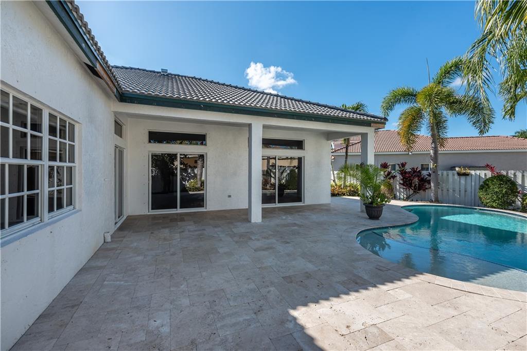 4/2.5 one story at the end of a quiet cul de sac. New roof scheduled for completion mid December 2020. New Ac 2019. Travertine Pool deck wraps around Modern Newer Pool with built in sun shelf. Nice sized outdoor overhang and plenty of travertine decking to entertain the backyard and pool area. Huge side yard fully fenced for endless playtime. Kitchen was remodeled with granite tops, wood cabinets, and stainless steel appliances. Tile flooring throughout entire main living area. Laminate floors in bedrooms. Split bedroom plan. Great flow. Lush landscaping. A plus schools. Elementary school right outside Gate. 24 hour Guard Gated community. Clubhouse, basketball courts, playground, and more.
