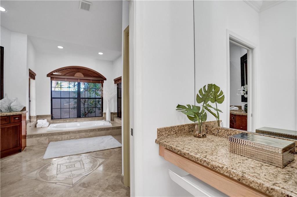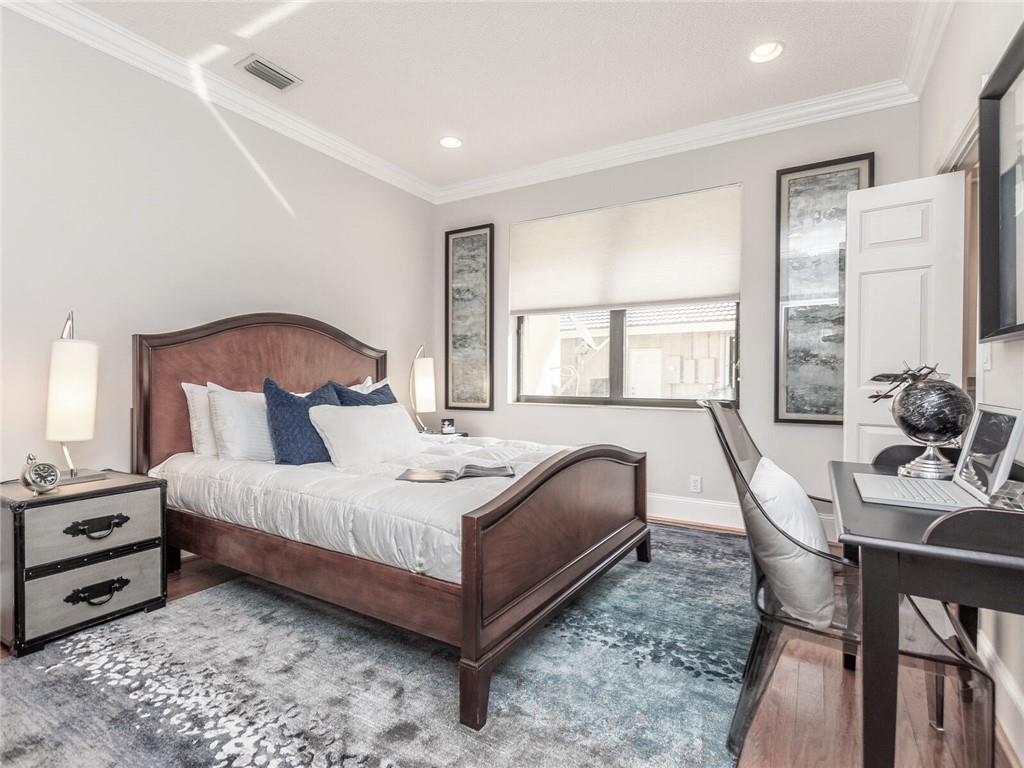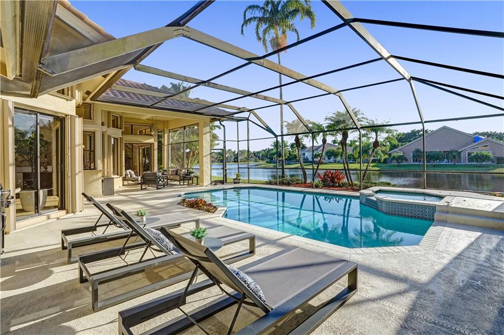 STUNNING 5BD/4.5BA/3CG custom home with many NEW updates on picturesque lakefront lot in boutique enclave of Palm Island with screened pool/raised spa & huge covered patio, perfect for year-round comfort! Almost 4000SF, light, bright, spacious interior, meticulously maintained! Split floorplan with sep kids wing, including suite perfect for in-laws! Solid hardwood & marble flooring in living areas & Master. Luxurious Master Bath, Cabana Bath, gorgeous granite/stainless kitchen w/center island, double ovens, wet bar. BRAND NEW 2020 UPDATES include: entire interior painted in modern white, new flat soaring ceilings (popcorn removed), new modern chandeliers, all LED lights, new sprinkler, pool pump, patio fan, water heater! New Roof 2012, accordions, custom closets, crown molding & much more!