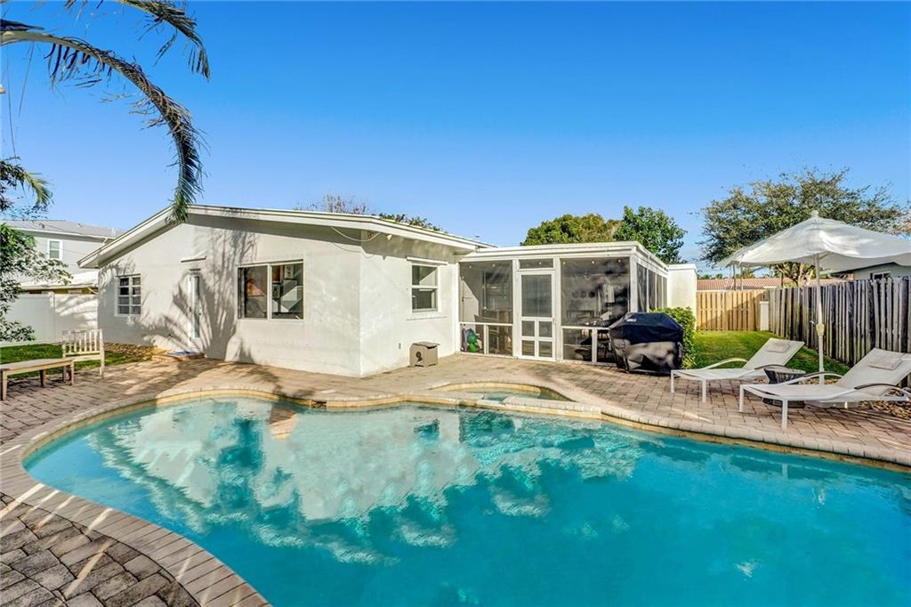 Your Mid Century Modern 3 Bedroom 2 Bath Pool Home with a 2 Car Garage waiting for you! Come enjoy your own oases within a bike ride to the beach, restaurants, and shops! Tile throughout, renovated kitchen and bathrooms, split bedroom floor plan, cabana bathroom to the pool area, and the master bedroom opens to your screened in patio! Heated Pool, Fenced in yard! Hurricane shutters. Great home for a vacation spot, primary home, or investment!!