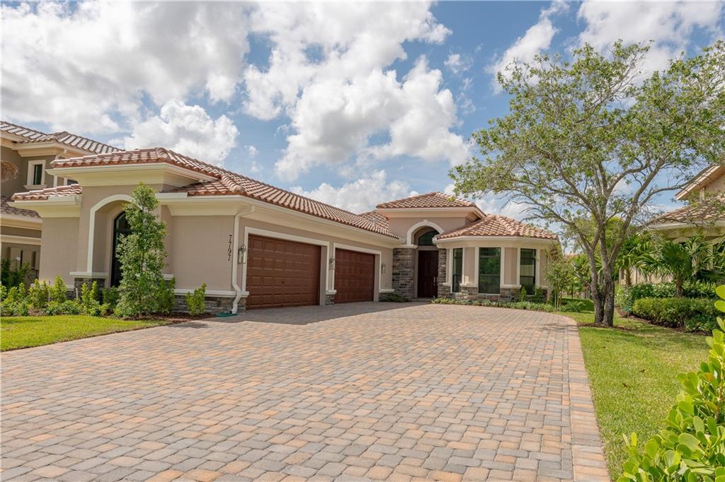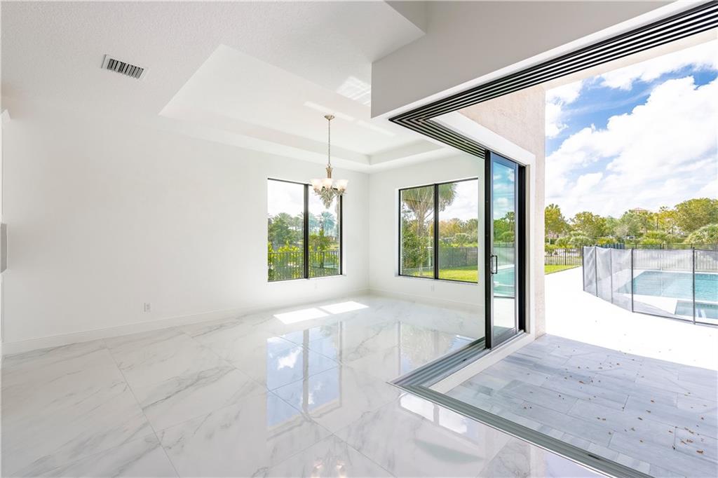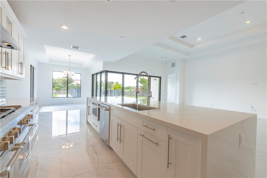 Fabulous, modern, elegant one story home with a 4 car garage. 4 bedrooms, 3 baths overlooking water and gold. Magnificent backyard with white marble patio, enticing pool and incredible sunsets. Quality workmanship is throughout this stunning home. Oversized porcelain floors in main living area, wood tile in all bedrooms. Kitchen is a chef's dream, white quartz and cabinets, gas stove, wine refrigerator, oversized island and attention to detail is everywhere. This custom home features beautiful ceilings, a sliding door that opens from the living room around to the kitchen, upgraded bathrooms, impact windows and a 4 car garage with finished floors. This home will not last and is one of a kind. New Pictures are coming soon, these were taken during the building of the home.