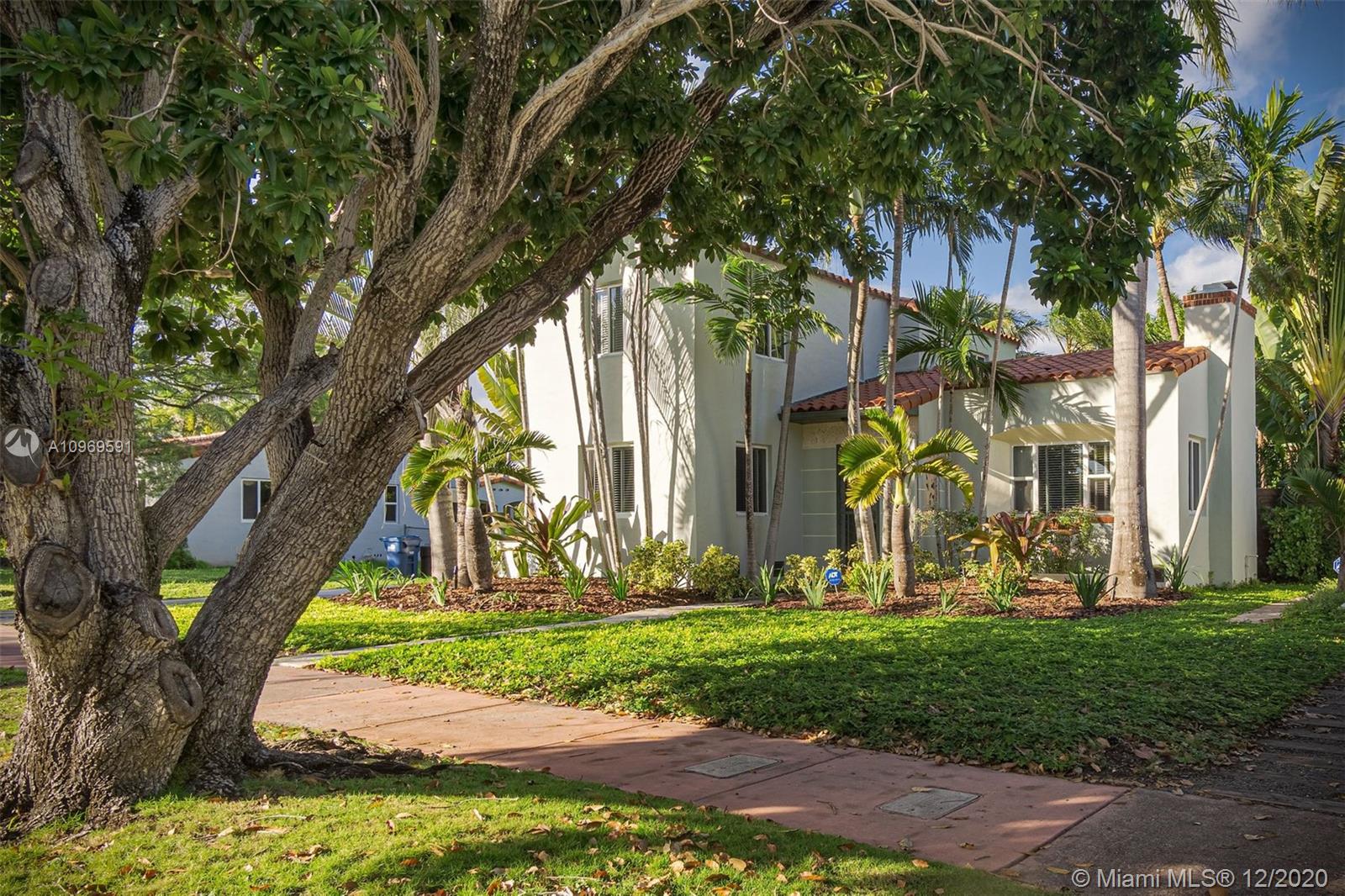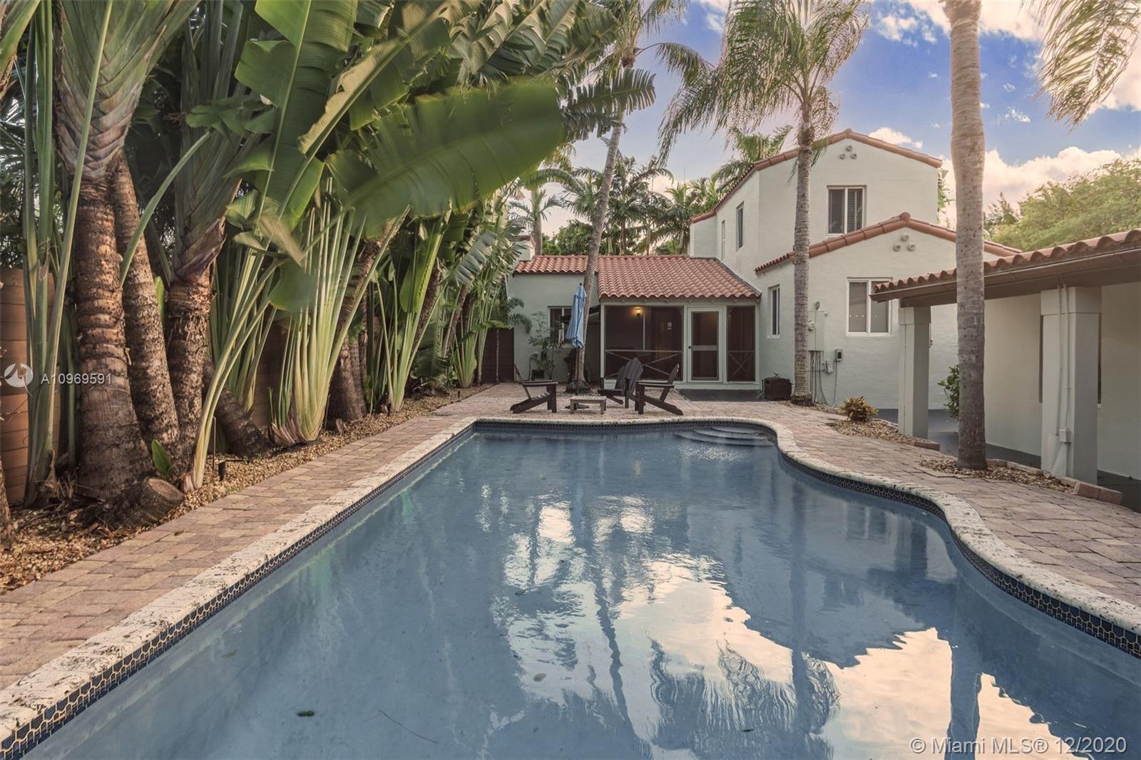 Beautifully updated Miami Beach Mediterranean pool home with guest house. Located on a quiet, tree-lined street, meticulously maintained & updated, the main house features vaulted ceiling with wood burning fireplace, wood floors, beautifully updated kitchen/dining room, powder room & bedroom suite. Upstairs features two bedrooms and one bath. French doors in Living room and Dining room lead to screened-in patio over looking the pool. Impact windows throughout. Natural Gas. Resort-like backyard- with mosquito control system- is landscaped with variety of palms & tropical plants, surrounding custom designed heated pool. Detached guesthouse includes 1BR/1BA cottage & studio. 20min walk/8min bike to beach. 2 blocks to Ritz Carlton residences. Walking distance to houses of worship.
