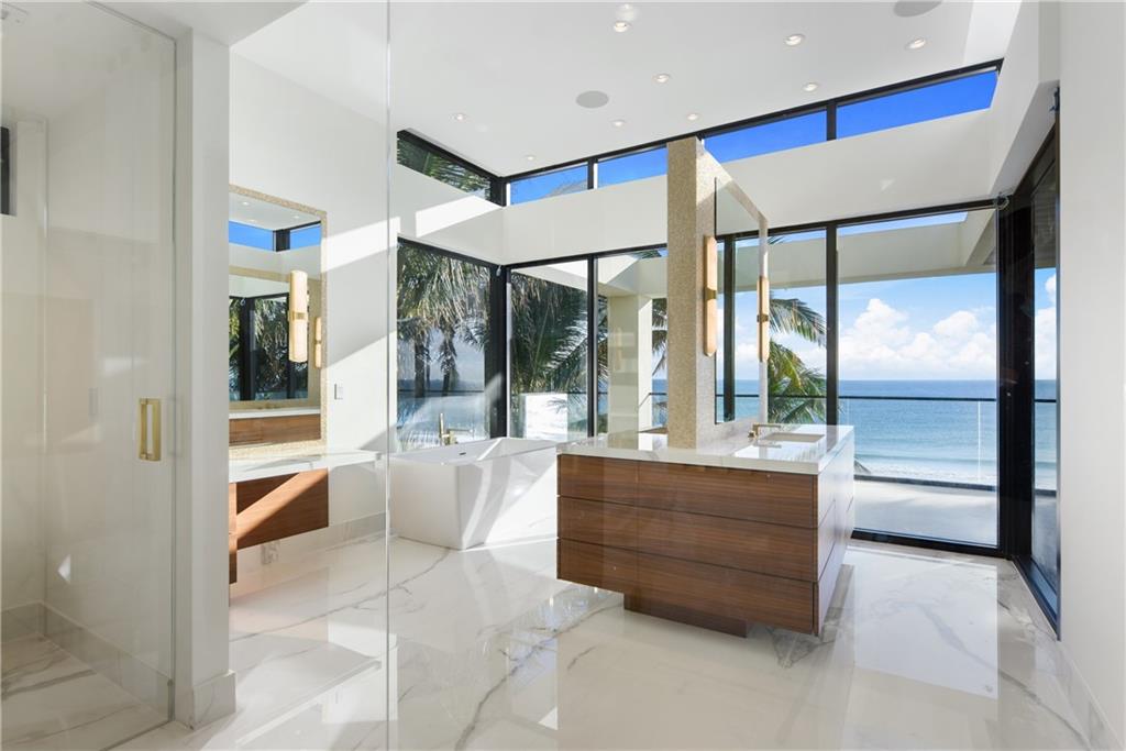 Luxury oceanfront living directly on the sand of Fort Lauderdale Beach. Bomar Builders has just completed construction on this new modern, custom residence on 50ft of sand showcasing expansive, breathtaking ocean views. This gorgeous 4BR | 5.5 BATH | 2 CAR three story residence has a commercial elevator and features a custom Italian kitchen with Miele appliances, stone slab encased fireplace, expansive balconies from the main living area as well as the master bedroom, glass walled en suite office, walnut and Italian porcelain flooring, home automation and more. The expansive master bedroom opens up to the spacious master balcony overlooking the heated, salt water pool and ocean. The master bathroom features custom his and her vanities, dressing table, large master shower and soaking tub.