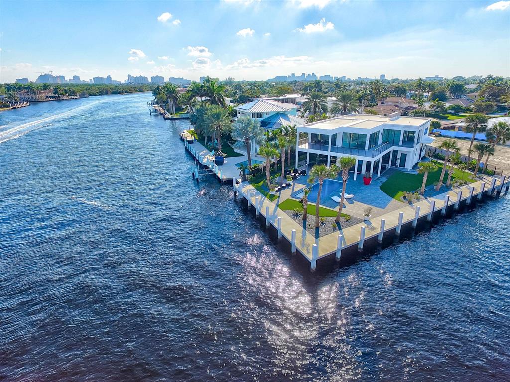 Welcome to one of the most incredible new waterfront homes South Florida has to offer. This masterpiece was built on a 12488 sq. ft. point lot, with over 190 feet of water frontage on the Intracoastal water way. Crafted with extreme detail and the highest end finishes, this home has stunning water views from every room. This concrete/steel construction was professionally designed beyond any expectation. The lot boasts 65 feet on the ICW, and 125 feet on the canal, allowing a 105 foot long yacht or multiple boats without interfering with your view. The double glass door foyer opens to soaring 22 ft tall ceilings. The spectacular chef's kitchen boasts a Viking professional package with 8 gas burner stove, an expansive 15-foot Island, Lapitec countertops, and black matte finger print proof