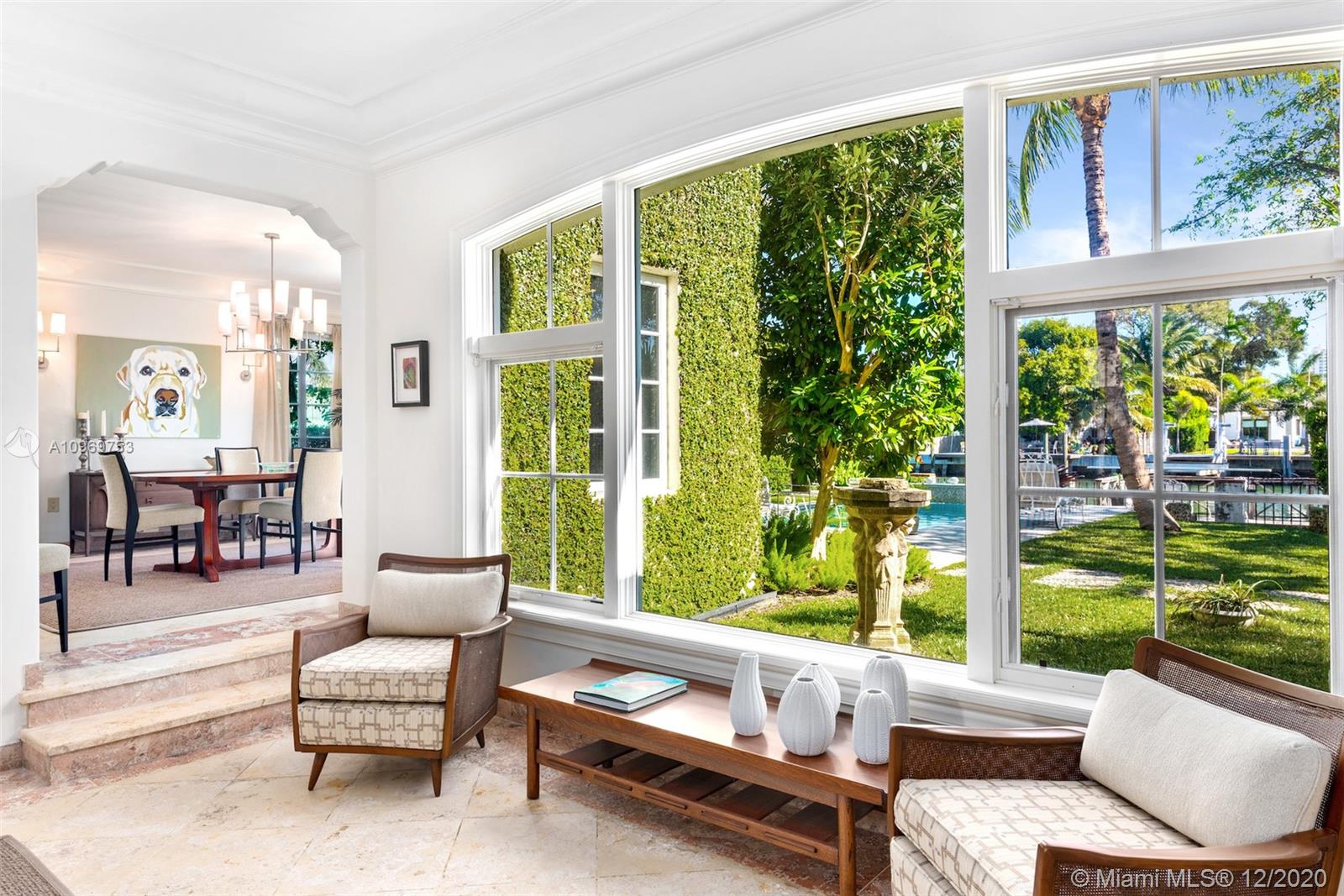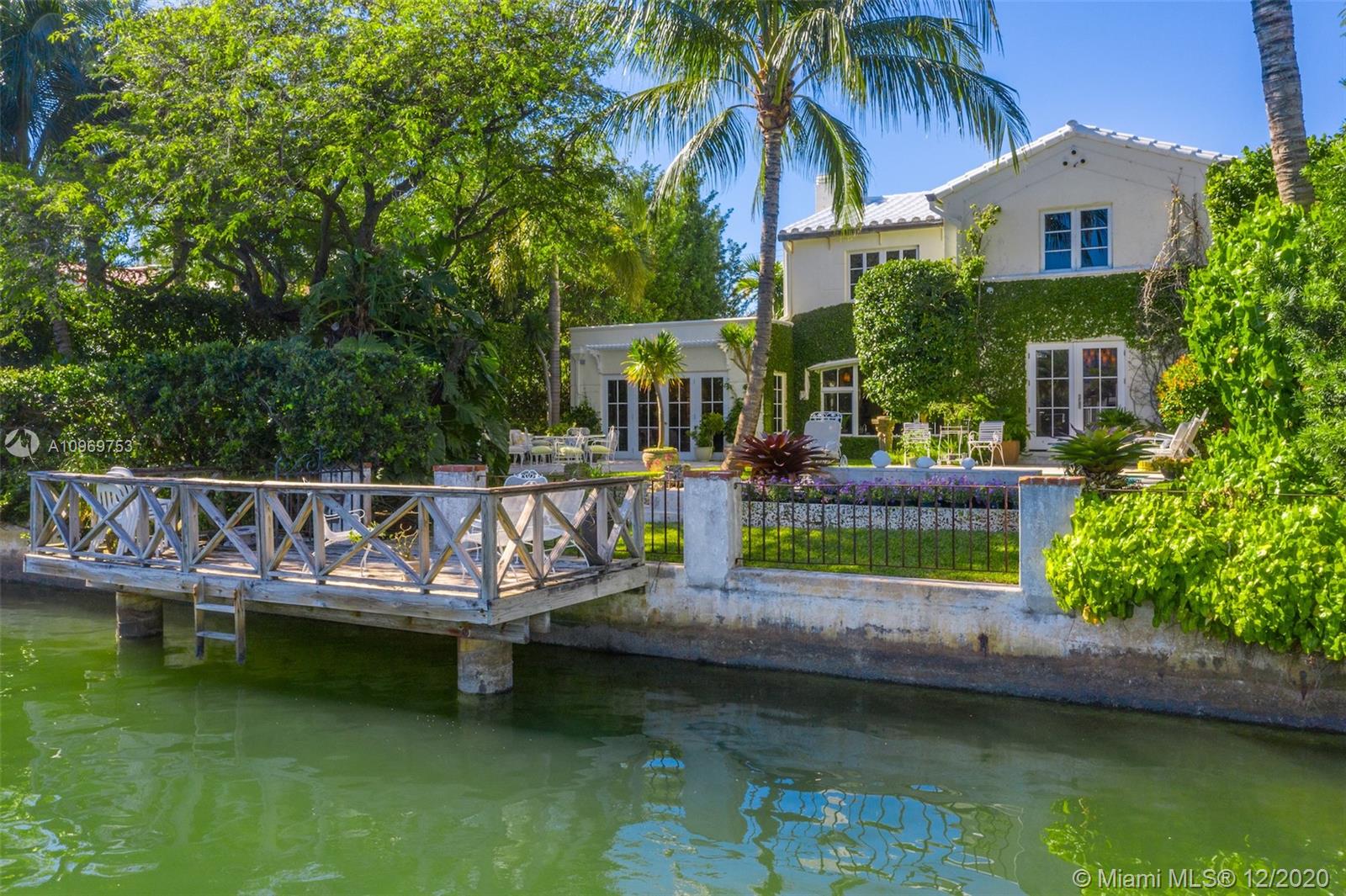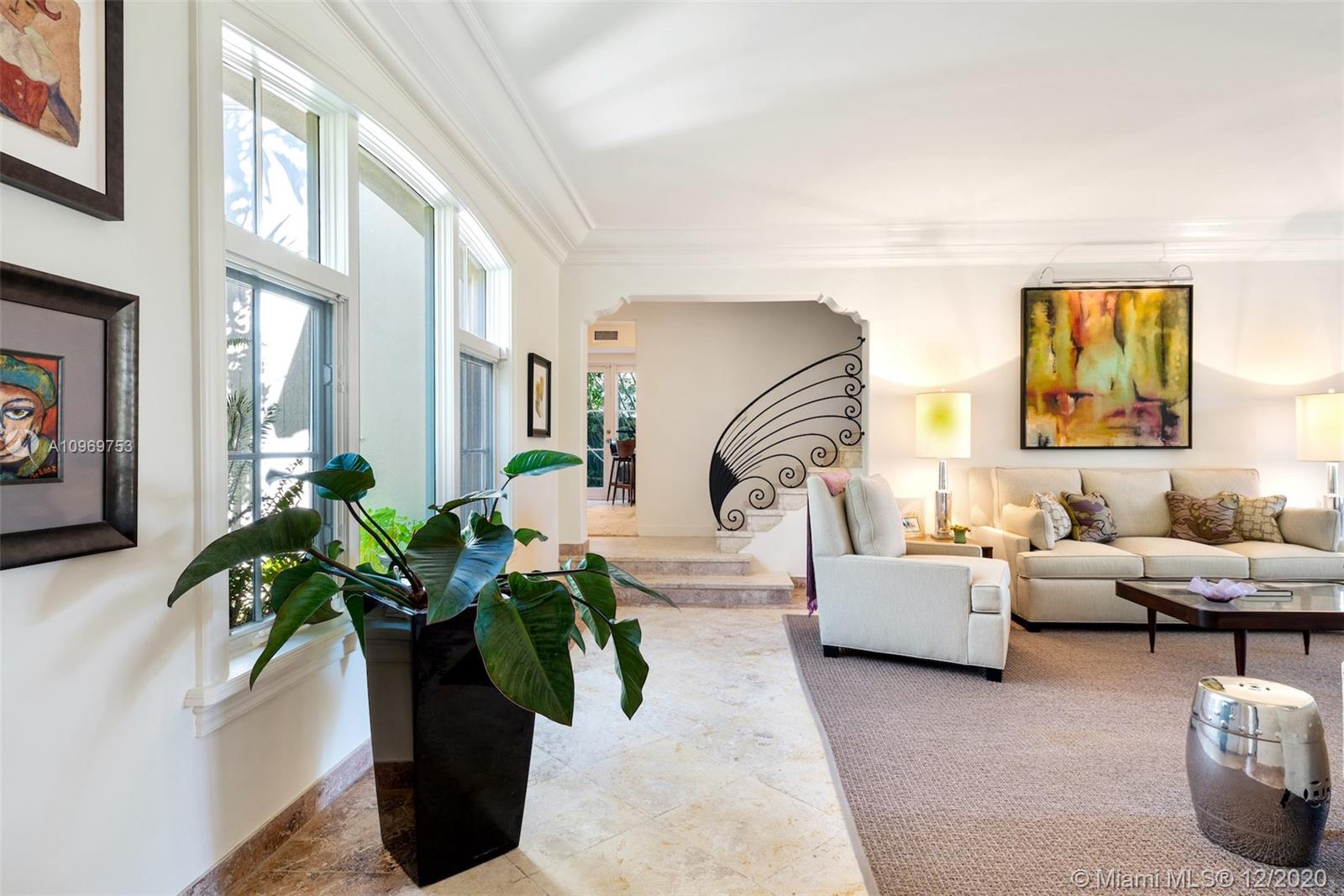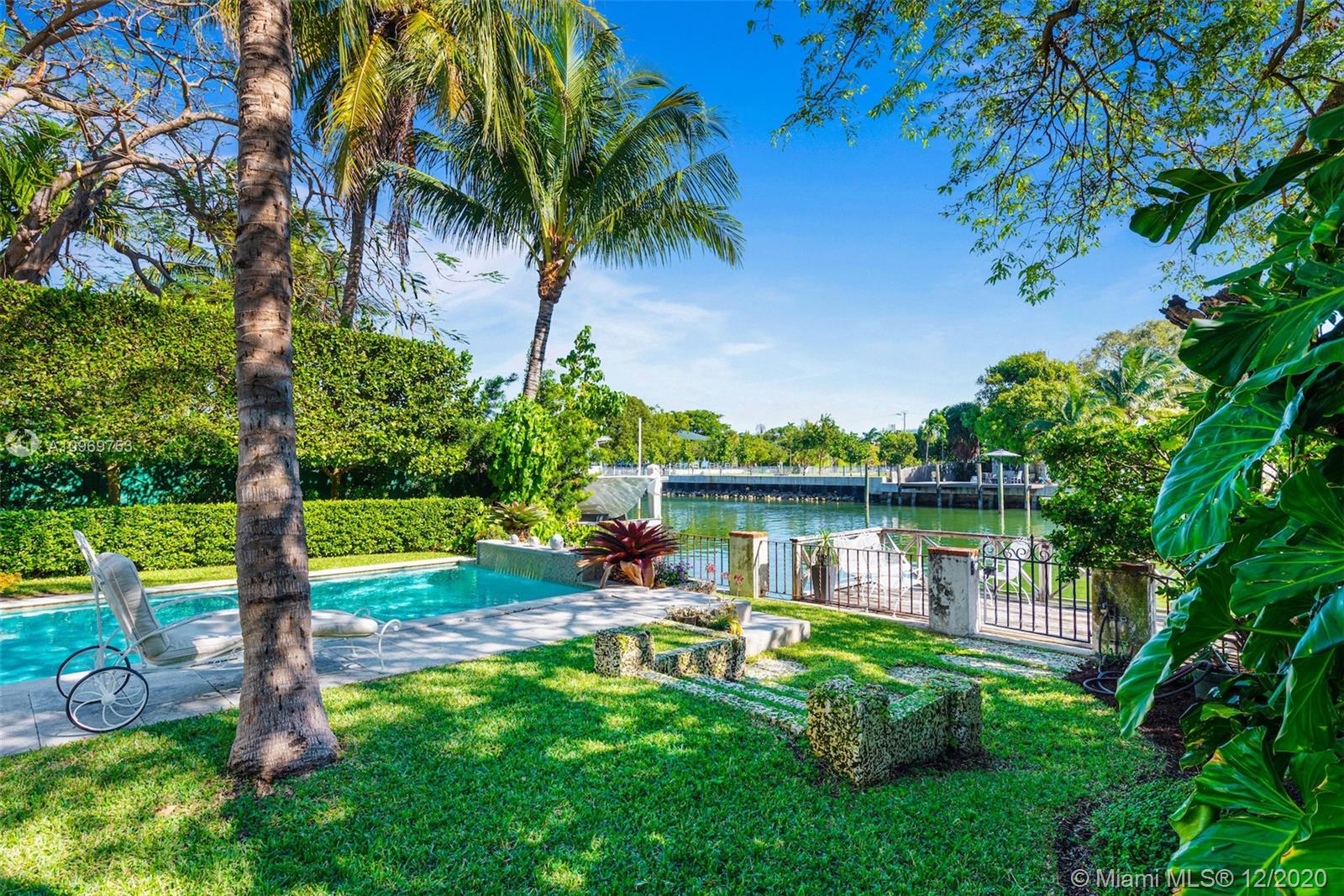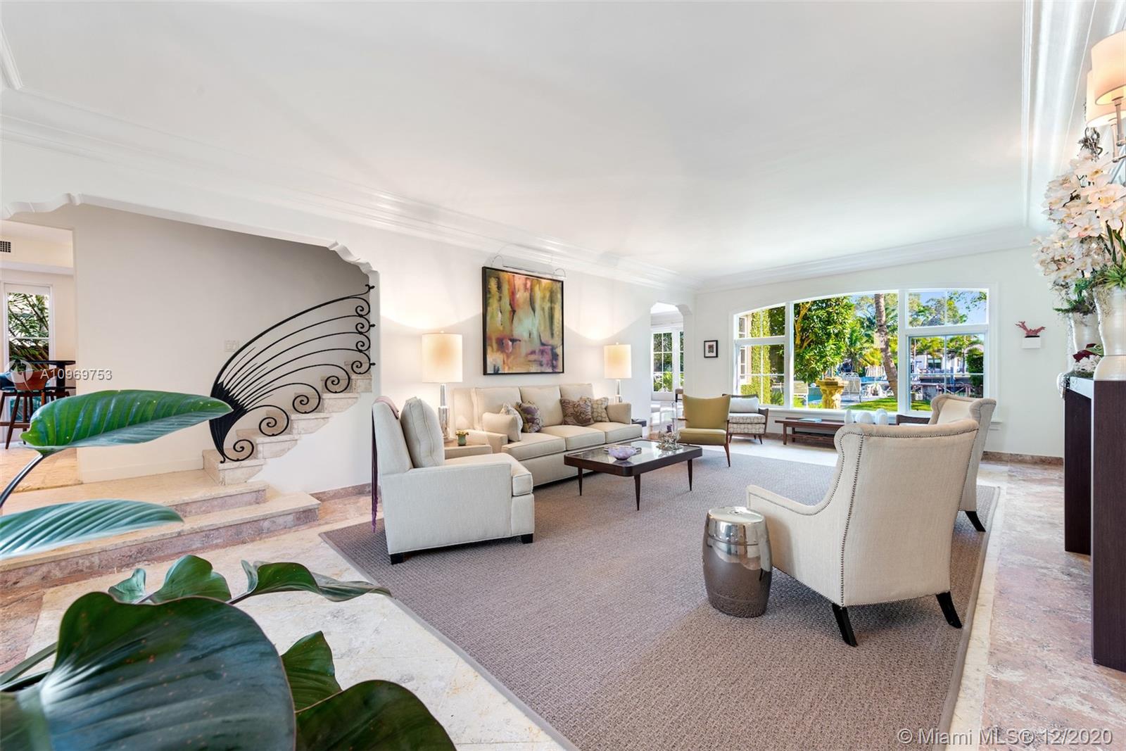 Ideally situated on oversized nearly 10,000 SF waterfront lot, this gorgeously renovated 2story Deco dream awaits its new owners. Residence is fully gated & lushly landscaped for the utmost privacy on 65ft of navigable waters. Home features rarely available 4,278 total SF & 5bd + FamilyRm floorplan (easily convertible to a 6th bd/1st FlrMstr). Once inside, bright&light living spaces feature coral tile flooring, unique fixtures & high-end finishes throughout. 3bds up, each w/ ensuite Bath + separate stairway leading to semi-detached 2 add’l bdr/office areas w/ full bath. Master suite offers its own terrace! Add'l offerings include impact glass,2 CG & full home surveillance system. Relax after a long day by the courtyard fountain,heated saltwater pool,or your very own coral tiled patio&dock!