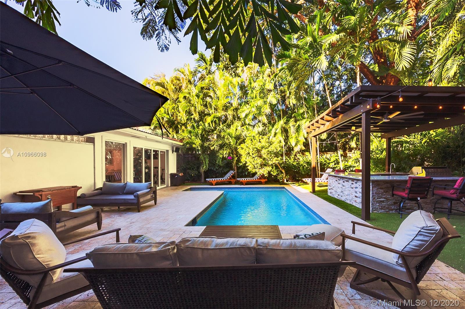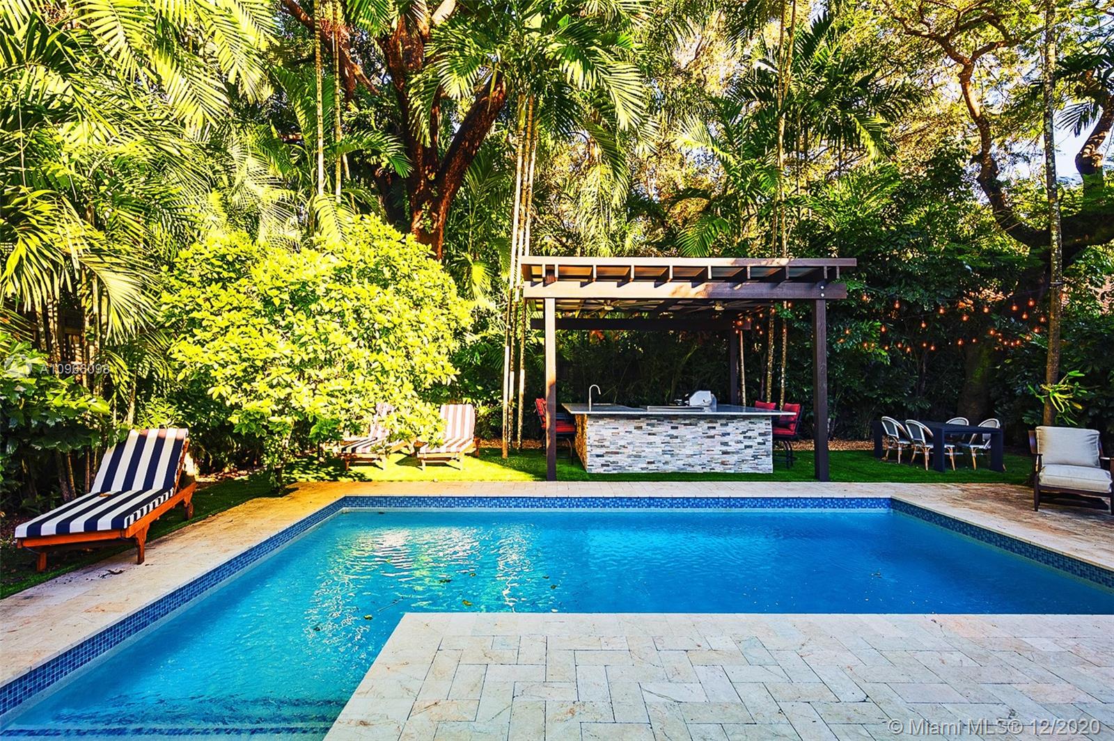 Walk into you own private tropical paradise resort in South Coconut Grove surrounded by $2+ million dollar. 3 bedroom, 3 bath spacious home. Enjoy the gorgeous backyard filled with foliage. Beautiful trees line this home with renovated marble bathrooms and Brazilian Koa floors. New heated pool with outdoor custom kitchen gazebo that has 2 grills and a custom mosquito system. Florida living at it’s best, it’s a must see!