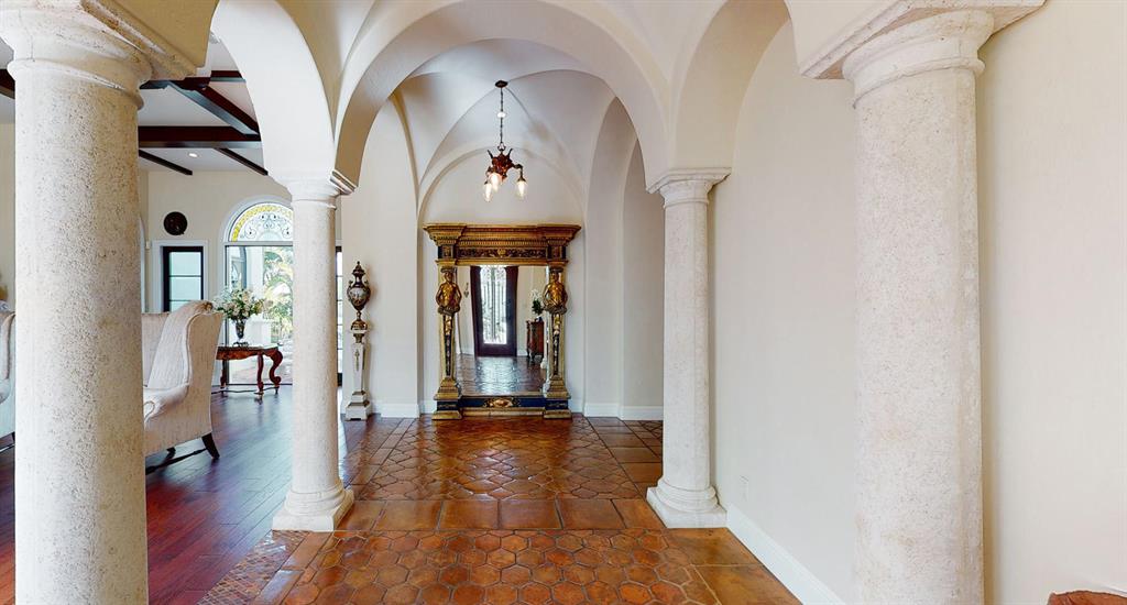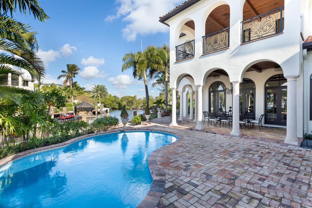 A beautifully landscaped brick motor court and a welcoming gated inner courtyard with a fountain introduce this impressive residence. With 100+/- feet on the waterfront and a deep-water full-service dock, this legacy property offers beautiful partial views down the canal to a nature preserve. Sundrenched and serene, with mature low-maintenance landscaping providing privacy, a dining loggia and a summer-kitchen loggia overlook the free-form waterfall pool and Jacuzzi set within a bricked terrace, and a walkway leads to the private sauna. Shown by appt. only.