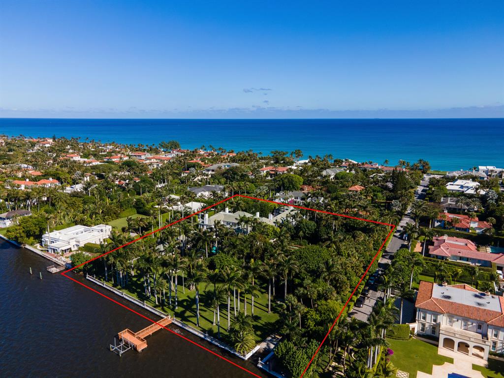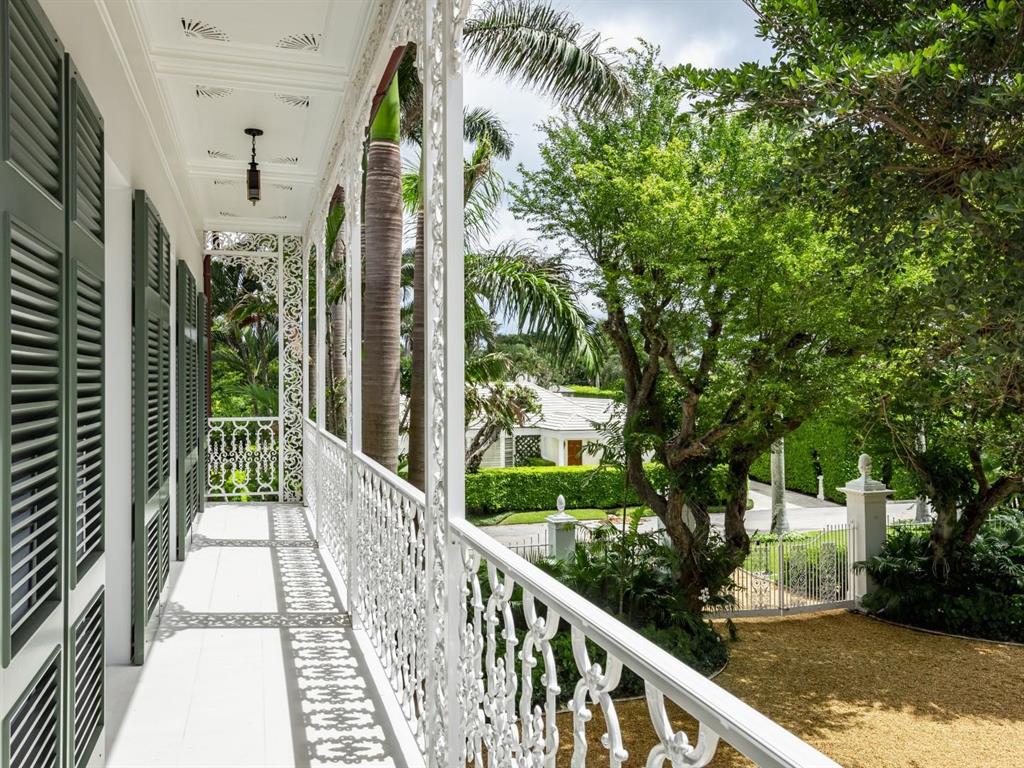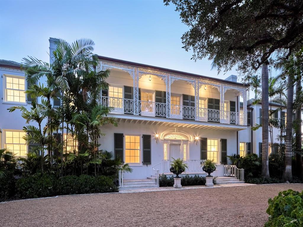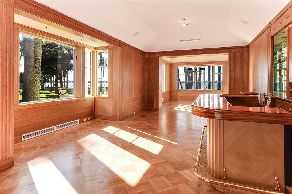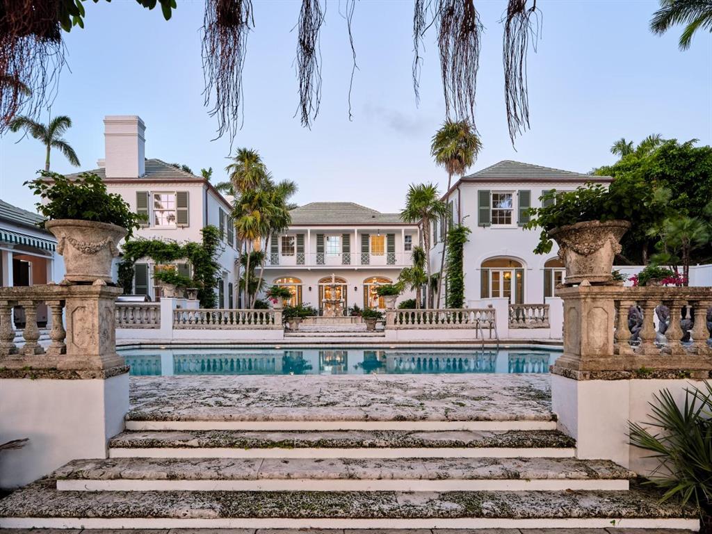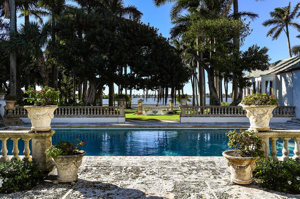 Palm Beach Grandeur- Direct waterfront compound on exceptional, rare 3+ acre estate. Located along the Intracoastal in the Estate Section, this home features stunning sunset views, boat dock, and tennis court with viewers' terrace. Landmarked home designed by Marion Sims Wyeth with 9 bedrooms, 10 full baths, and 6 powder rooms. Fantastic outdoor spaces include stunning landscaping, welcoming motor court, terraces, outdoor kitchen, beautiful koi ponds with garden bridge, and waterfront pool. Highlights include gorgeous European detailing, paneled library, elevator, and 6 car garage. Gym with built-in bar, and spa with changing room, steam shower, custom sauna, and powder room., Theater features drop-down movie screen, integrated speakers, wood paneling, and large bar.