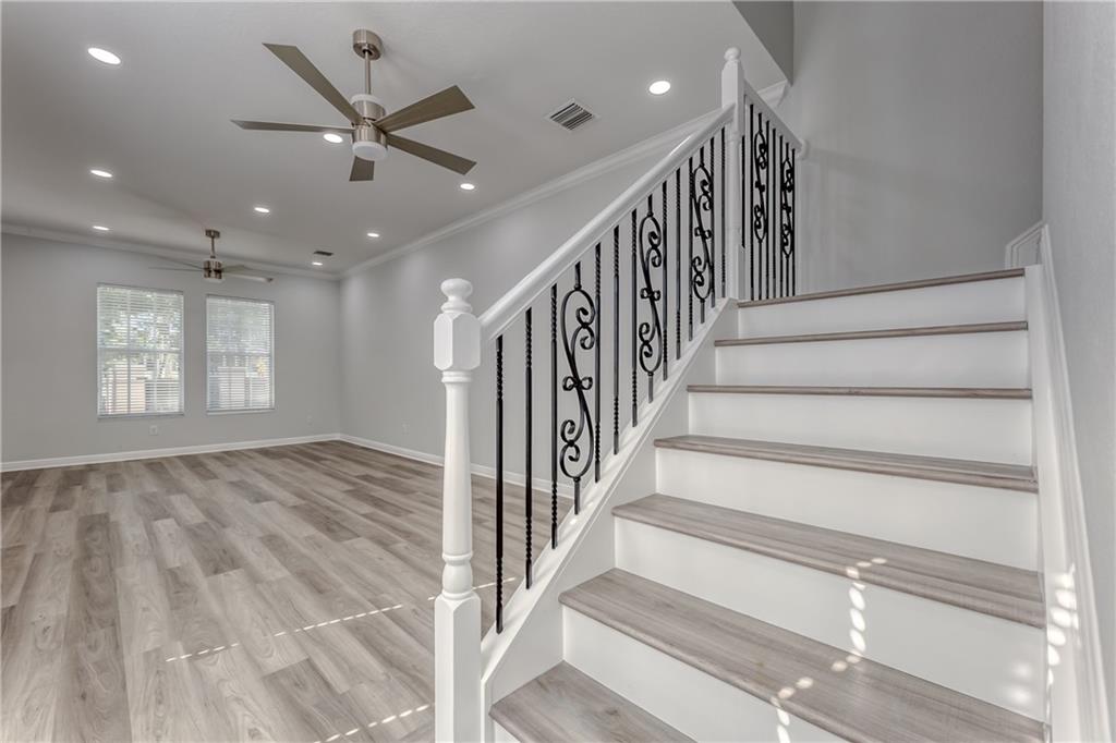 This beautifully remodeled townhome is in sought after Central Park. Located on a private lane this end unit has views of the garden & the pond. Ready to move in. Townhome has a contemporary coastal vibe freshly painted with new flooring throughout. Kitchen is in classic white with blue water accents and white counters. Large two car garage with epoxy painted floors. Half bath has new fixtures, vanity and toilet. Upstairs has a split bedroom plan with a very private primary bedroom with two walk in closets and a private balcony overlooking the park. The primary bathroom has new tile, double vanity and fixtures. On the second floor is the laundry room, linen closet & guest bedrooms. & remodeled bath. Pool & Gym, Cable, pets ok. Newer AC. Impact windows. Rentals ok. Crown moulding