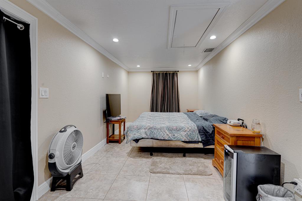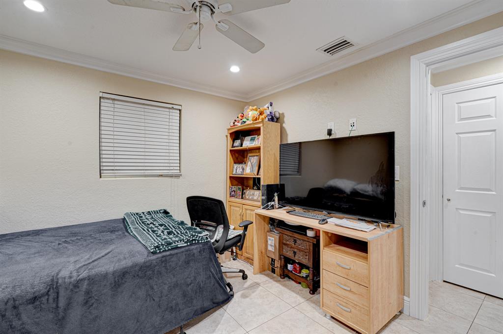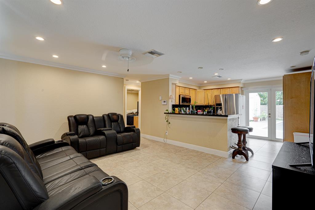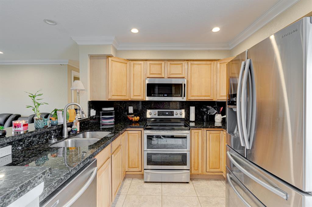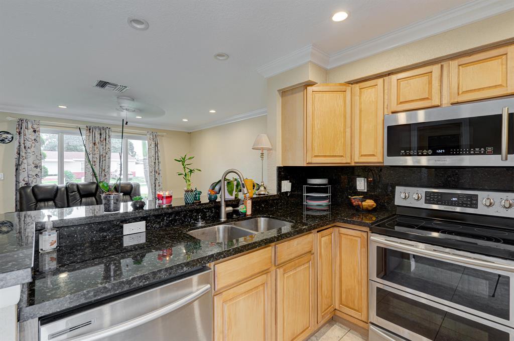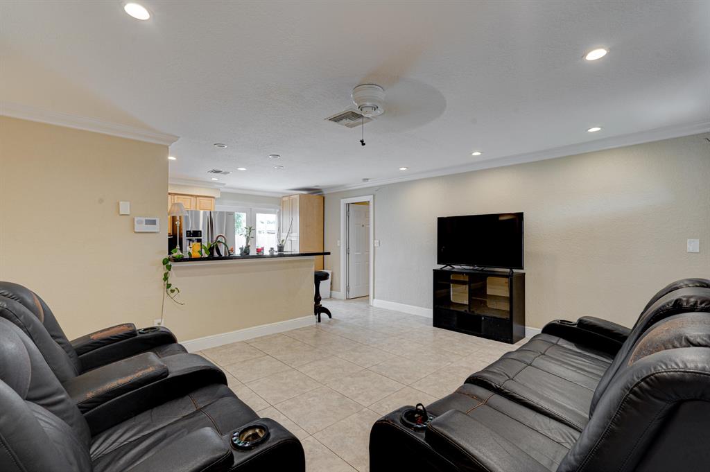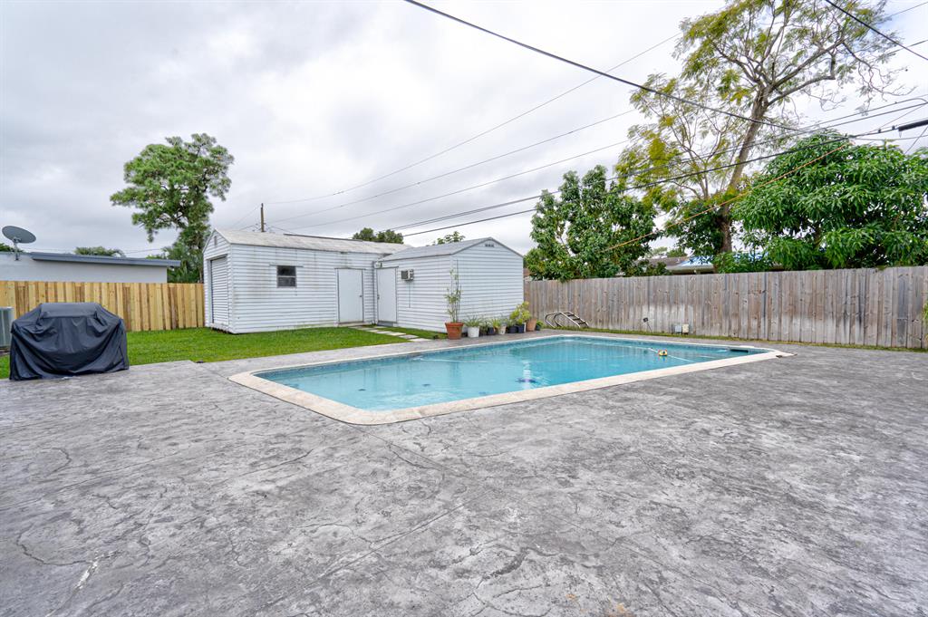 This well-appointed 3 bedroom, 1 bath home offers an open floorplan, impact windows, accordion shutters, neutral tile, crown molding, and high hat lighting. The beautifully renovated kitchen features high-end Samsung stainless steel appliances including a double oven, granite countertops, and oak cabinetry. The private master (10x21) boasts an oversized walk-in closet with a custom organizer and a door to the backyard. The backyard features a sparkling pool with a Diamond Brite warranty, 2 sheds with AC (12x24 & 10x14), and a third shed housing energy efficient front-load Samsung washer & dryer. Just a few of many notable features include a 15,000 watt generator with direct line hook-up, a tankless water heater, upgraded 200-Amp GE electrical panel, and an automatic sprinkler system.