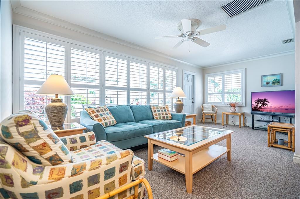 Picture perfect! Renovated 2/2 with garage and open tiled front porch.Immaculate scenic landscaping.Private backyard patio and custom outdoor lighting will wow you! Concrete double wide driveway. Spotless interior offers bright kitchen w/quartz countertops backsplash,&hardwood floor. Open living area extends to combination dining/Florida w/patio view& access.Great entertaining space. Master bath features granite countertop vanity, custom shower w/frameless glass door. Plus crown molding, plantation shutters & blinds, 200amp electrical, tankless water heater, newer A/C hurricane windows. NO LAND LEASE 55+ Community, Lots of amenities plus Water/Sewer and sprinkler system included in low monthly maintenance. 2021 Monthly association fee $232.00
