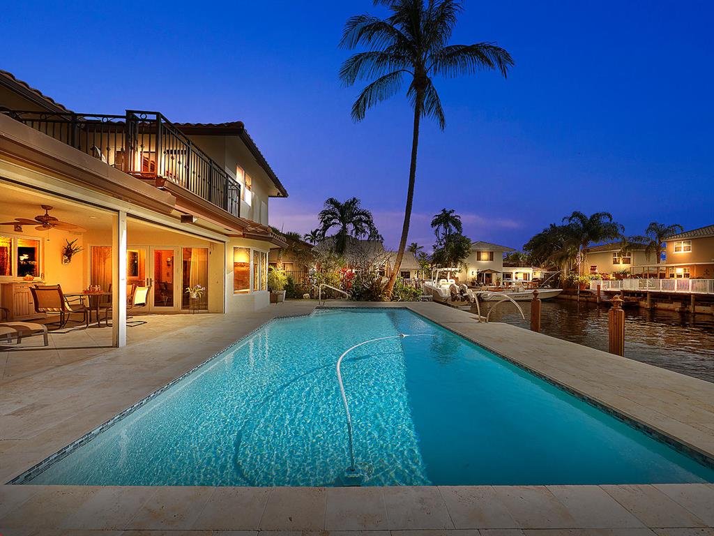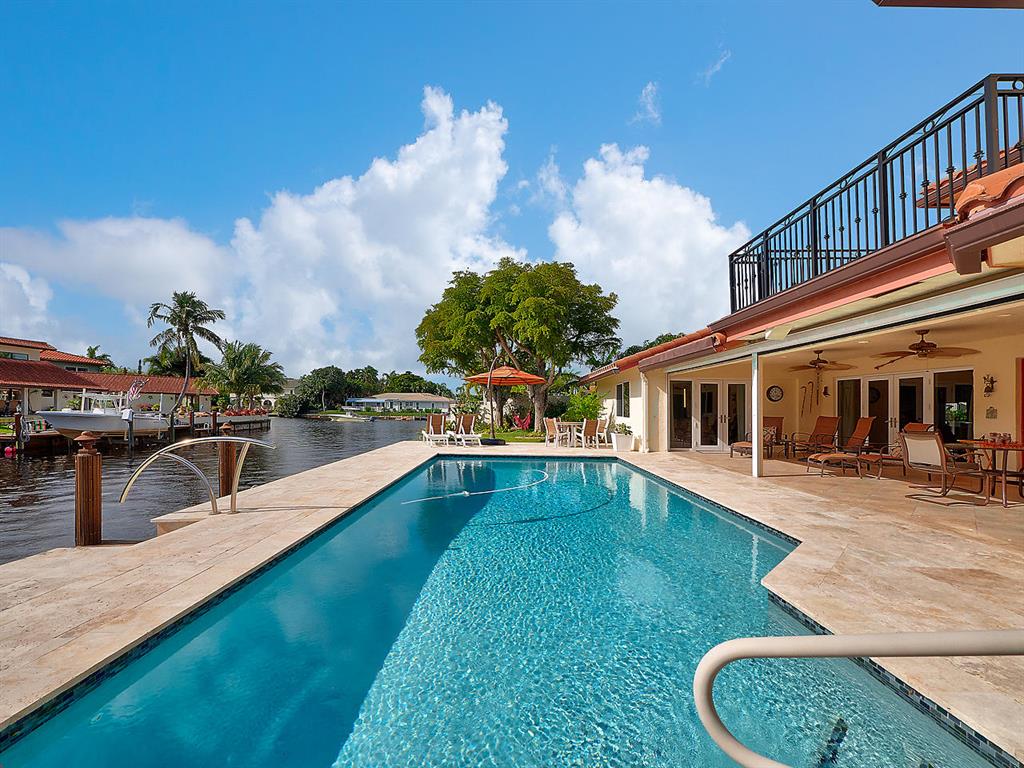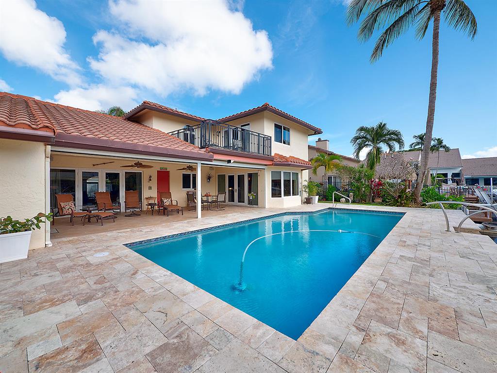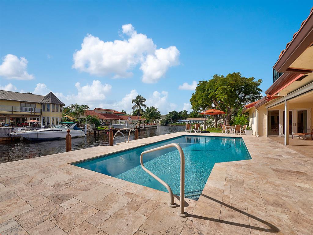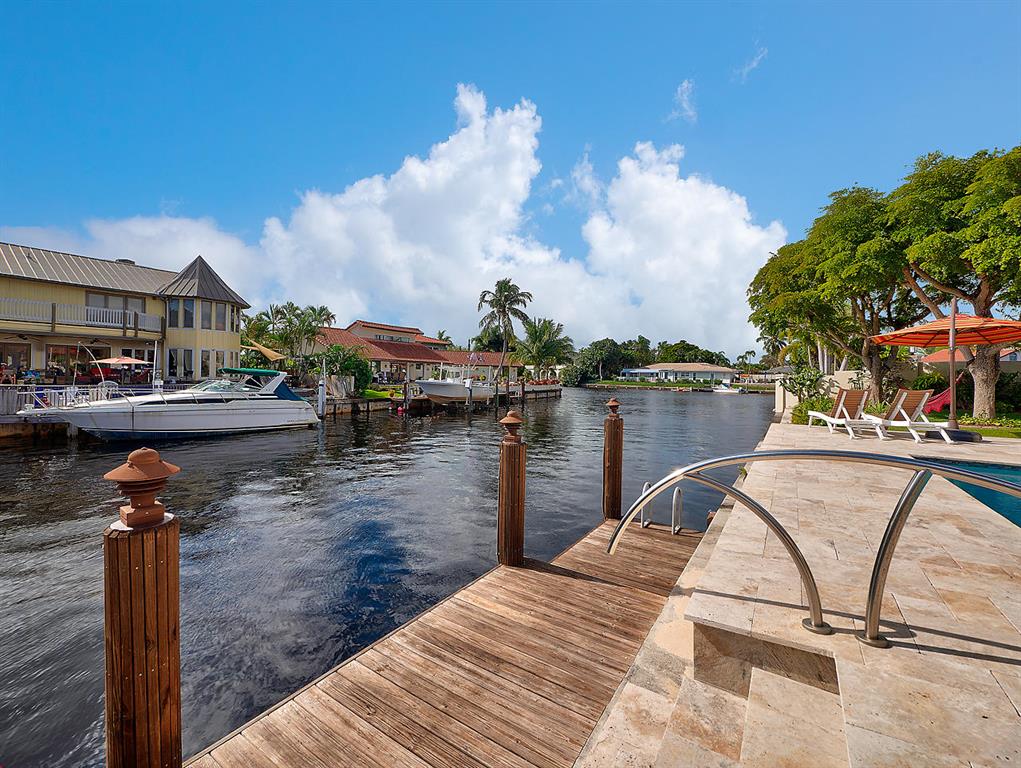 Escape to a scenic and spectacular Boca Raton waterfront home with views of breathtaking landscaping overlooking the water, all new dock & sea wall for a 45 ft boat, new heated pool with travertine decking and covered porch with electronic screening. The home's interior was completely updated in 2007 from the studs. The front foyer welcomes you to a nook viewing a garden then onto a volume high spacious living room viewing the covered porch, pool and water front. Two generous first floor bedrooms are connected by a luxurious bath with jacuzzi tub. Adjoining the living room is a formal dining room. Then you move onto the luxurious kitchen including custom cabinetry, many Wolf appliances with gas cooktop. The family room with matching cabinetry and a wine and beverage refrigerator is
