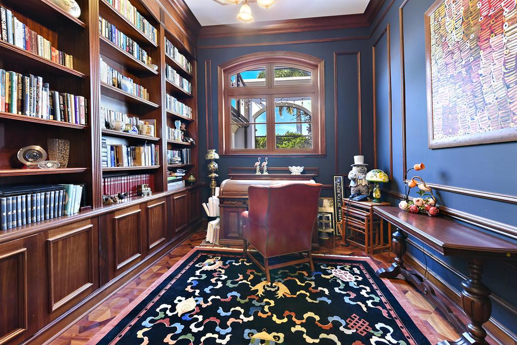 Luxurious double lot estate with more than 10,000 sq ft of living area, 7 large en suite bedrooms, 7 baths, 4 half baths, 3 garages, home theater, and library. Renovated in 2020 with meticulous attention to detail with the use of limestone, marble, porcelain, exotic parquet and hardwood Mahogany for various floors throughout this high end finished home. Fabulous modern chef's kitchen custom built 2020 with top of the line appliances including a 9ft professional hood. 14 ft center island gazes into huge temperature controlled wine cellar with 3000 bottle capacity. Large pantry and laundry room with additional subzero fridge. Three spacious screened porches and 2 wrap around balconies. 4 fireplaces. Marble pool deck surrounds 61 ft pool & spa overlooking golf view.