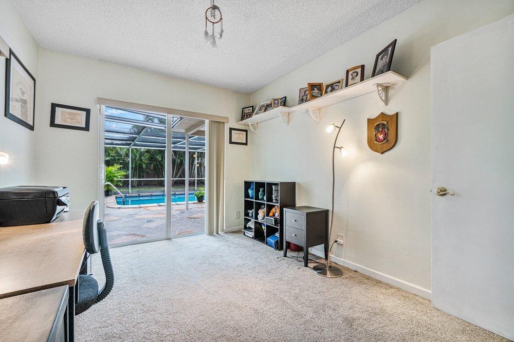 Outstanding 3 bedroom, 2 bathroom pool home in Boca Raton Square! This home is split bedroom plan that is open, airy, light, and bright. There is beautiful laminate wood plank floors in the living room and kitchen. The kitchen is very large and has tiled counter tops, tiled backsplash with a good sized breakfast nook, and a passthrough window to the gorgeous patio area. The second full bathroom has a tub/shower and has cabana bath access. The outdoor pool and screened patio area is fantastic with a large covered area, patio floor was res-stoned, and completely fenced in backyard that is very private. There are many upgrades and updates which include full HURRICANE protection. Most windows are HURRICANE impact windows, and a few set of newer sliders on the back patio have HURRICANE