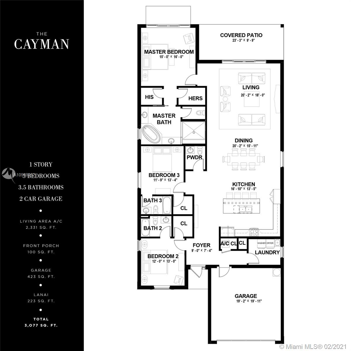 CAYMAN Floor plan 1-story, 3 bedroom, 3.5 bathrooms, 2,331 SF of living area & 3,077 total SF. 2-car garage. GE washer & dryer included. Homeowners receive a complimentary 3-yr resort access pass to 18-hole Signature Jack Nicklaus Golf Course, clubhouse with indoor/outdoor dining, Pro Shop, 6 HarTru tennis courts and access to future hotel resort amenities. This new construction home could be personalized with options. Price indicated is base price plus any lot premium & includes $77,000 IN DESIGNER UPGRADES. Home is under construction & expected completion is Dec/Jan 2022. Tour our Homes every Saturday and Sunday from 11am to 4pm! 4 designer decorated models, Golf Club and Course also available for touring!