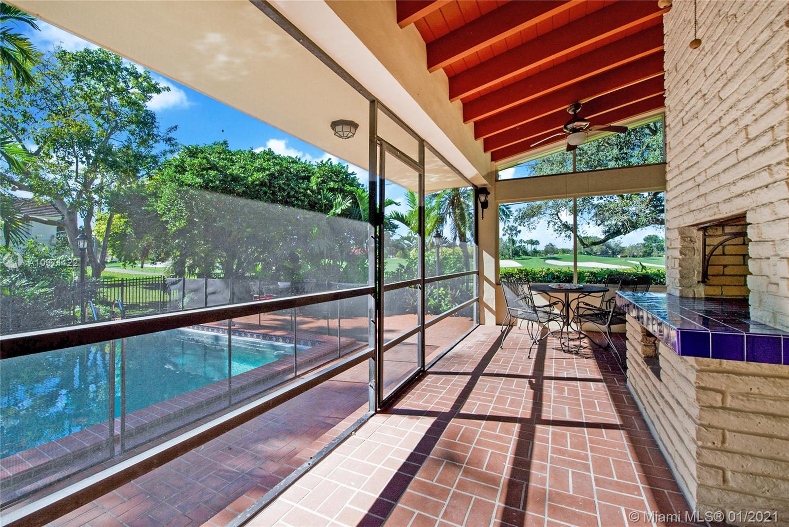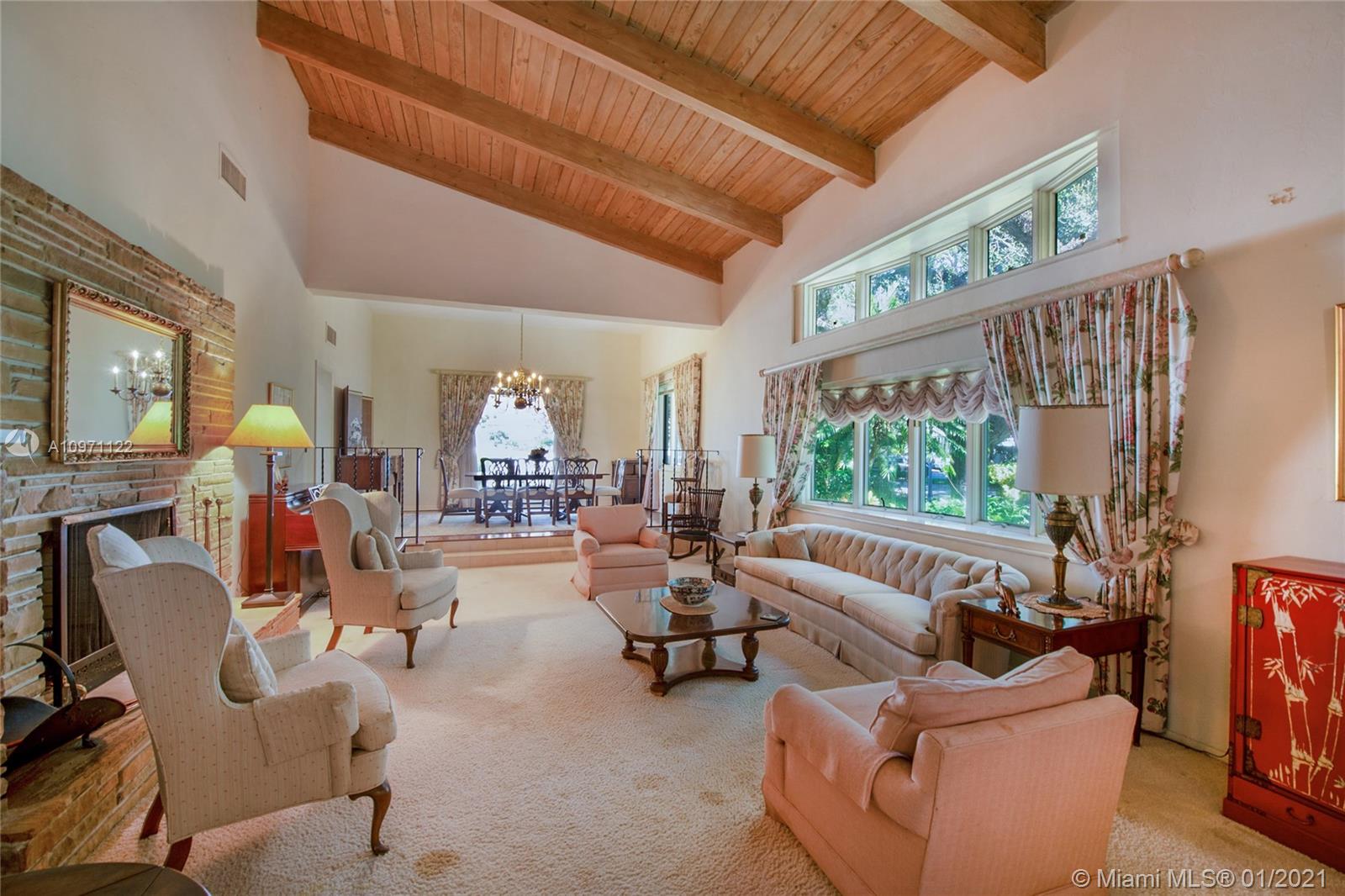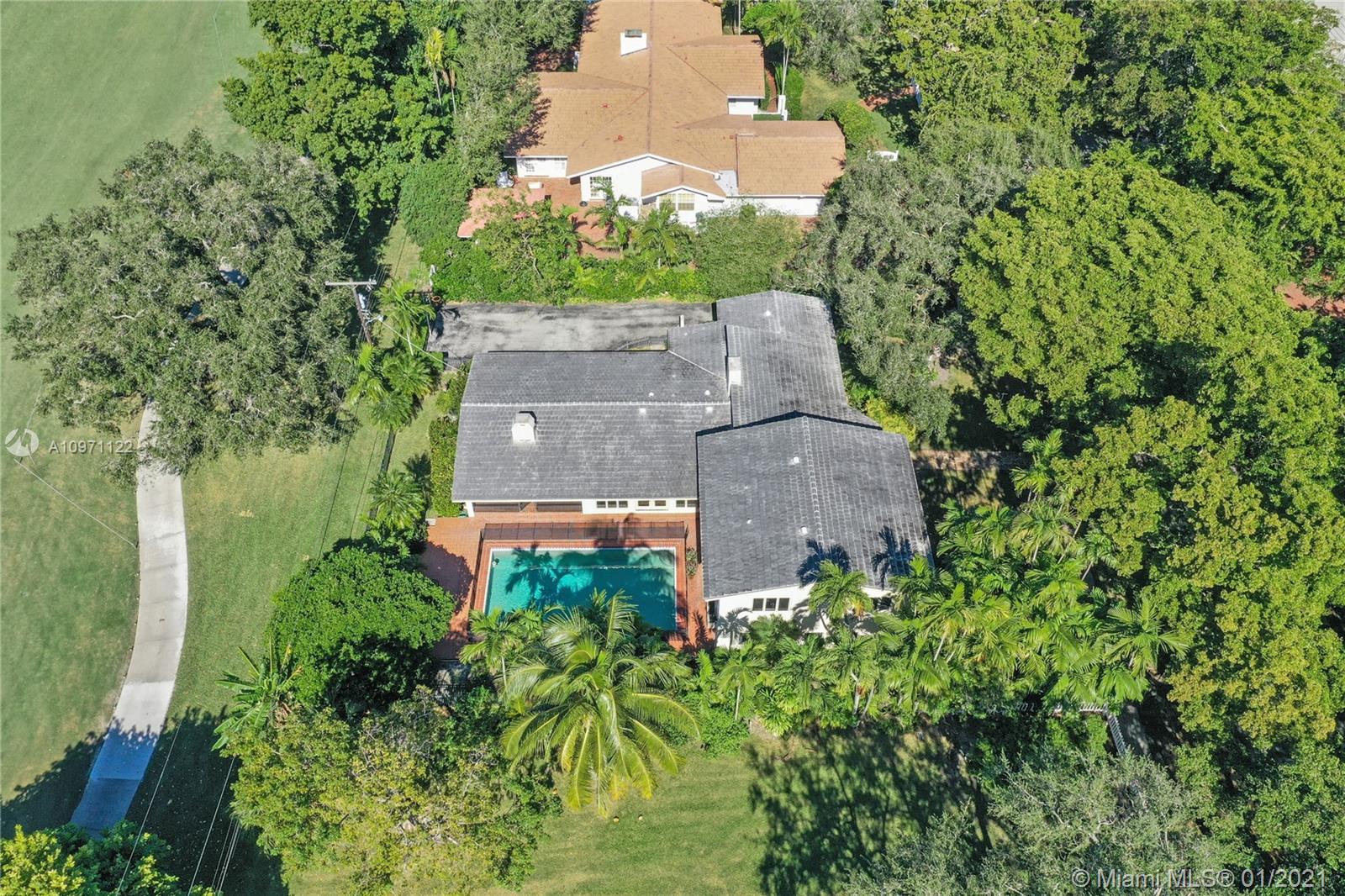 Rare opportunity to live on beautiful Santa Maria, one of Coral Gables nicest streets! Nestled in the middle of the Riviera Country Club Golf Course, this spacious 5/3½, pool home features high ceilings, large, bright rooms and fabulous views throughout. Family room leads to a screened-in porch with fireplace, then to the patio with lush foliage and huge pool. Formal dining adjoins generous living room with soaring ceiling and fireplace, easily accommodating large parties. 3 downstairs bedrooms, one custom-fitted as a library/office, ideal to work from home. White kitchen with tons of storage opens to family room. Enormous 2-car garage, mud and laundry rooms for extra storage. Looking for gracious living in a quiet location yet close to everything? This is the home for you! Will go fast!