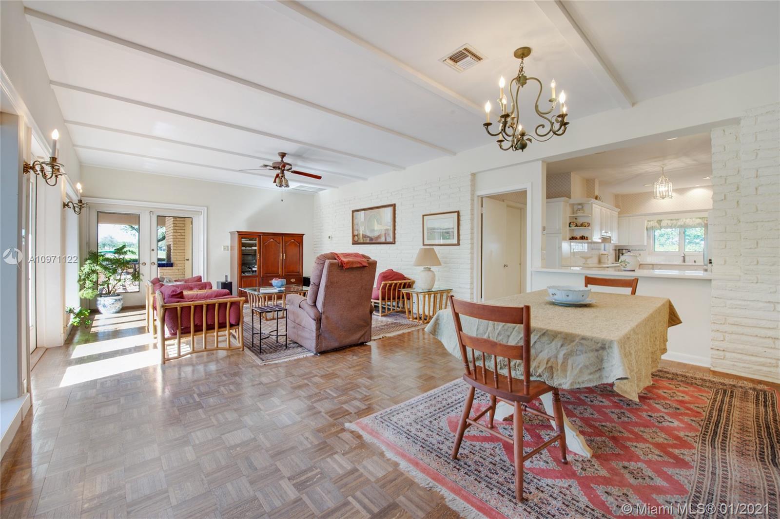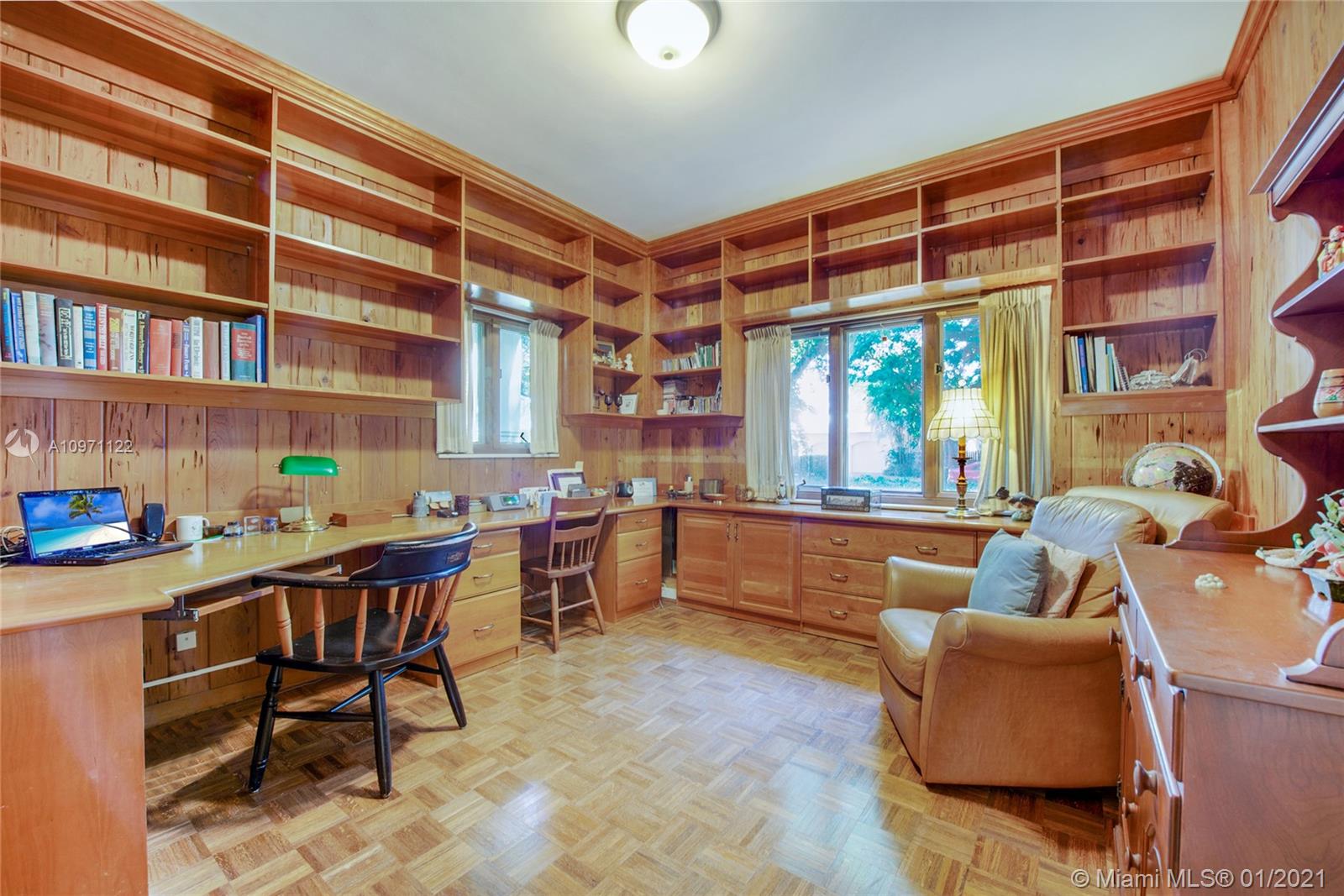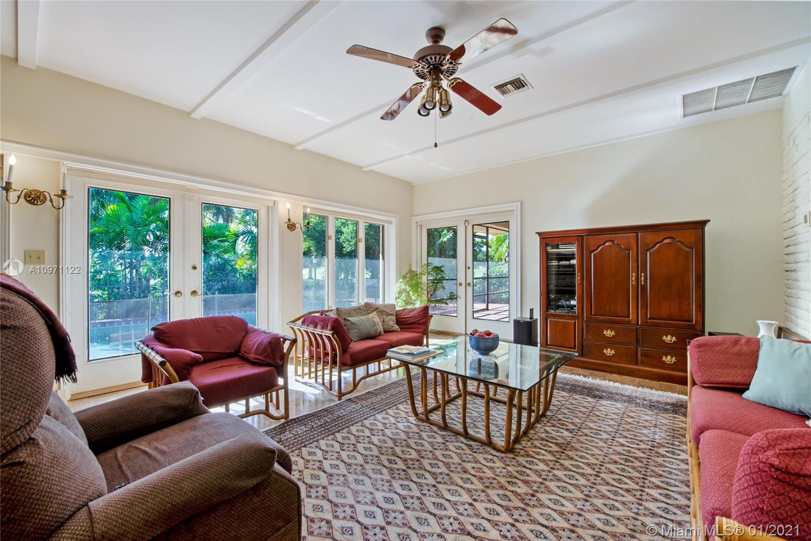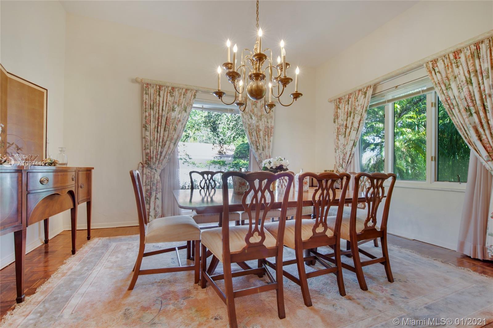 Rare opportunity to live on beautiful Santa Maria, one of Coral Gables nicest streets! Nestled in the middle of the Riviera Country Club Golf Course, this spacious 5/3½, pool home features high ceilings, large, bright rooms and fabulous views throughout. Family room leads to a screened-in porch with fireplace, then to the patio with lush foliage and huge pool. Formal dining adjoins generous living room with soaring ceiling and fireplace, easily accommodating large parties. 3 downstairs bedrooms, one custom-fitted as a library/office, ideal to work from home. White kitchen with tons of storage opens to family room. Enormous 2-car garage, mud and laundry rooms for extra storage. Looking for gracious living in a quiet location yet close to everything? This is the home for you! Will go fast!