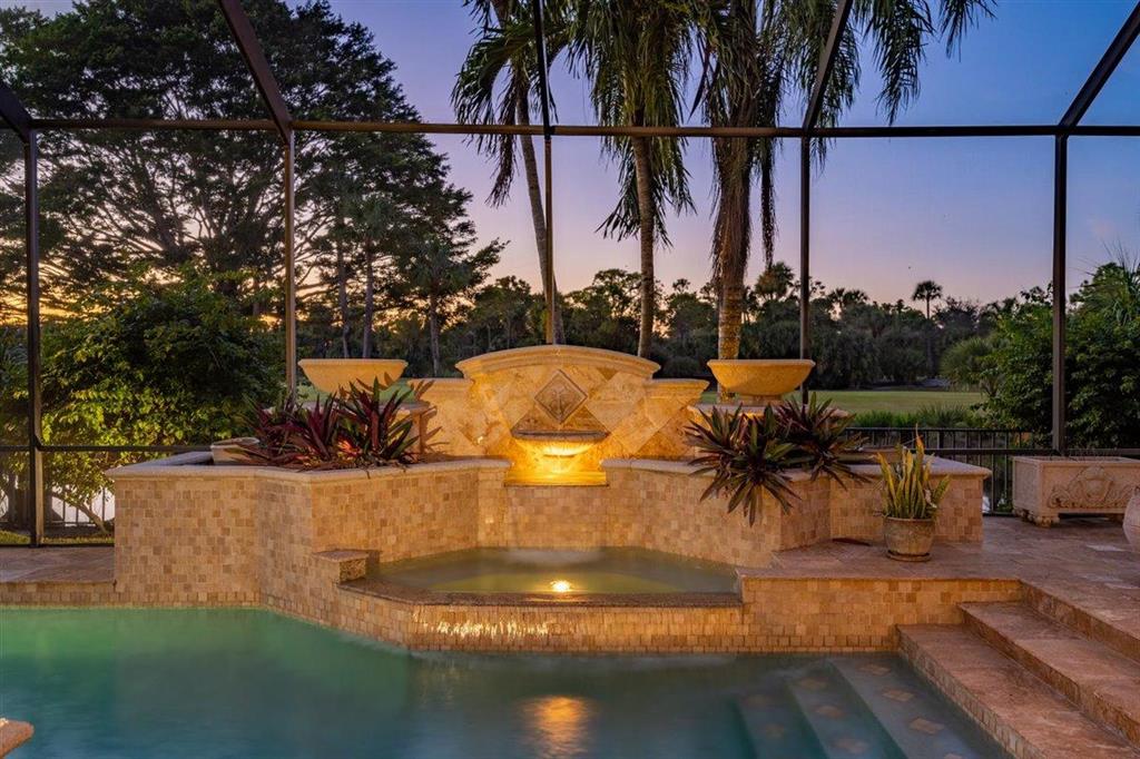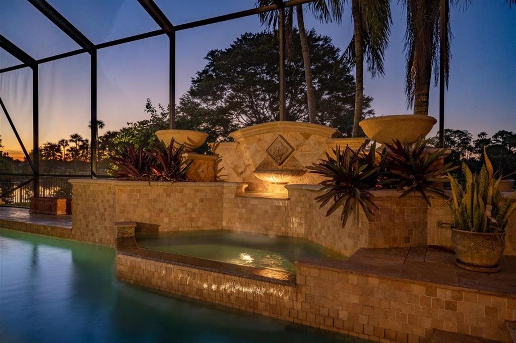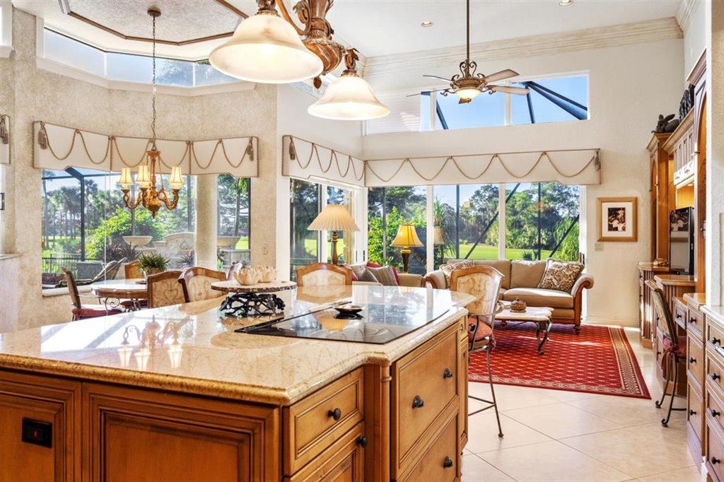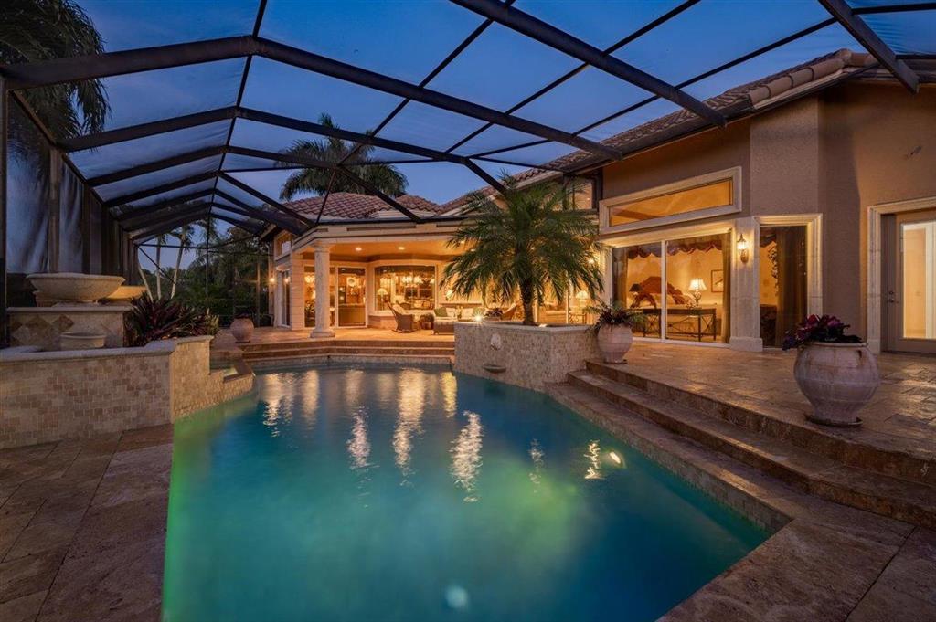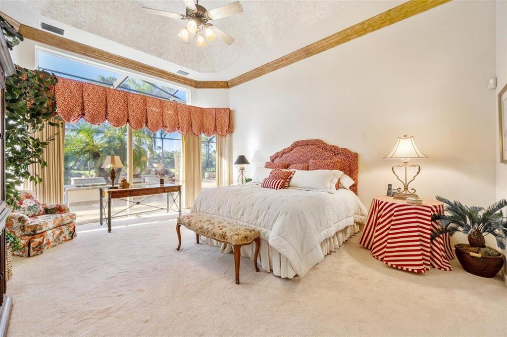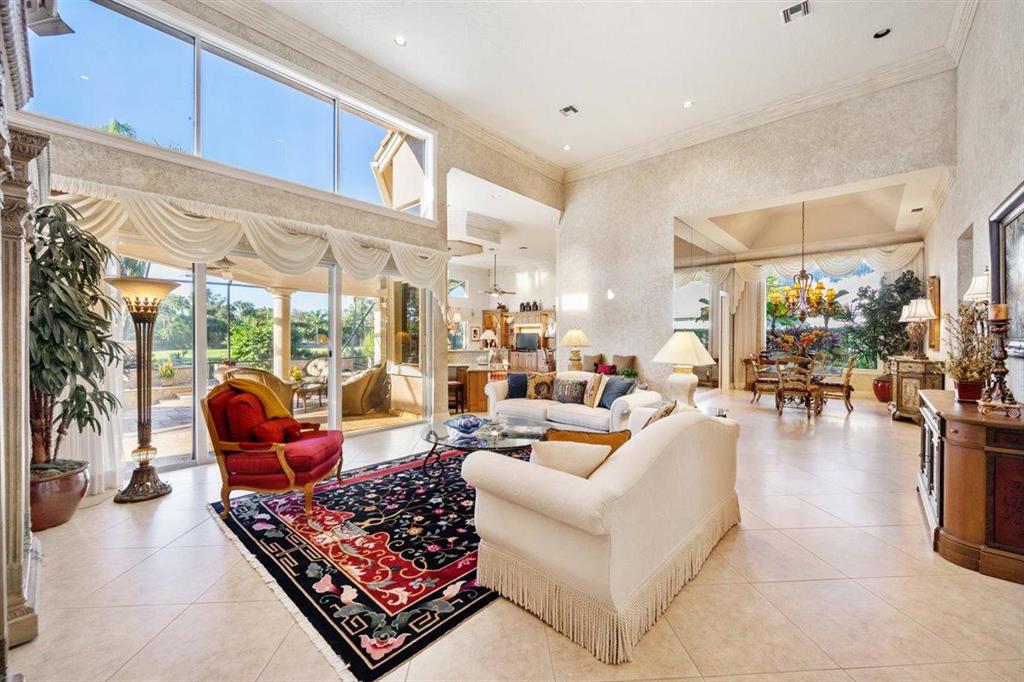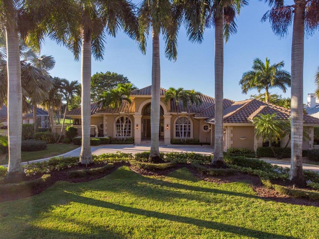 One of a kind water and golf views along Breakers Rees Jones course in Breakers West! This stately custom home with circular driveway and lined with royal palms offers 3 Bedrooms + Home Office with 3,641 AC living area. Features high ceilings with crown molding, porcelain tile floors, and open floor plan designed for enjoying indoor and outdoor living. The chef's kitchen is a stand-out for its large island with bar seating, GE Monogram appliances as well as custom fitted cabinets with pull-out drawers and specialty features. The Kitchen opens to the Family Room, Breakfast area and wet bar with sink & under-counter refrig. The handsome Home Office offers built-in bookcases/drawers and desk area--ideal for working from home and also feature arched window with plantation shutters.