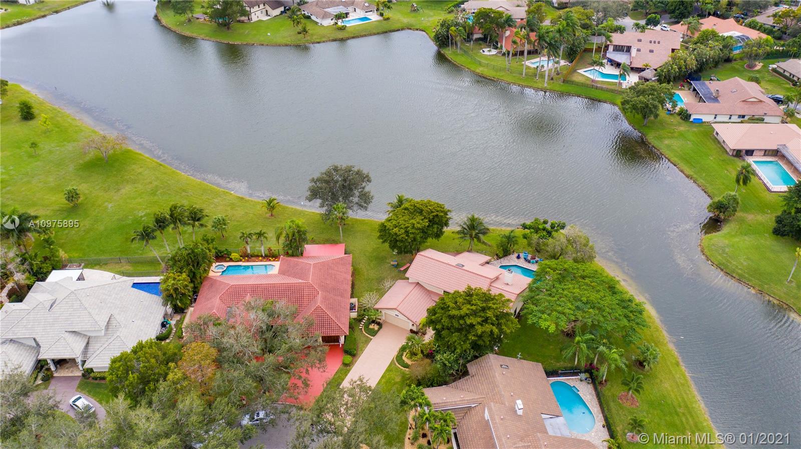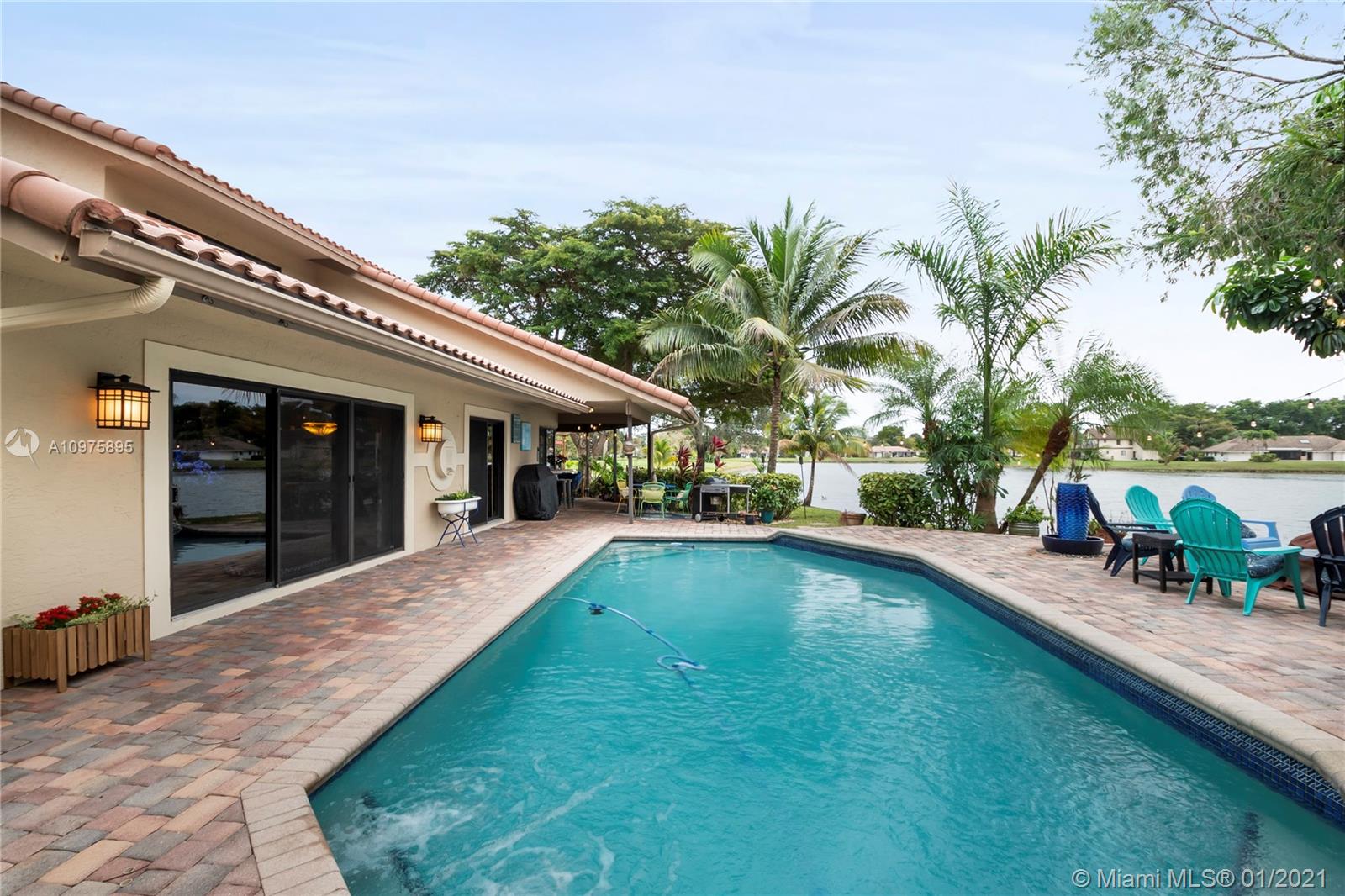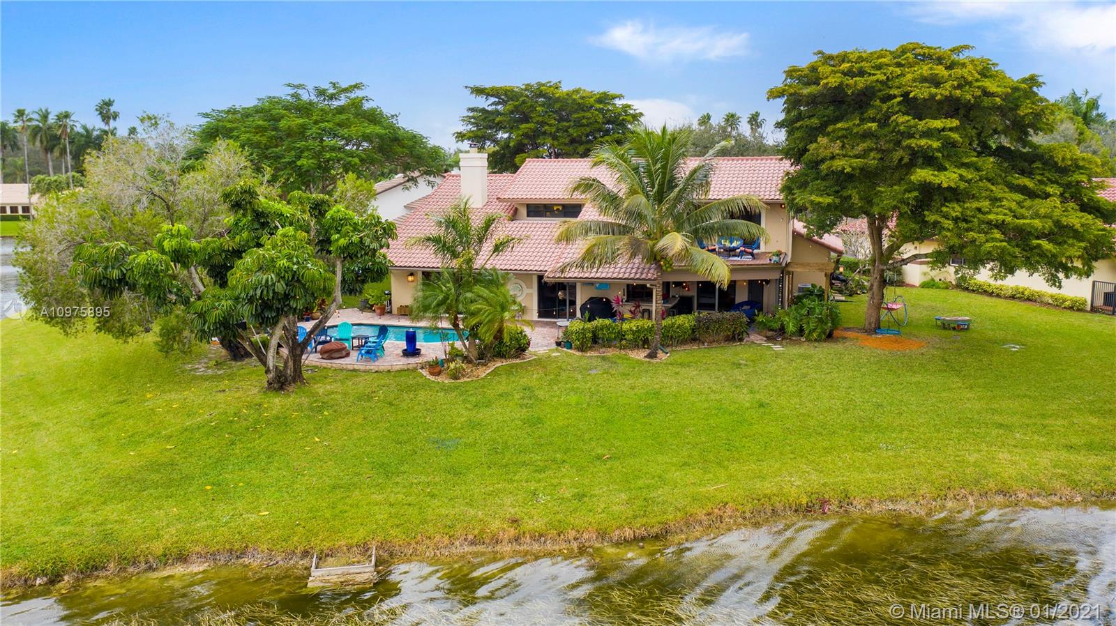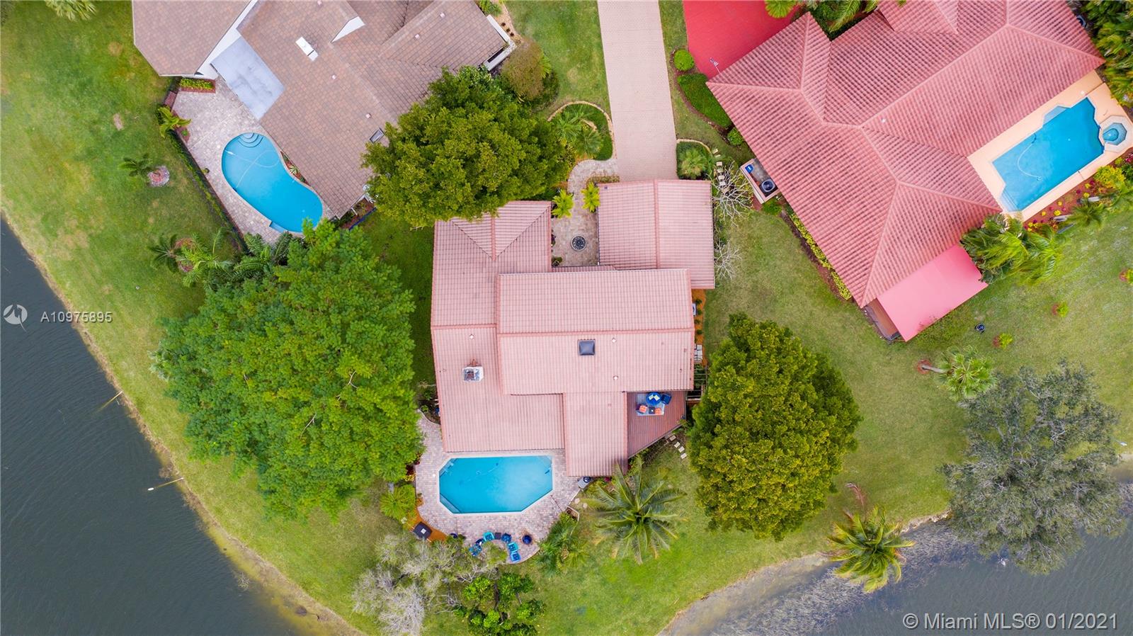 Exquisite 2-story lakefront pool home nestled on a serene cul-de-sac lot with stunning water and sunset views. This rare find boasts marble floors, double-sided stone fireplace, high ceilings, custom kitchen, upgraded baths, impact windows and doors, over-sized washer & dryer and 2-car garage. Enormous master suite encompassing the entire second floor features a private terrace overlooking the lake. Additional rooms include great kitchen/family room and formal living/dining. Spectacular tropical backyard with inground pool and lush foliage is perfect for family fun and entertaining guests. Vivint home security system w/ electric keypad-coded front door lock, ring camera/doorbell and ring camera on driveway. Truly a gem located in the highly desirable community of Glen Oaks.