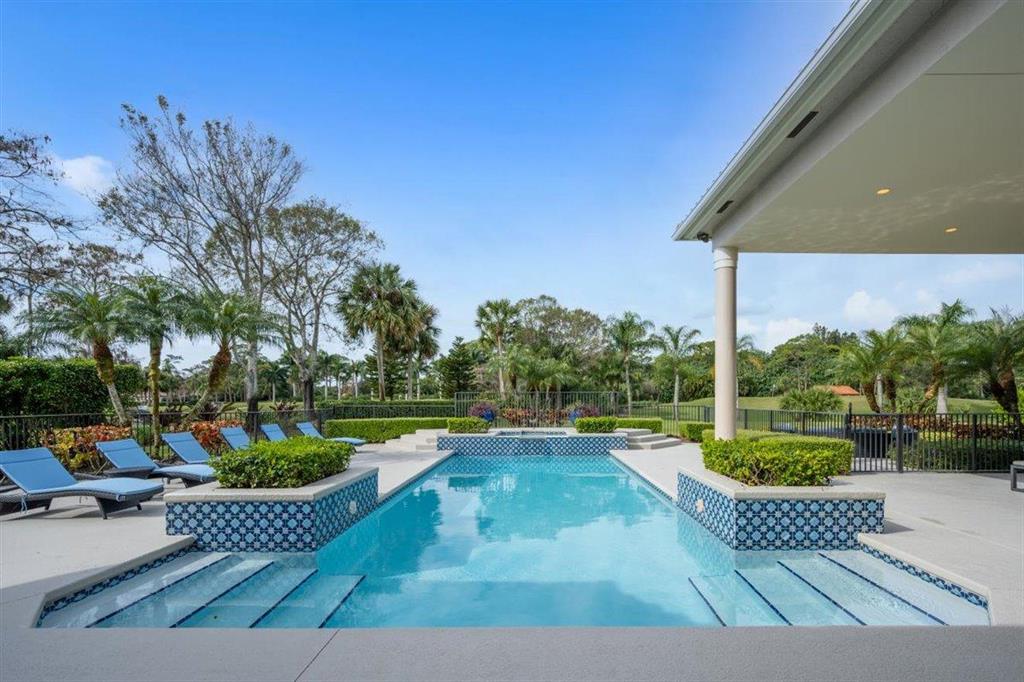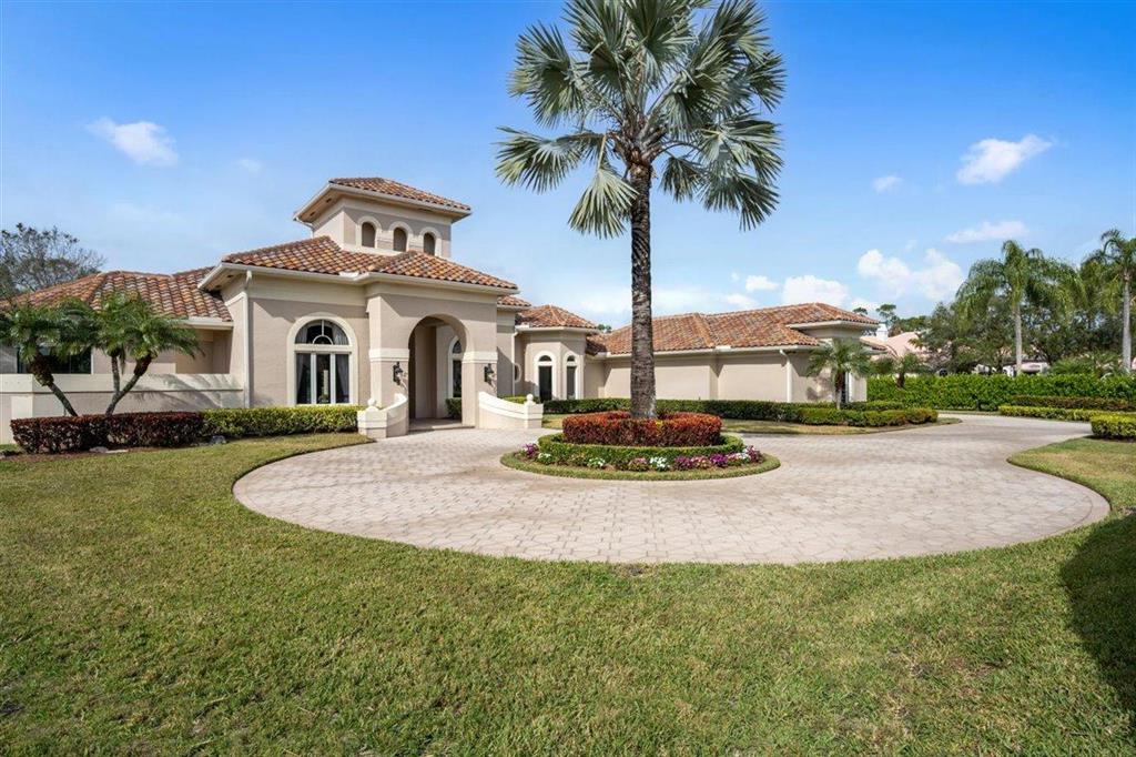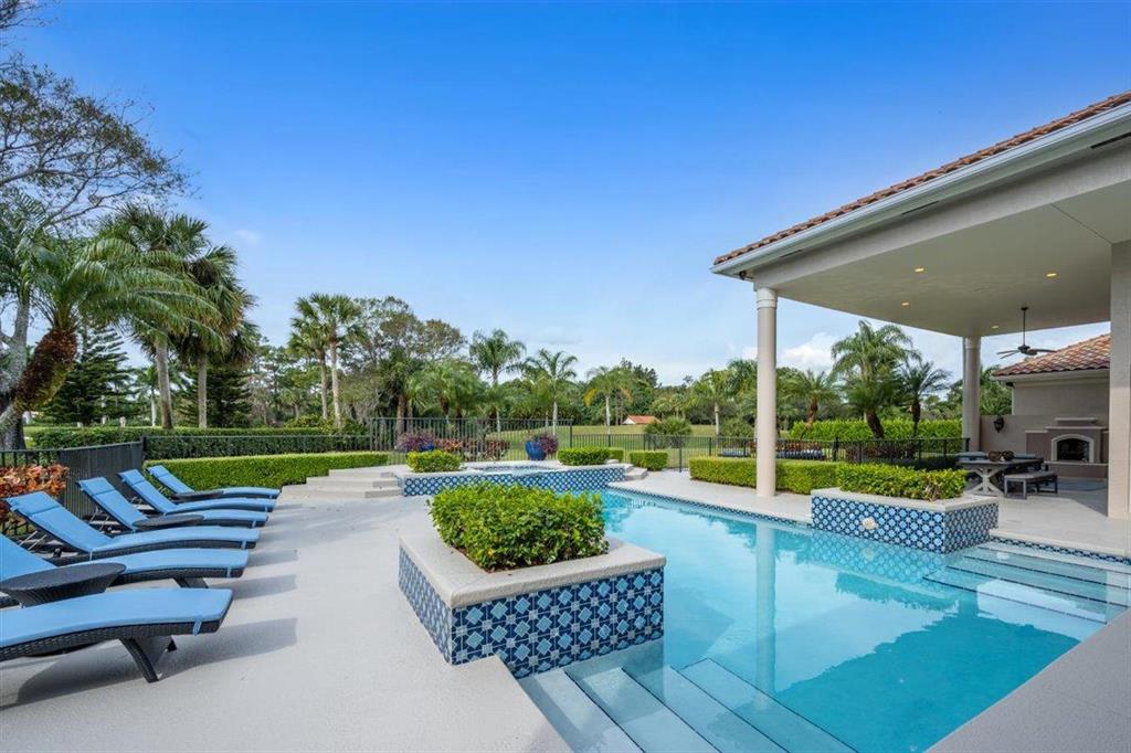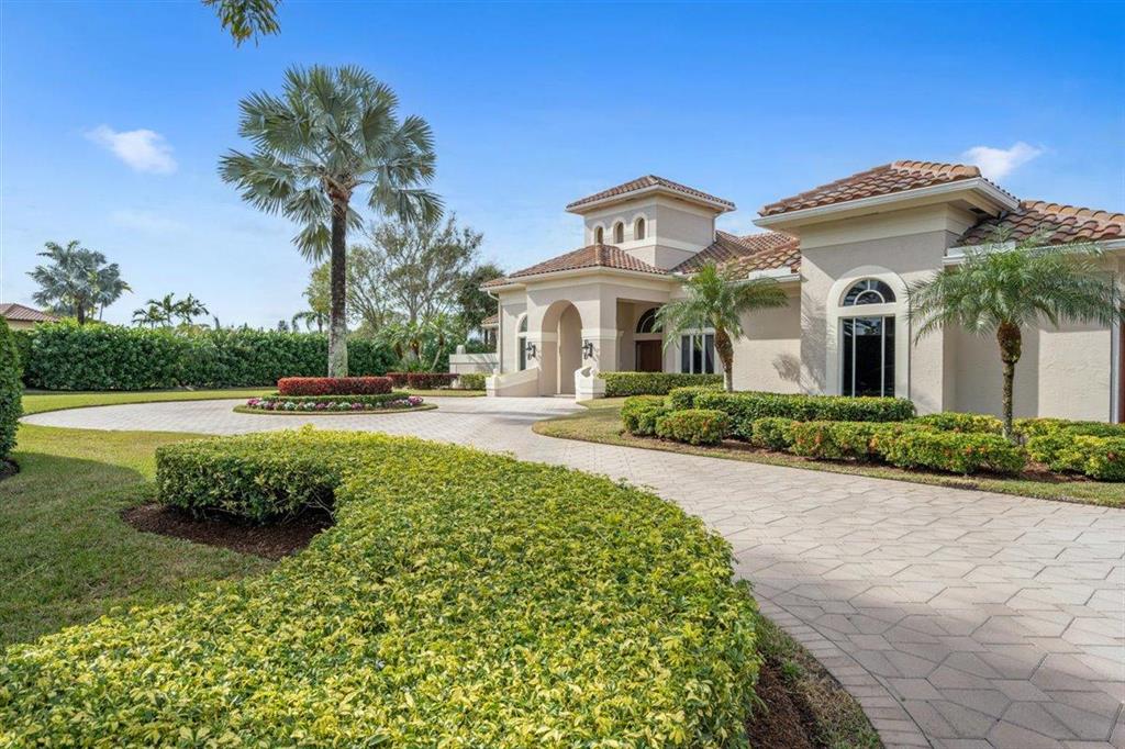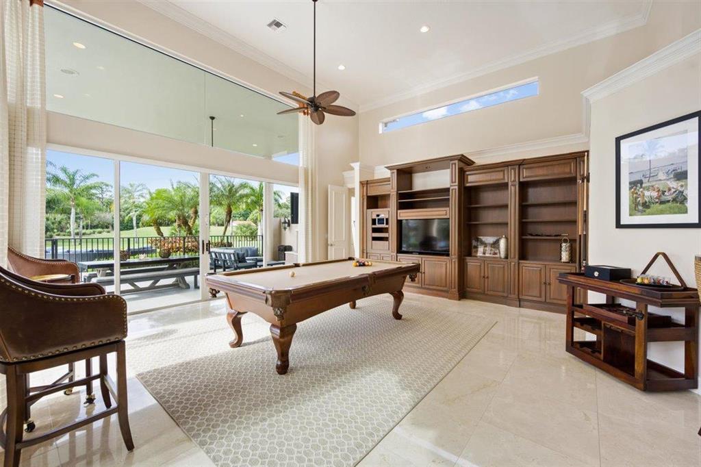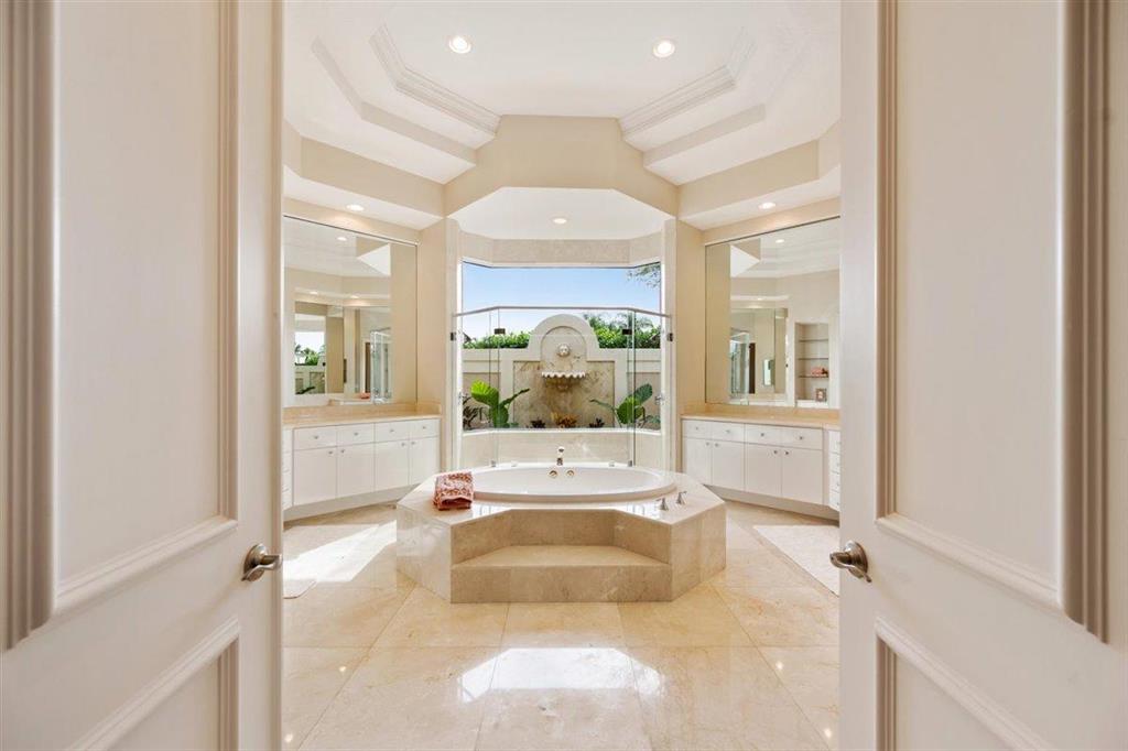 Enjoy Palm Beach County's best country club living at Breakers West in central West Palm Beach. Impressive estate situated on almost .72 acre corner lot on private gated street nestled along 4th green of Breakers Rees Jones course. Stately circular driveway welcomes you to this gorgeous 5BR + Home Office, 6 BA, 3-Car + golf cart Garage home with 5,078 A/C Liv Area. Popular open floor plan with tasteful coffered ceilings, crown molding throughout, & marble flooring provide the perfect backdrop for any decor. Great Room with 3 set of doors w/transom windows above opens to spacious pool/patio area. Handsome library features floor to ceiling built-in bookcase in warm wood tones and has adjoining Full Bath. Elegant Master Suite features lg marble master bath with His & Her vanities,