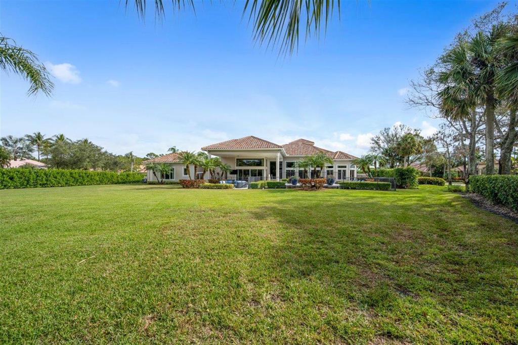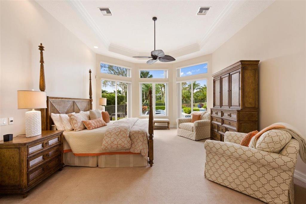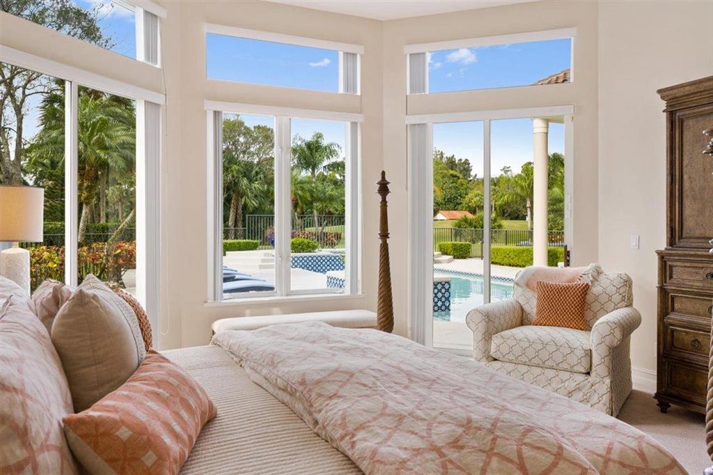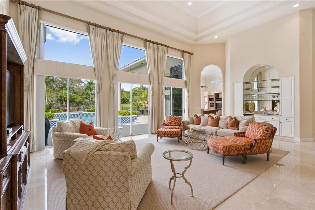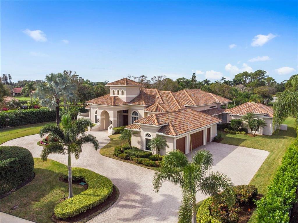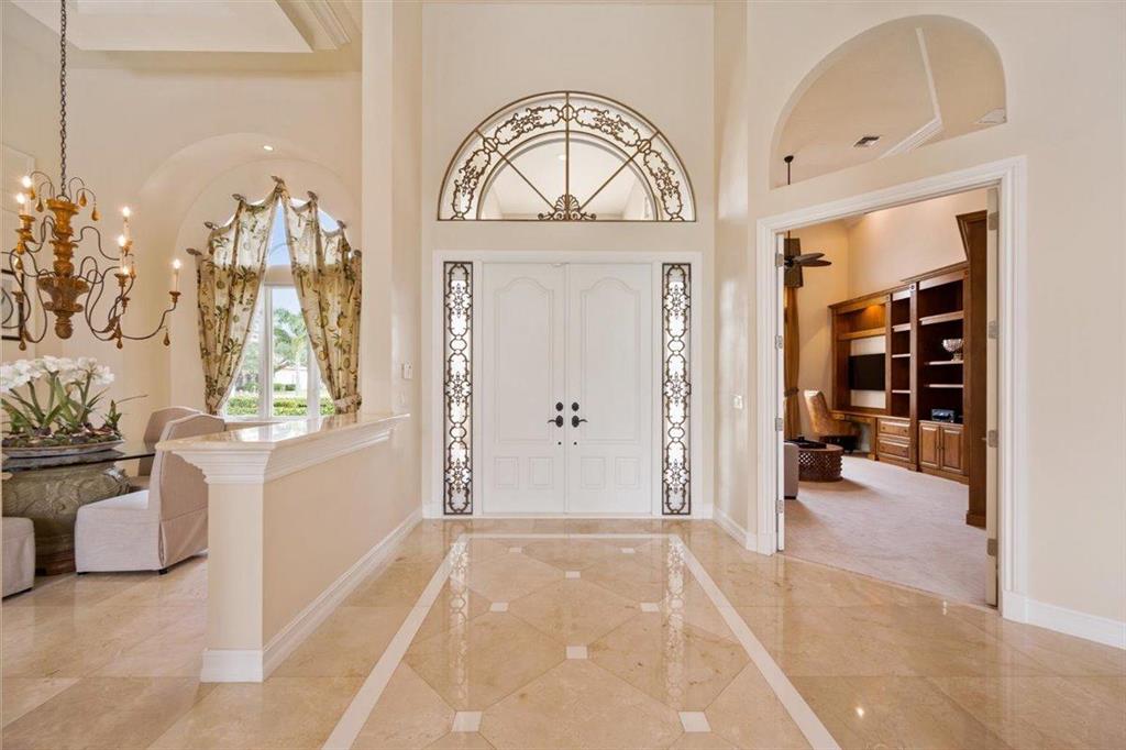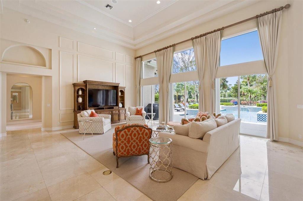 Enjoy Palm Beach County's best country club living at Breakers West in central West Palm Beach. Impressive estate situated on almost .72 acre corner lot on private gated street nestled along 4th green of Breakers Rees Jones course. Stately circular driveway welcomes you to this gorgeous 5BR + Home Office, 6 BA, 3-Car + golf cart Garage home with 5,078 A/C Liv Area. Popular open floor plan with tasteful coffered ceilings, crown molding throughout, & marble flooring provide the perfect backdrop for any decor. Great Room with 3 set of doors w/transom windows above opens to spacious pool/patio area. Handsome library features floor to ceiling built-in bookcase in warm wood tones and has adjoining Full Bath. Elegant Master Suite features lg marble master bath with His & Her vanities,