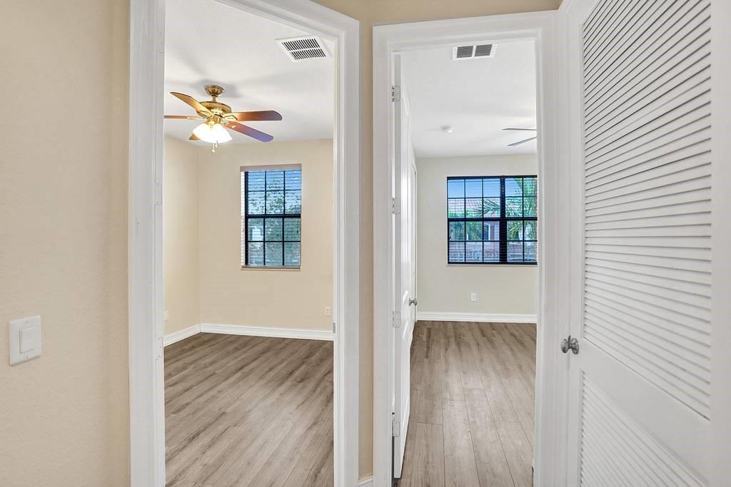 Redwood model 3 bedroom, 2.5 bath and 1 car garage. Lowest HOA townhome. Walk/Bike to park and A rated Elementary, Middle and High Schools. Beautiful laminate floors throughout, no carpet! All Brick Construction, Impact windows and Doors. One year rental restriction. Beautiful community with resort style pool.