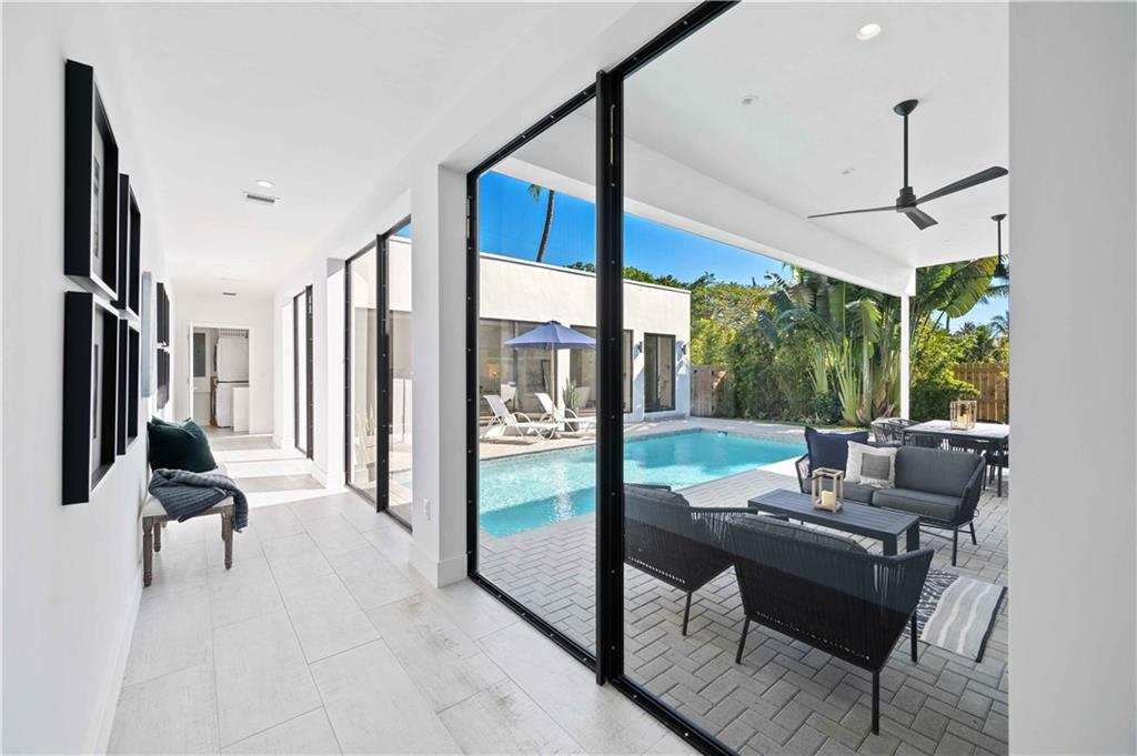 Distinct Miami Modern artfully designed surrounding a central courtyard pool making the pool into a centerpiece. Also a wide sundeck and generously sized covered terrace. All impact rated window walls and doors provide access from almost every room. Created for our casual Florida lifestyle this sun filled home transforms to a glowing glass box as evening sets. The two guest rooms each have generous closets, high ceilings and in-set lighting. The primary suite, with its own a/c features an integrated bath with a dramatic soaking tub and separate shower. The fully fenced rear yard offers an additional area away from the pool that is perfect for pets or a child's play area. Located in the heart of very desirable Poinsettia Heights, this home is convenient to shopping, dining parks & beaches.