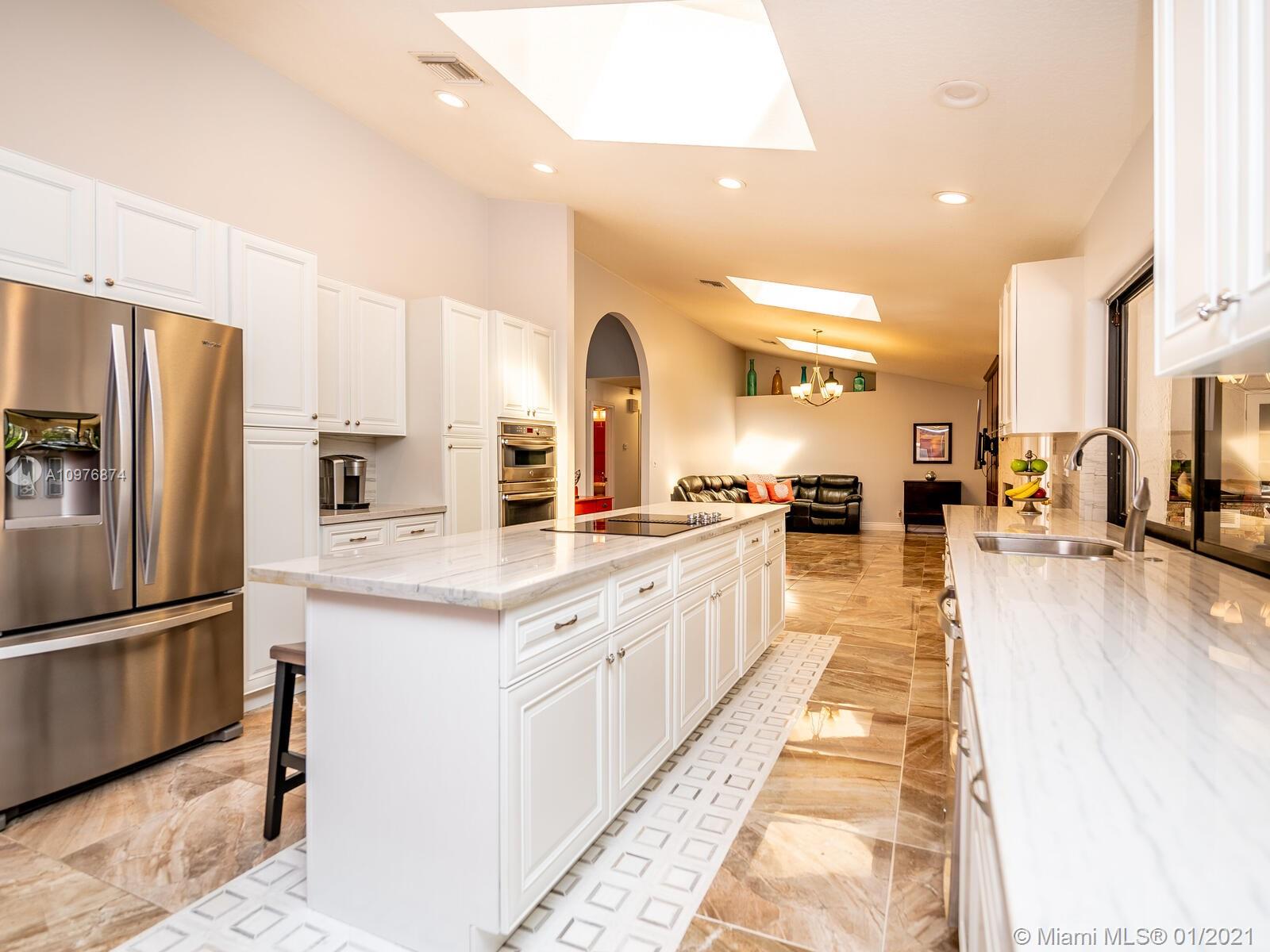 Spacious and bright, waterfront, triple-split 5 bedrooms/4.5 bathrooms, move-in ready and renovated home in Maplewood Isle, a 24/7 manned gated community with only 105 custom-made homes, tree-lined streets and winner of 2016 Mayor's Rose Award for most beautiful neighborhood. The home is located on a large lot in a cul-de-sac with a driveway that fits more than 6 cars. New kitchen and appliances, including a self-cleaning oven and a convection microwave oven. New built-in bar and a gorgeous coral rock fireplace. Renovated bathrooms. Vaulted ceilings and 3 impact-level skylights. Outdoor kitchen and covered back porch, overlooking the large fenced-in patio area and a saltwater pool. New front door and garage doors.
