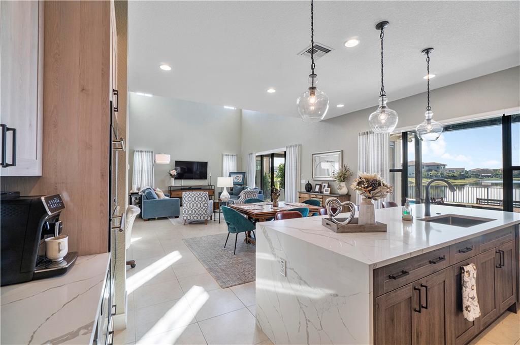 This beautiful Wilmington model is located on a prime water lot with over $80,000 in recent improvements including a new kitchen with custom Italian cabinets, quartz countertops, Carrera Marble backsplash, professional grade SS Viking appliances and a center island with pendant lighting! Other features include Electro Lux washer & gas dryer, upgraded carpeting & 20" tile flooring, a huge 19 x 12 loft, designer window treatments, built-in closets in all the bedrooms & a tandem 3-car garage! Enjoy the covered lanai with 3 phantom screens, a remote control louvered pergola, summer kitchen, gas heated salt water sport pool, tropical landscaping and stunning water views! This community offers amazing amenities with low HOA fees & great area schools! South Florida Living at its best!
