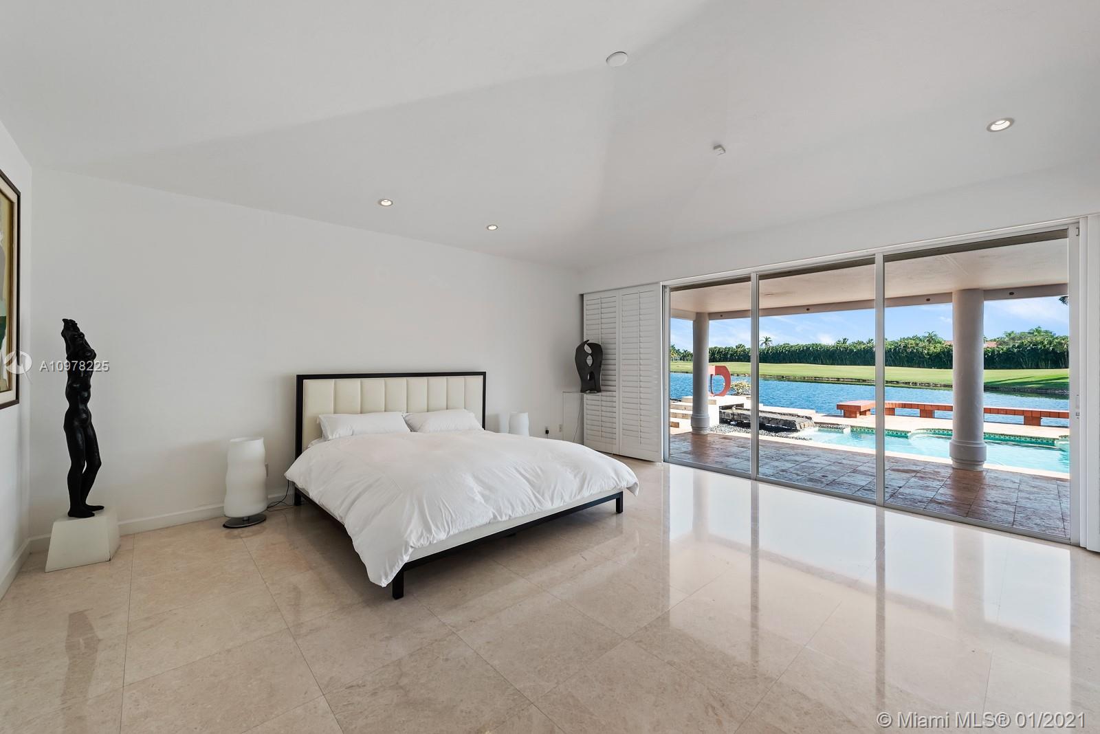 This Splendid Contemporary home is located in the exclusive guard-gated private community of Doral Estates. Generous 4 bedroom, 3 bath home has unobstructed views of both the lake and golf course. The spacious, Open Floor Plan with 14 ' ceilings and marble floors is an Entertainer's Dream! Gourmet kitchen features granite countertops and stainless steel appliances. Large Master Bedroom with en-suite whirlpool tub, separate shower and custom walk-in closets. Fabulous features include formal living & dining areas, complete wet bar, ice maker & wine cooler. Enjoy outdoor patio with heated pool, jacuzzi with waterfall features while you lookout onto the spectacular lake & golf course. Hurricane shutters & partial Impact Glass. 20KW, 150 gal. diesel whole house generator. Ready to move in!