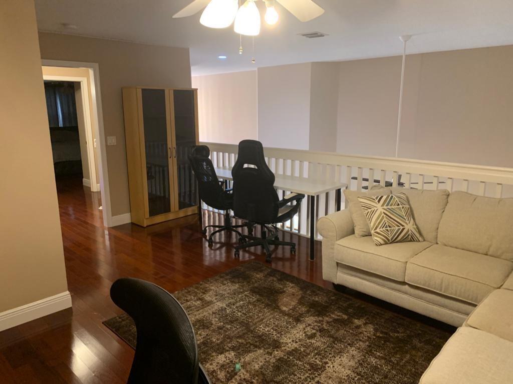 Beautiful water front two story spacious house in a desirable gated community. Master bedroom downstairs, two large walkin closets, bathroom equipped with shower and tub. Upstairs the home has hard wood floors throughout and a huge loft that can easily be converted into a 4th bedroom. Upgraded kitchen with stainless steel appliances, upgraded cabinets, granite counters. The home also consists of a formal dining room large enough to hold lots of people. Separate laundry room, 2 car garage with added storage. Back patio overlooking the lake is screened with nice views. Home has accordion shutters throughout. Top rated schools, short drive to major highways, shopping and restaurants.