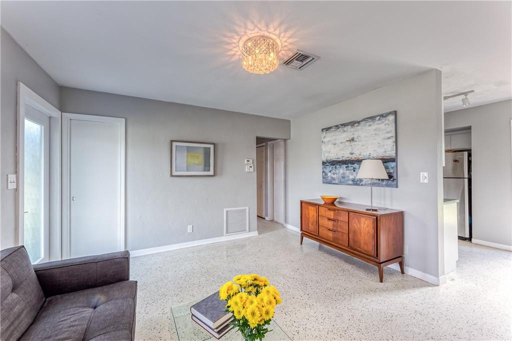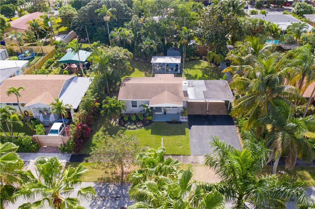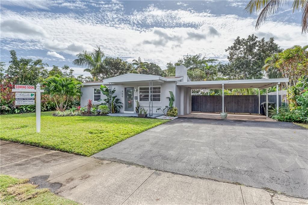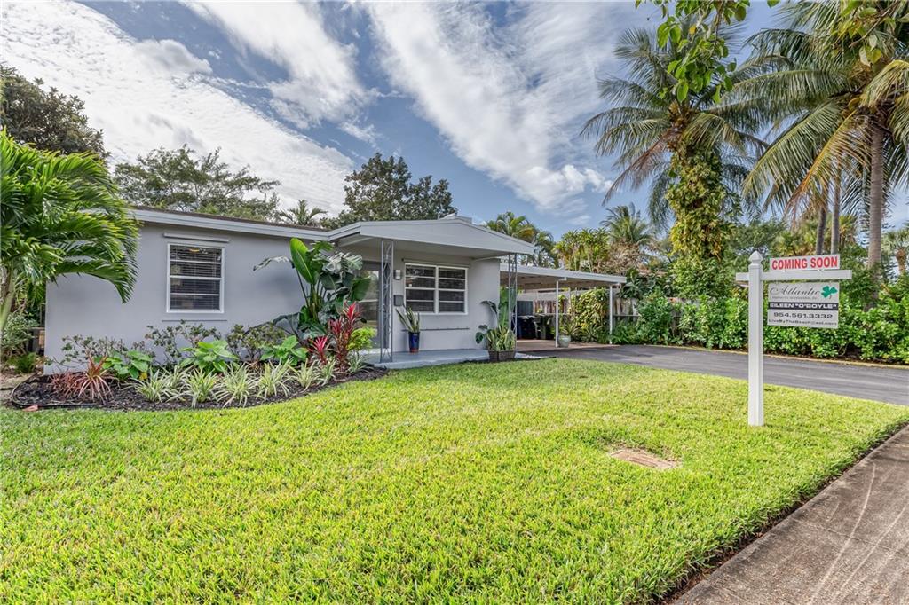 Meticulously maintained mid-century home on the best block of Lauderdale Park! Curb appeal plus! DOUBLE Carport! HUGE 8250 sq ft lot! The options to expand are endless, even adding a giant pool! Or just enjoy the comfortable floor plan, the bright sparkly kitchen updated with Shaker Cabinetry, SS Appliances, task lighting & gorgeous granite! Step thru the French Door to a lushly landscaped private tropical sanctuary for chilling or entertaining under an oversized 21X23 ft covered patio. Yes, the wood burning fireplace is real! Yes, the rain glass front door is impact! And yes, you couldn't afford polished white terrazzo floors like these! This handsome home has all the mid-century charm with today's modern accents & yet located 2 mins to Wilton Dr, 5 to downtown & 10 to the beach!