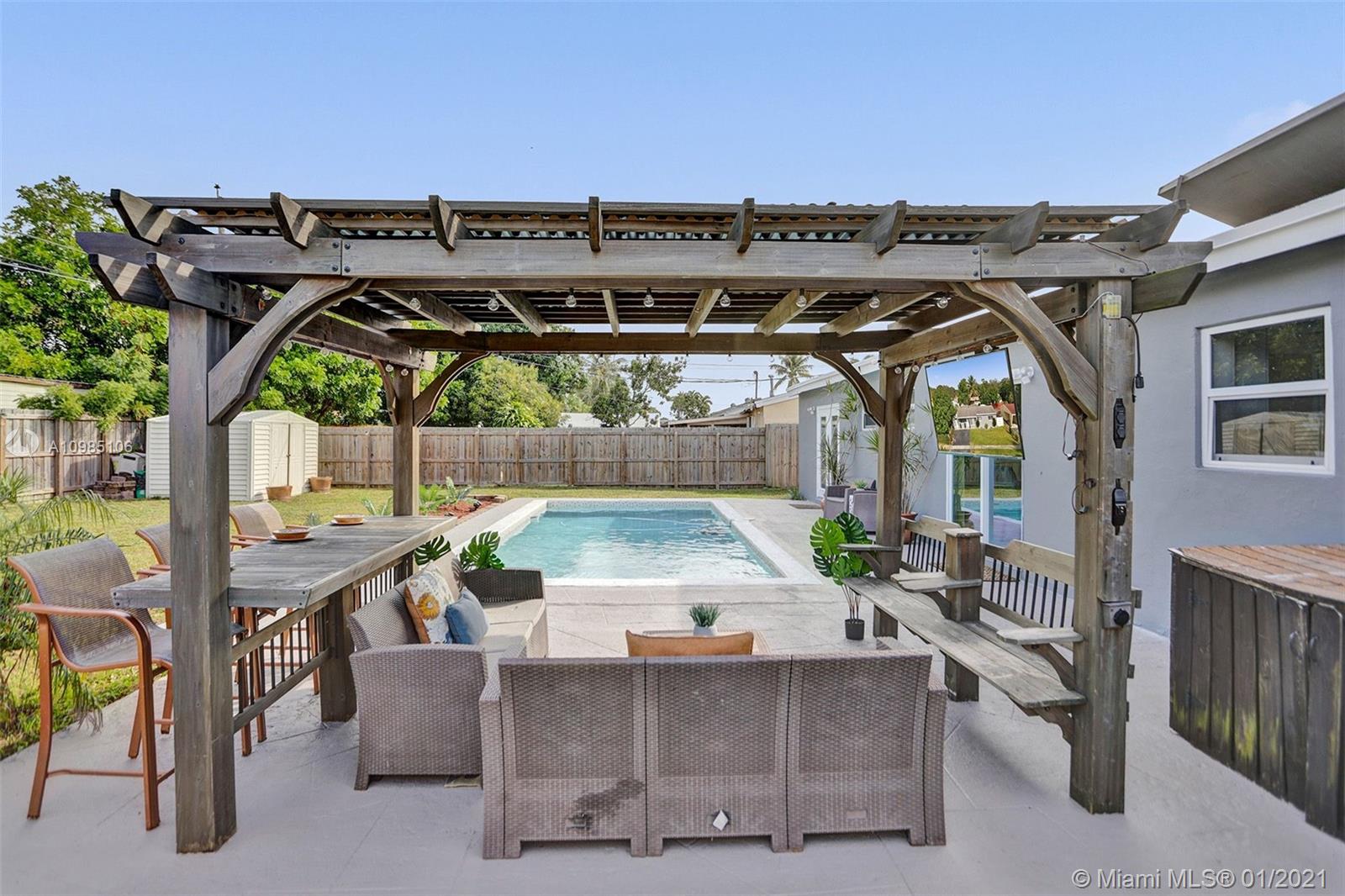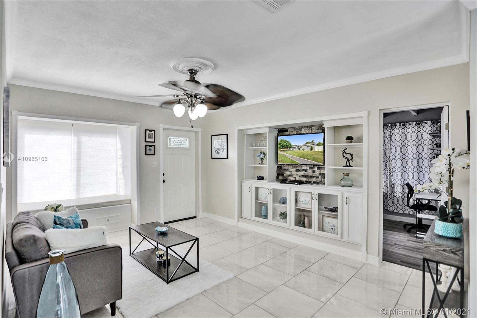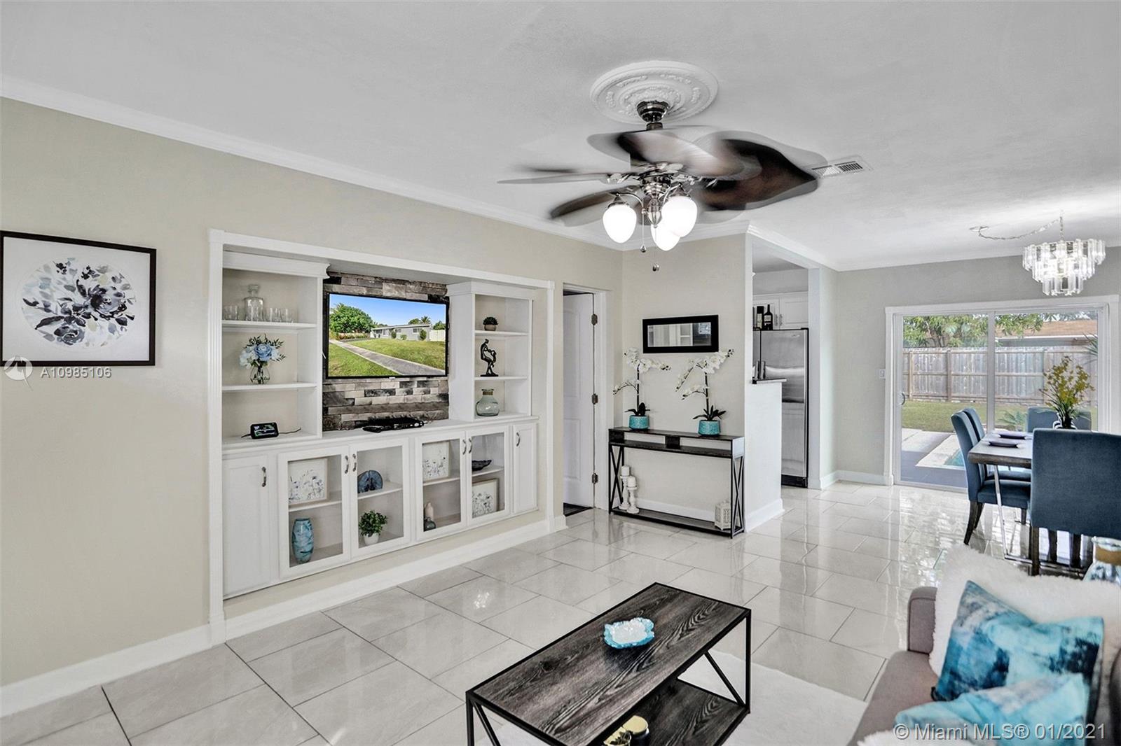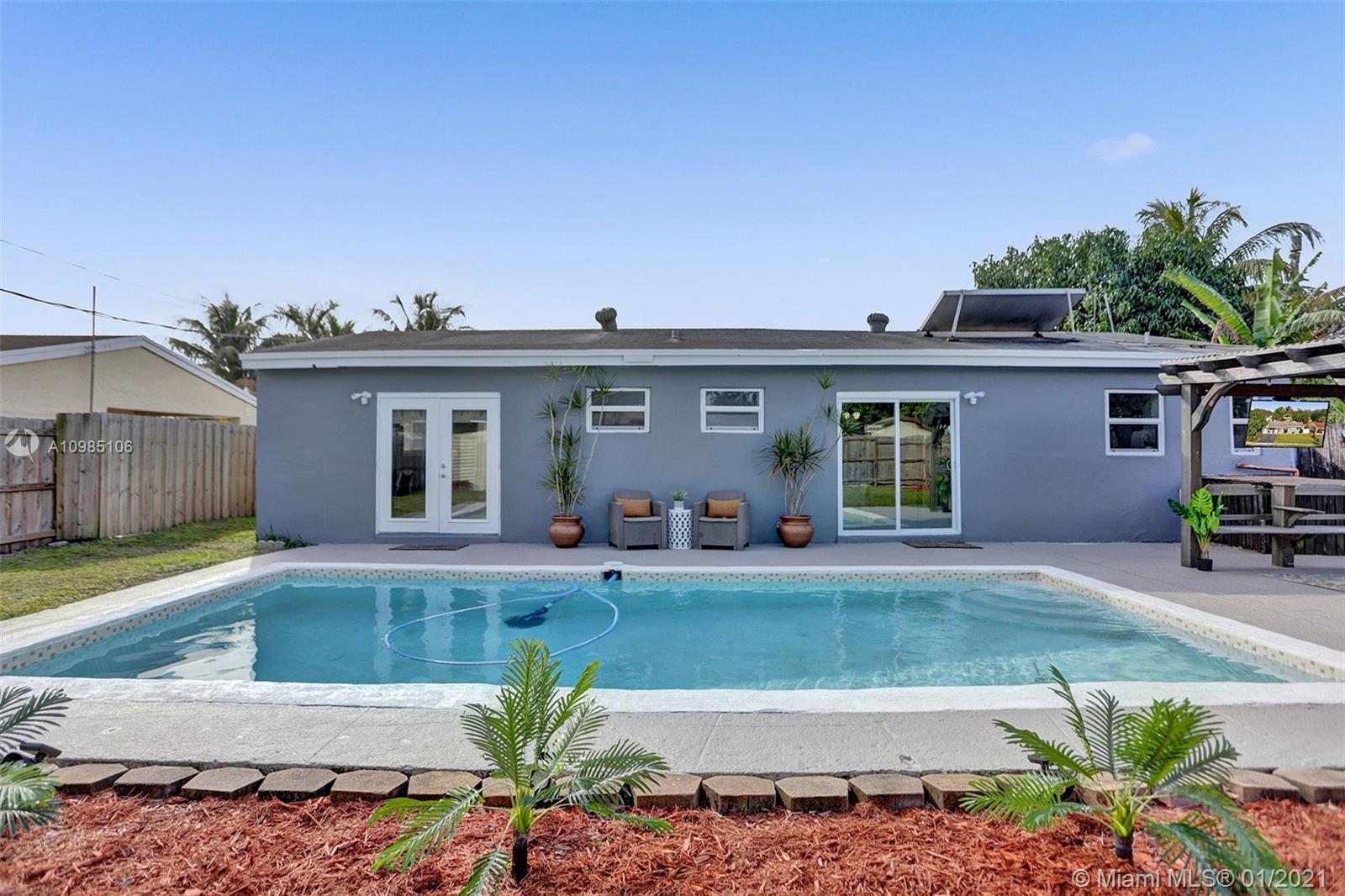 A HOME BUYER'S DREAM! Featuring 3 bedrooms & 2 remodeled baths, IMPACT WINDOWS, SOLAR WATER HEATER, POOL & PERGOLA deck in a spacious backyard. Natural bright living area with crown molding and formal living room with views of the pergola & pool area. REMODELED KITCHEN with GRANITE COUNTERS & STAINLESS STEEL APPLIANCES. Luxurious MASTER SUITE with window wood casing, crown molding and IMPACT FRENCH DOORS to the amazing pool. Remodeled Master bath with quartz counters, glass basin sink and glass tiles. Near some of best public area, public schools, Hard Rock Hotel and area shops. A MUST SEE!!!