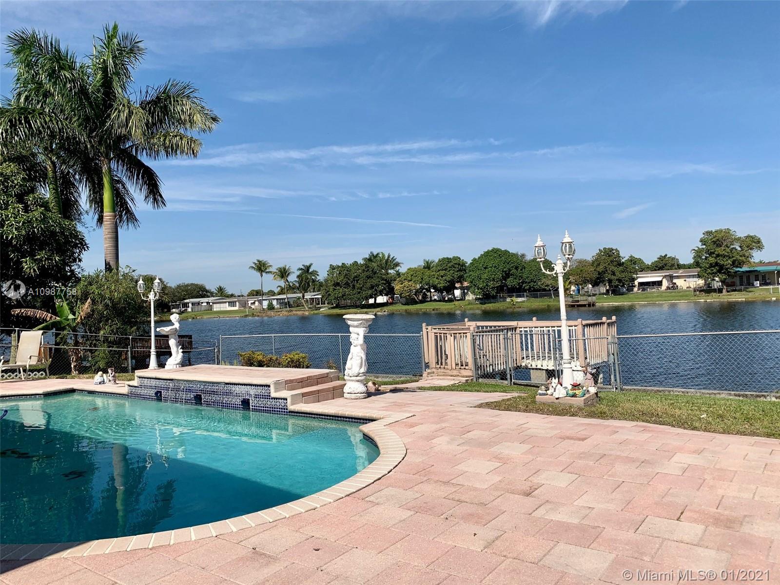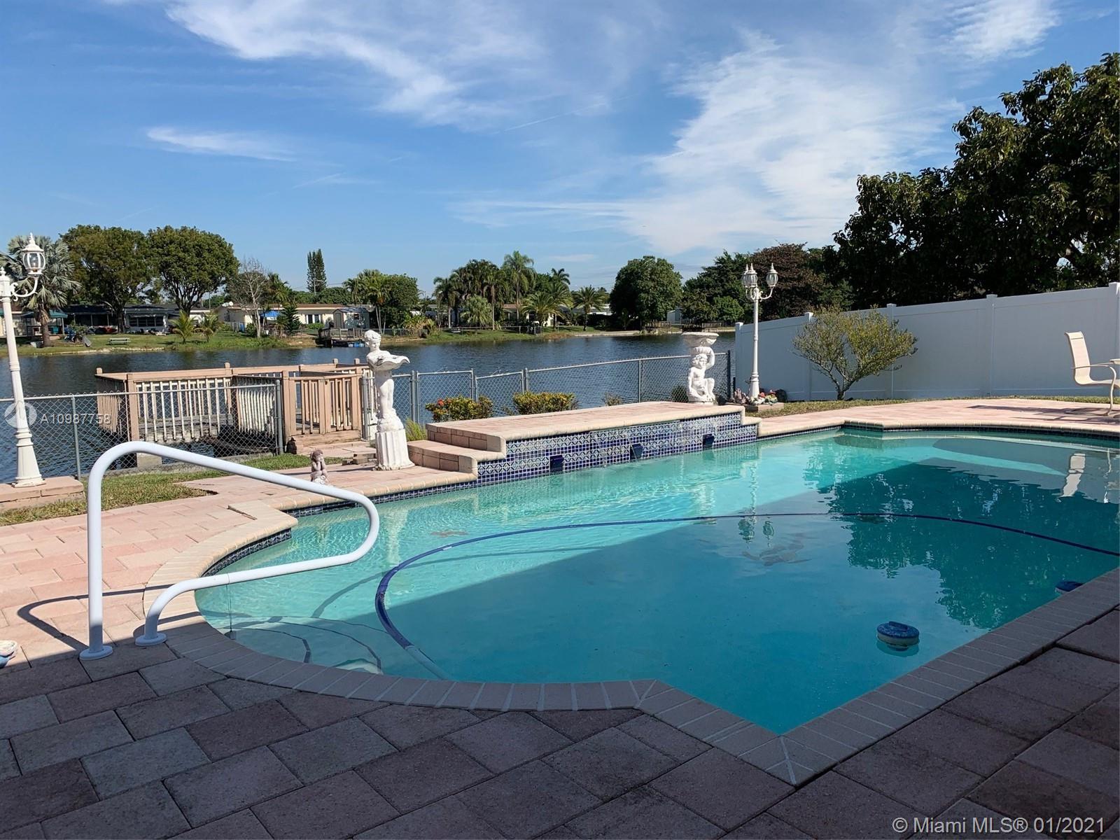 Spacious and great floor-plan 2 bedrooms, 2 full bathrooms, 1 car garage, POOL, LAKE home with private dock! Large circular driveway plus 1 car garage. ROOF 2013 STILL UNDER WARRANTY! Fully fenced patio with great pool area, beautiful lake views and extra space for entertaining and family gatherings. Hurricane shutters, needs some updating to make it your perfect home. A must see!