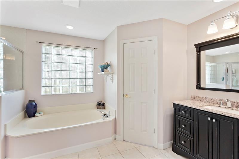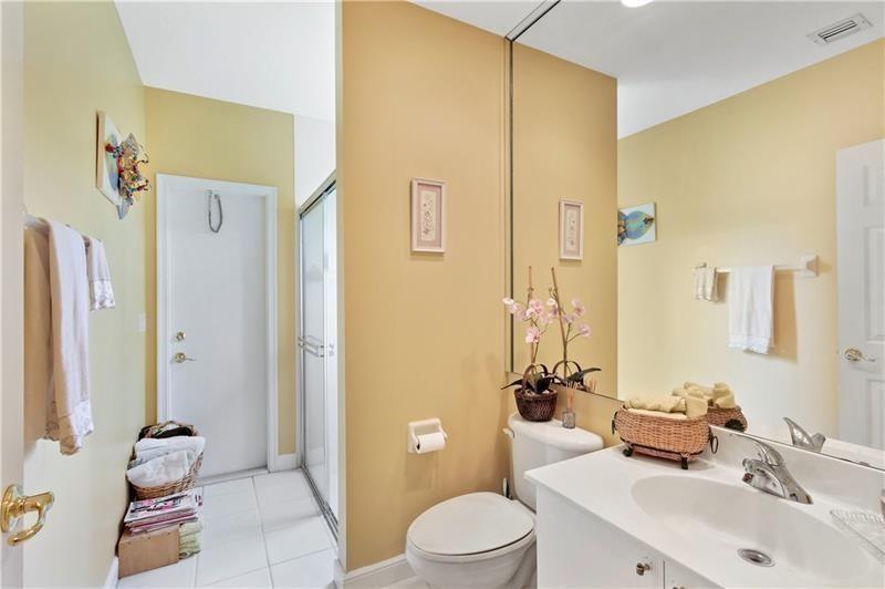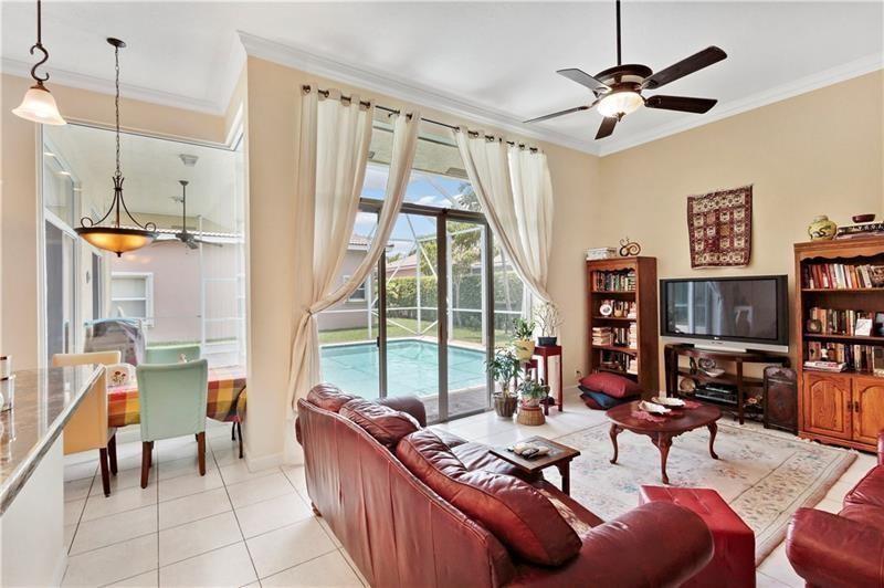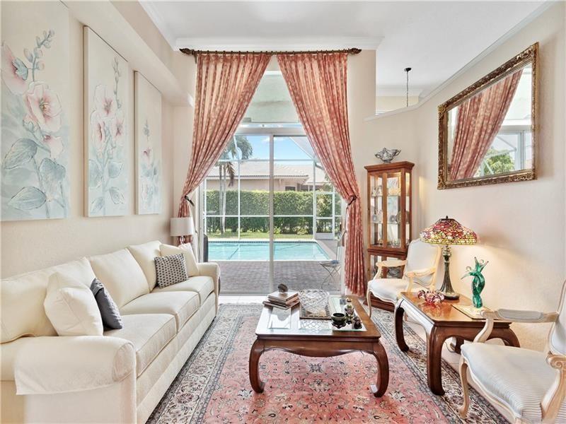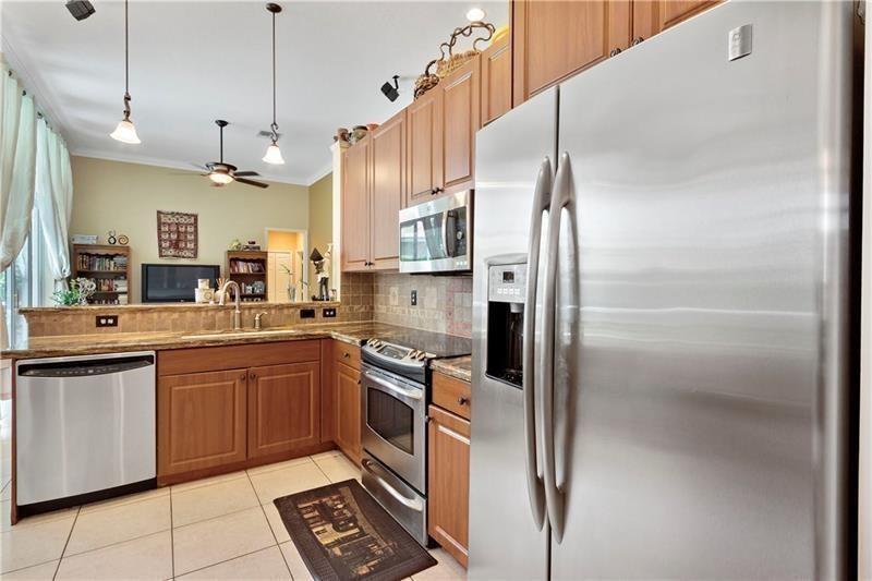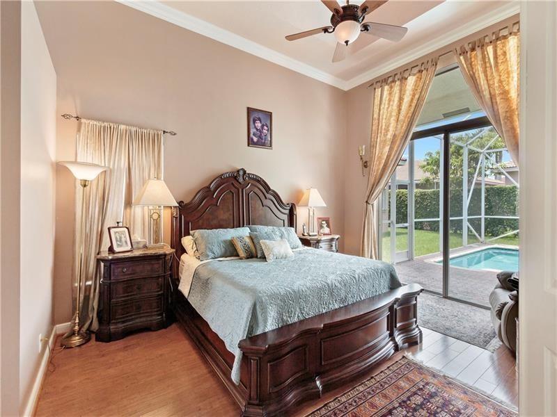 Updated kitchen w/ granite counter tops & S.S. appliances. 12 ft ceilings, crown moldings, split floor plan w/ cabana bath exit to pool. Large master bedroom w/ cathedral ceiling 2 walk in closets & his/her vanities. Wood floors in bedrooms & tile in living areas. Fresh exterior paint 6/18. Screened in pool w/ covered patio. Exterior including lawn fully covered by assoc.