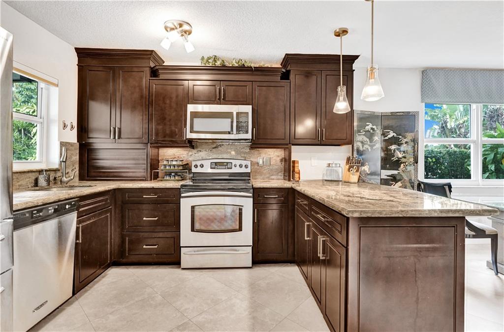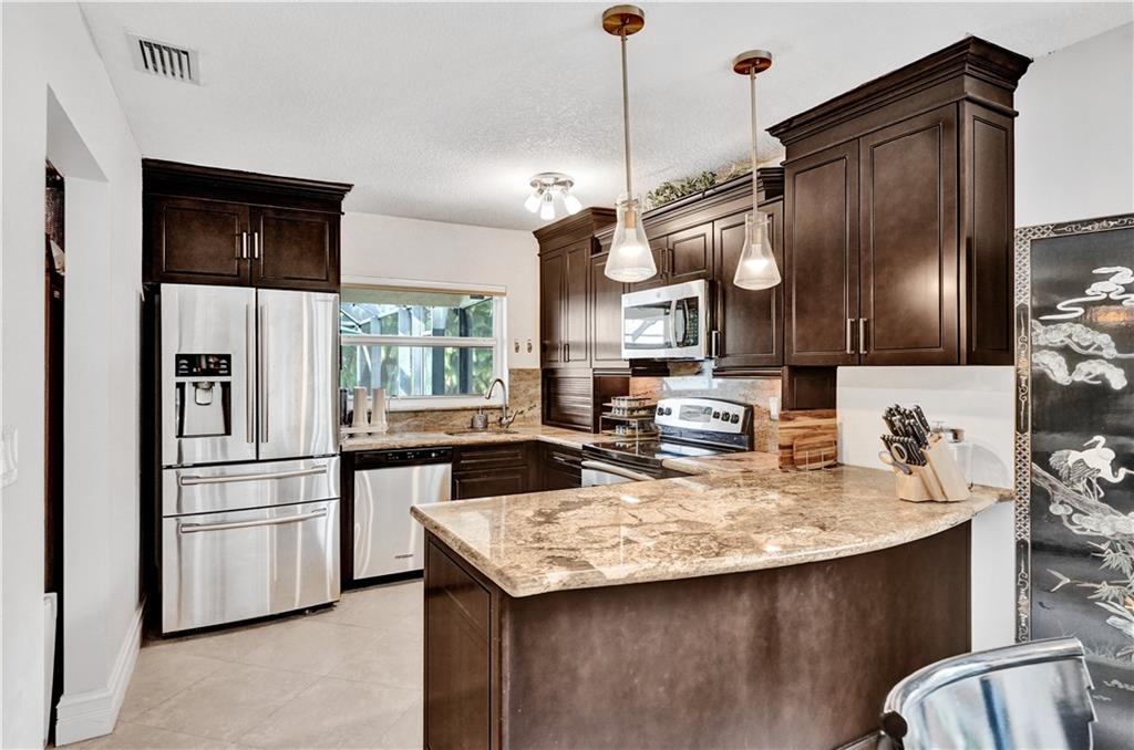 Imagine living in this 3 bedroom, 2 bathroom, 2 car garage single family home in Coral Springs on a lake-front lot. This home features ceramic tiled floors throughout, as you enter into an open living room/dining room area, with double sliding glass doors taking you out to the screened-in pool area with a large outdoor entertainment space. A gourmet chef’s kitchen features dark-wood cabinetry, stainless-steel appliances, and an eat-in counter top open to the dining room. The Master Bedroom features a large walk-in closet with ceramic faux-wood flooring. Master bathroom highlights a large marble-lined shower with an oversized shower and a modern sink with granite-topped cabinets. The other large sized two bedrooms feature tiled flooring and remodeled bathroom.