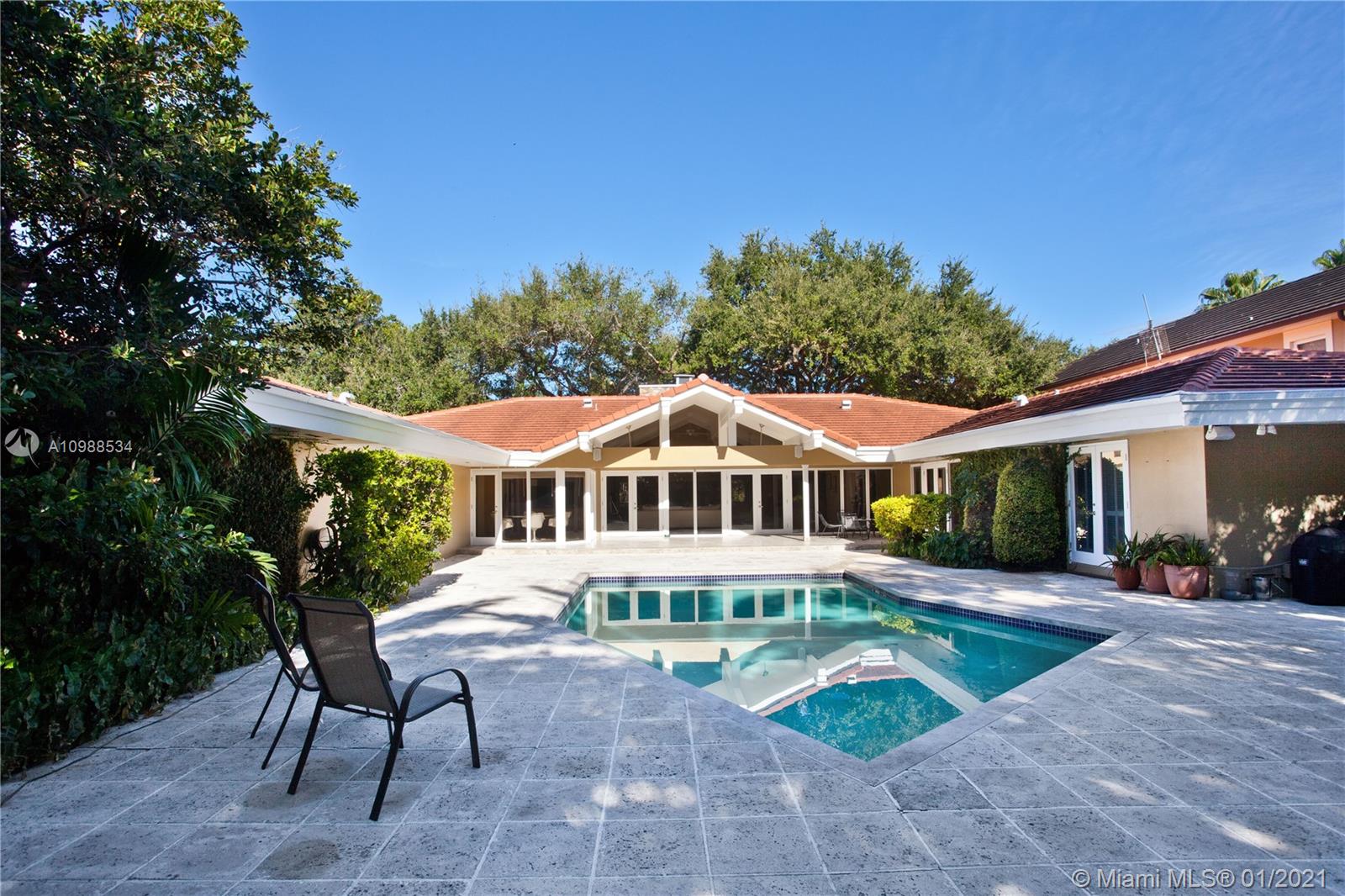 This spacious and sprawling residence in gated Cocoplum was expanded and updated in 2007. Most of the home occupies one floor with a convenient split floor plan, where almost all rooms have a view of the patio and pool. The main bedroom has an office/sitting area, large walk-in closets and ample spa-bathroom. Spacious eat-in kitchen and family room with volume ceilings and fireplace. The separate bedroom wing features 3 more bedrooms, 3 bathrooms, maid's quarters and laundry. The 2-story addition has a large media/game room, 1 bedroom with beautiful bath and 3-car garage, one of them facing the back pool patio. Whole house generator. Special tax district. Gated entrance and Coral Gables 24 hr police patrol and 2 tennis courts. This is a must see!