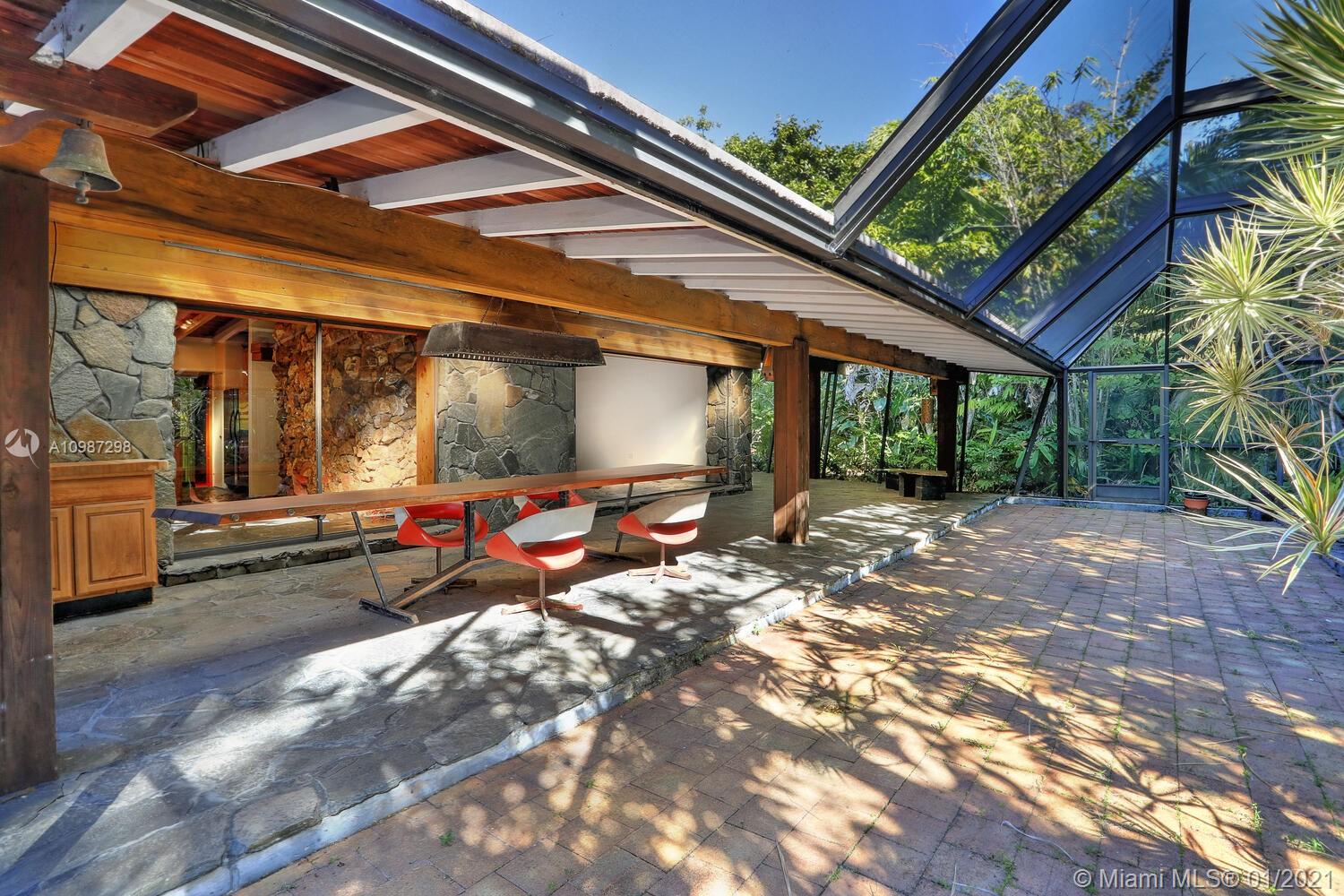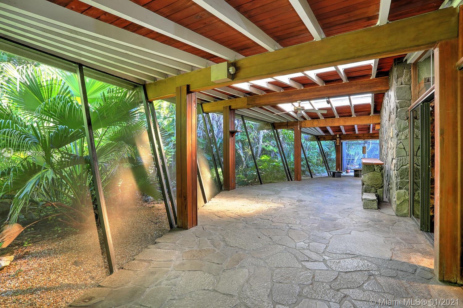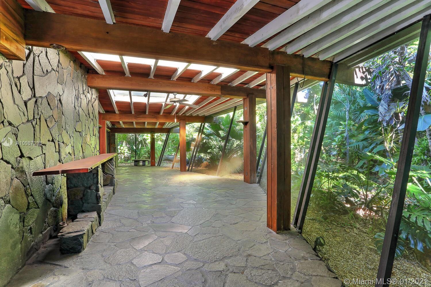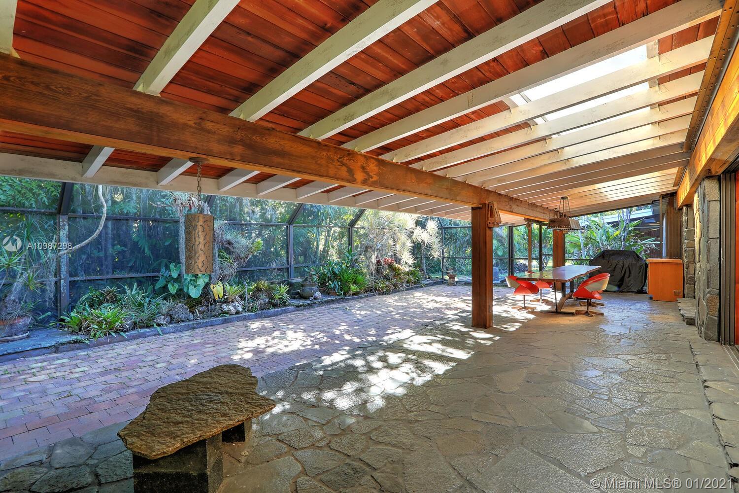 Unique, move-in ready mid-century home designed by renowned architect, Alfred Browning Parker. Located on a quiet, tree-lined street in a prime Pinecrest neighborhood, close to Pinecrest Gardens & Cultural Arts Center. Extensive use of natural stone and wood throughout. Interior features include open layout, vaulted, beamed ceilings, original onyx rock fireplace and custom built-ins. Expansive outdoor screened porch & terrace overlooking the ultra-private, lush tropical garden that surrounds the home. Total square ft size 4,513, adjusted square ft size 2,826 according to Miami Dade tax records. House has central AC. Excellent opportunity to remodel & expand. Very large 38,768 lot size. Close to A+ public & private schools