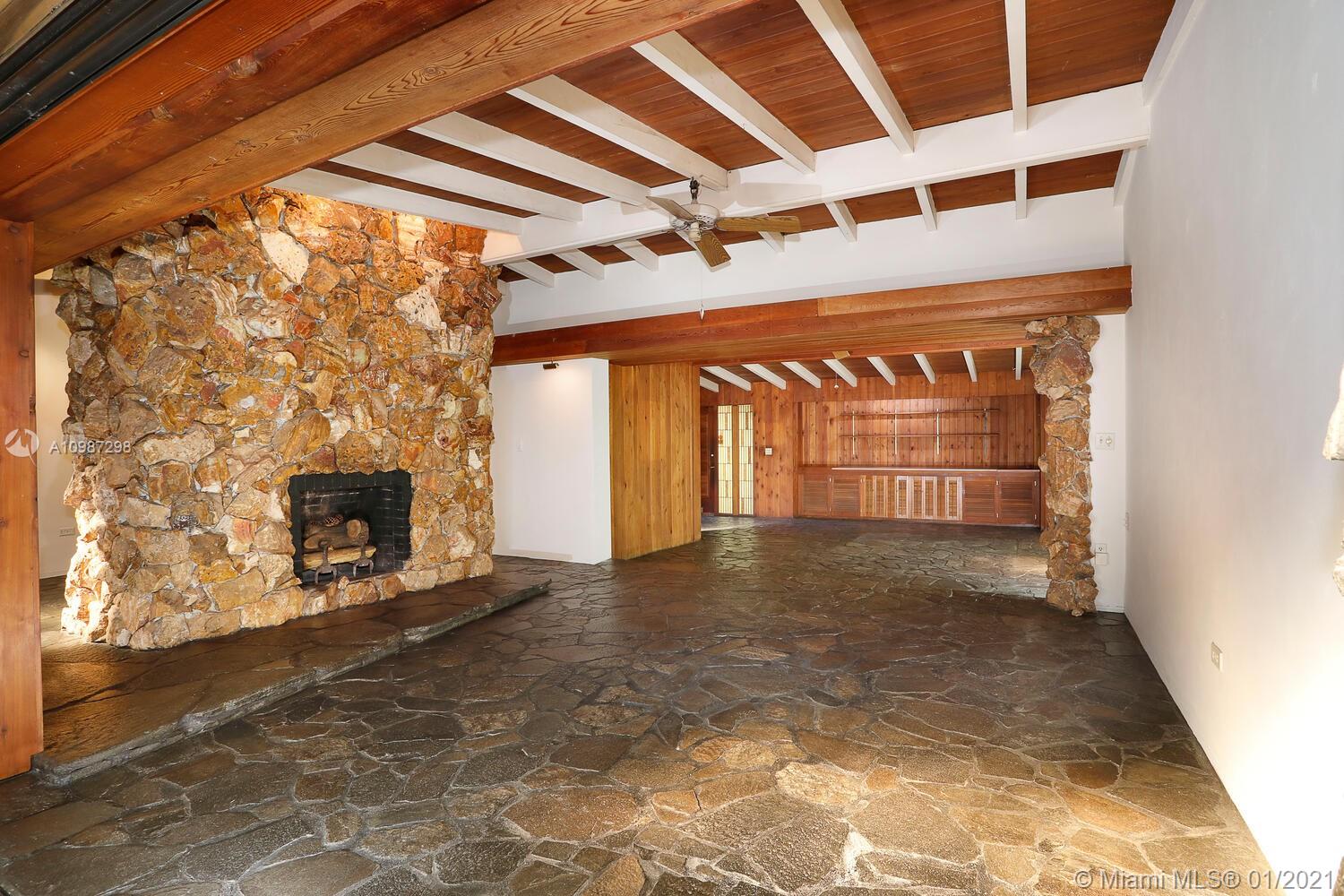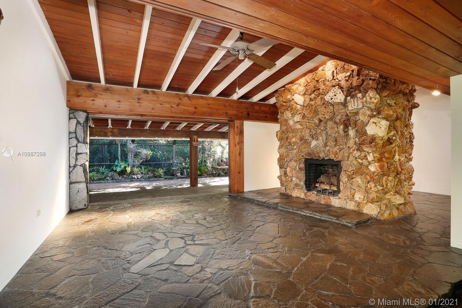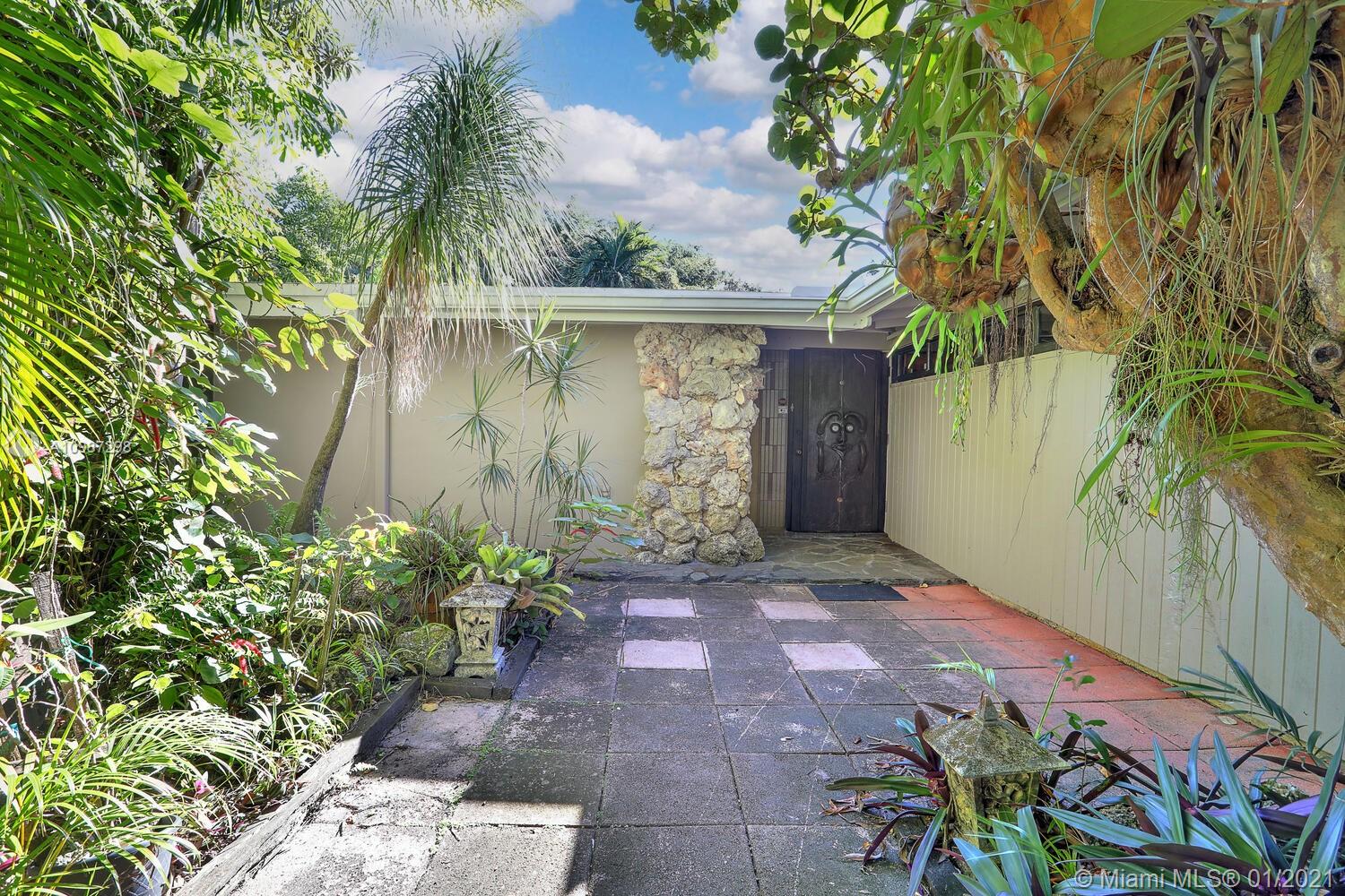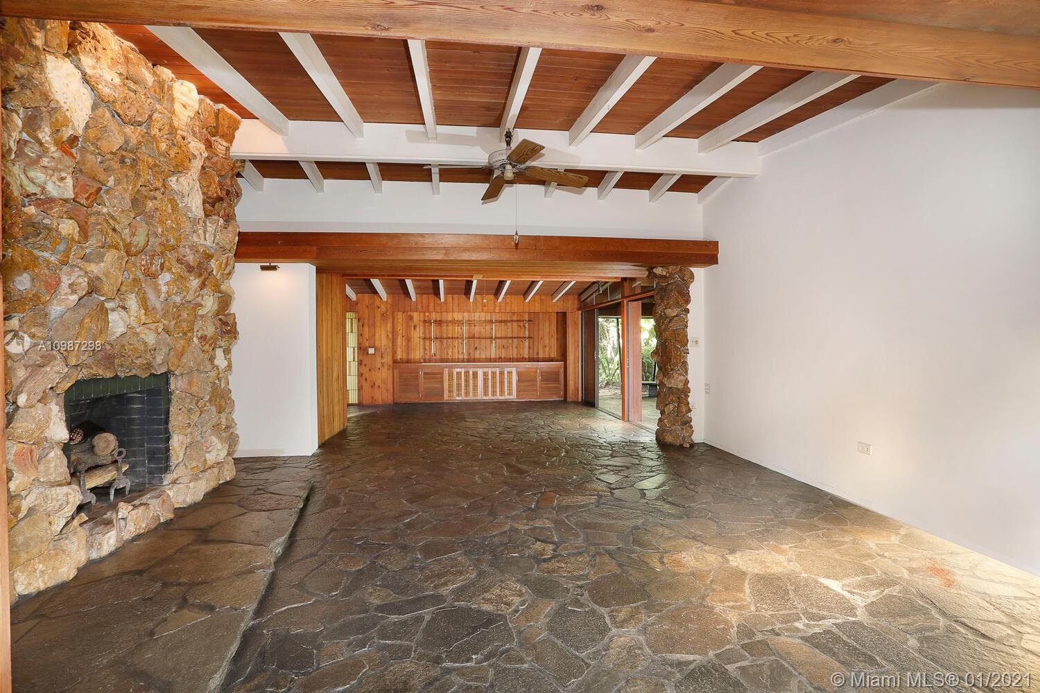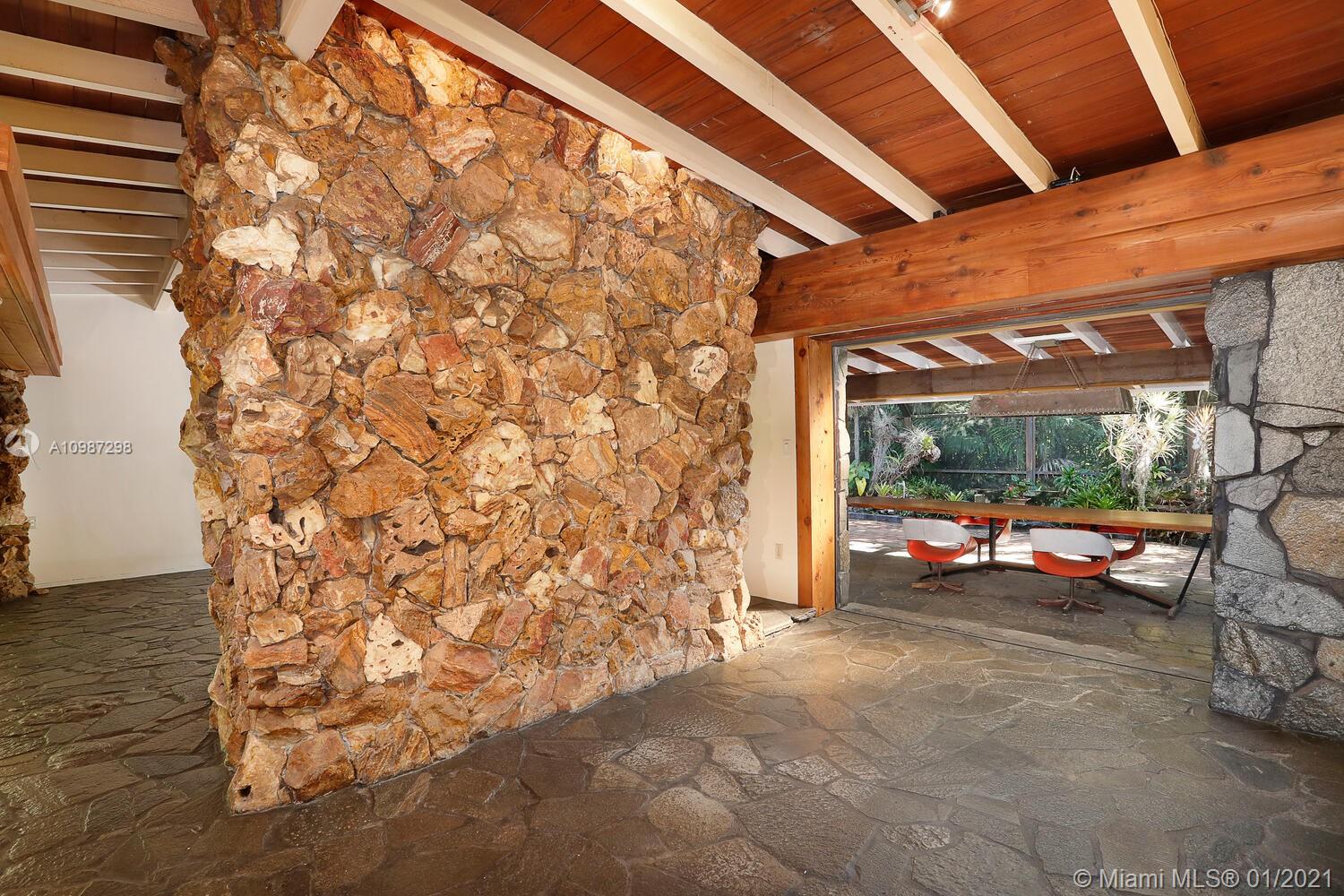Unique, move-in ready mid-century home designed by renowned architect, Alfred Browning Parker. Located on a quiet, tree-lined street in a prime Pinecrest neighborhood, close to Pinecrest Gardens & Cultural Arts Center. Extensive use of natural stone and wood throughout. Interior features include open layout, vaulted, beamed ceilings, original onyx rock fireplace and custom built-ins. Expansive outdoor screened porch & terrace overlooking the ultra-private, lush tropical garden that surrounds the home. Total square ft size 4,513, adjusted square ft size 2,826 according to Miami Dade tax records. House has central AC. Excellent opportunity to remodel & expand. Very large 38,768 lot size. Close to A+ public & private schools