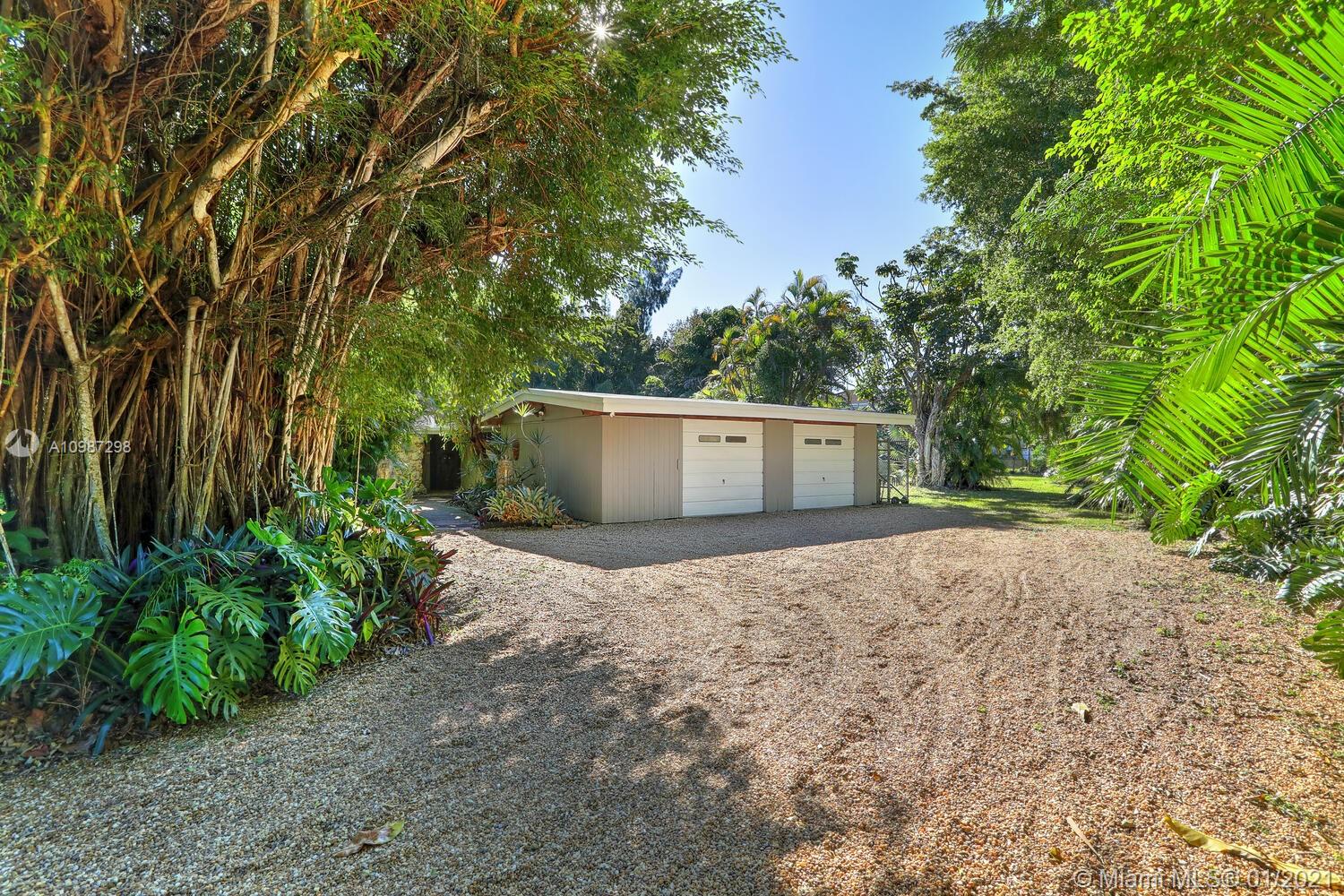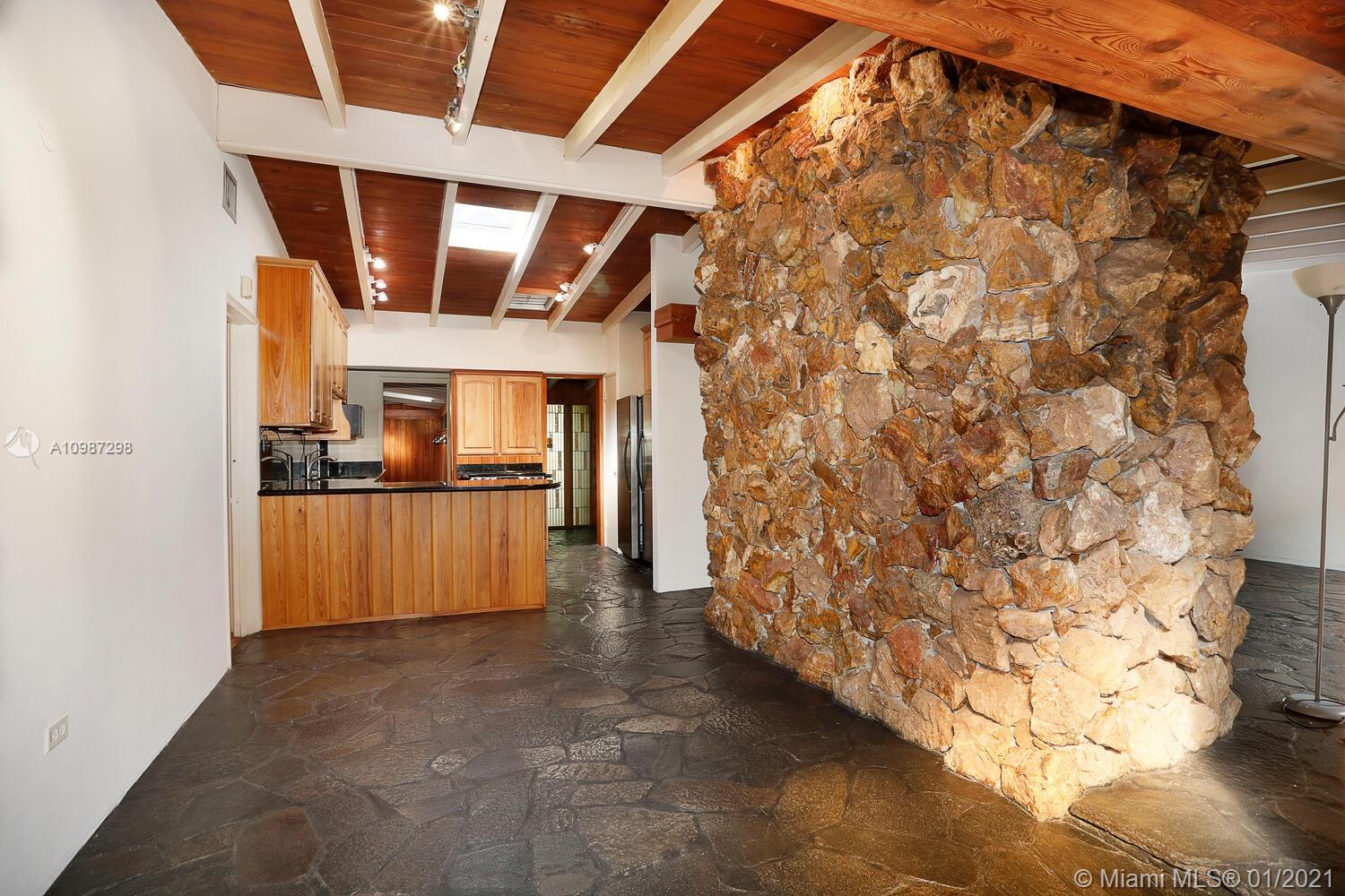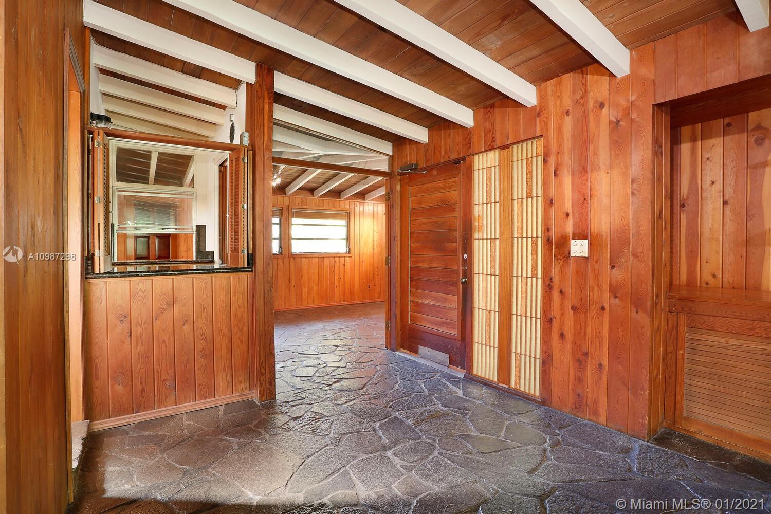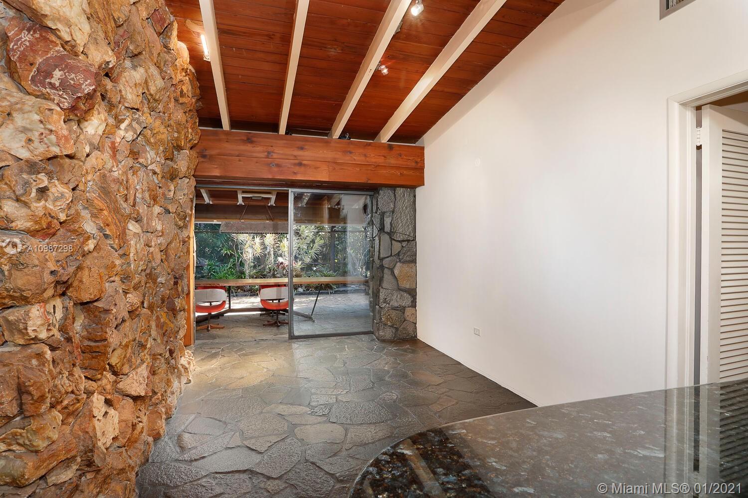 Unique, move-in ready mid-century home designed by renowned architect, Alfred Browning Parker. Located on a quiet, tree-lined street in a prime Pinecrest neighborhood, close to Pinecrest Gardens & Cultural Arts Center. Extensive use of natural stone and wood throughout. Interior features include open layout, vaulted, beamed ceilings, original onyx rock fireplace and custom built-ins. Expansive outdoor screened porch & terrace overlooking the ultra-private, lush tropical garden that surrounds the home. Total square ft size 4,513, adjusted square ft size 2,826 according to Miami Dade tax records. House has central AC. Excellent opportunity to remodel & expand. Very large 38,768 lot size. Close to A+ public & private schools