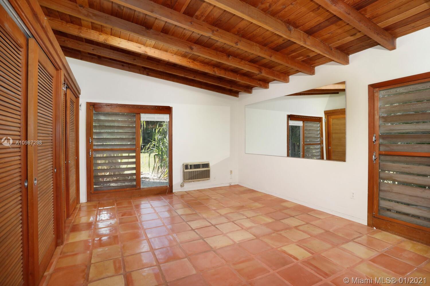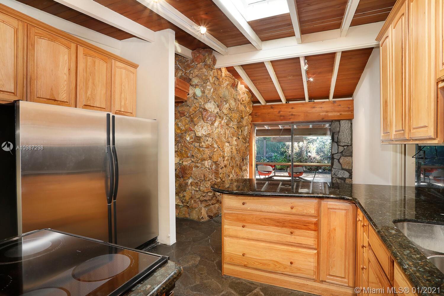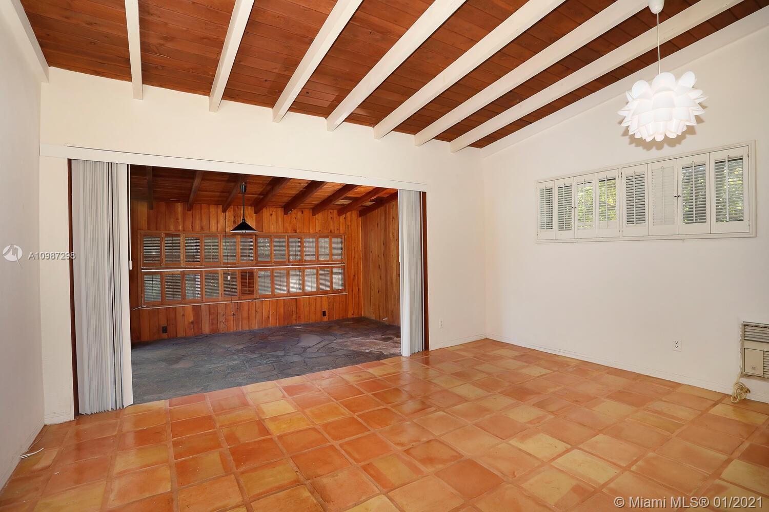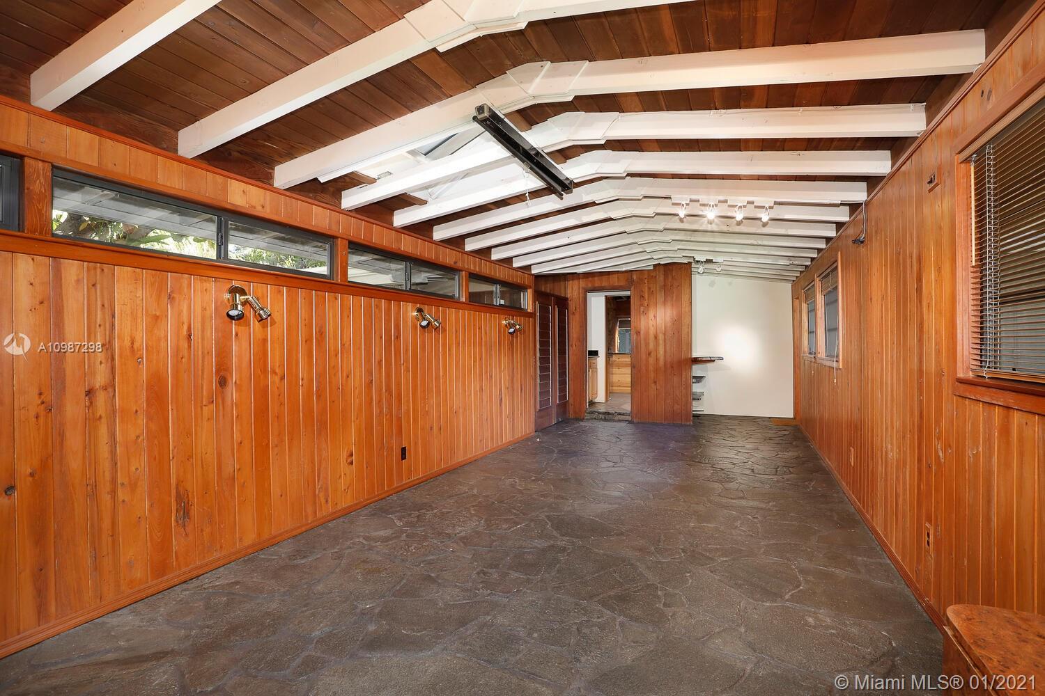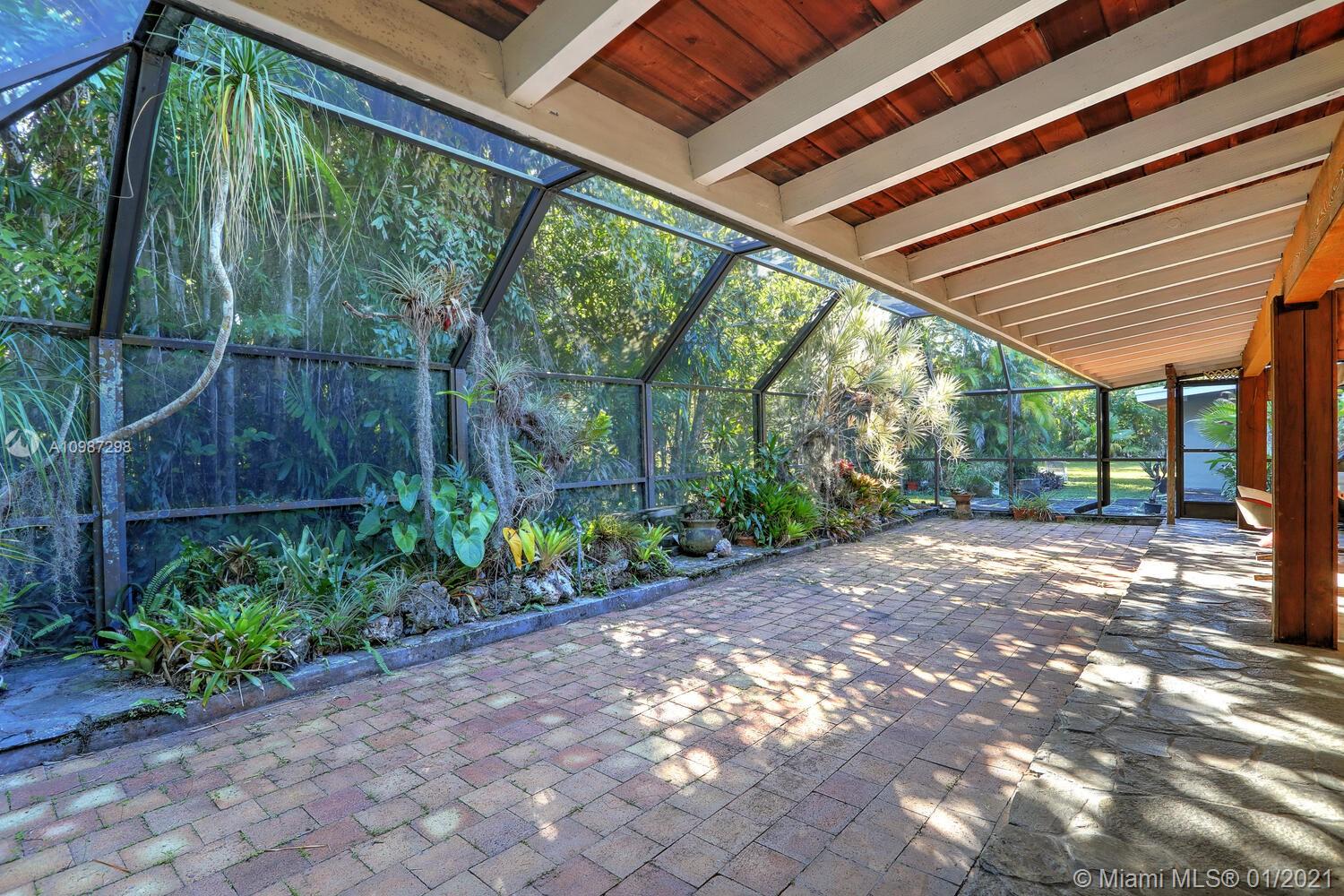 Unique, move-in ready mid-century home designed by renowned architect, Alfred Browning Parker. Located on a quiet, tree-lined street in a prime Pinecrest neighborhood, close to Pinecrest Gardens & Cultural Arts Center. Extensive use of natural stone and wood throughout. Interior features include open layout, vaulted, beamed ceilings, original onyx rock fireplace and custom built-ins. Expansive outdoor screened porch & terrace overlooking the ultra-private, lush tropical garden that surrounds the home. Total square ft size 4,513, adjusted square ft size 2,826 according to Miami Dade tax records. House has central AC. Excellent opportunity to remodel & expand. Very large 38,768 lot size. Close to A+ public & private schools