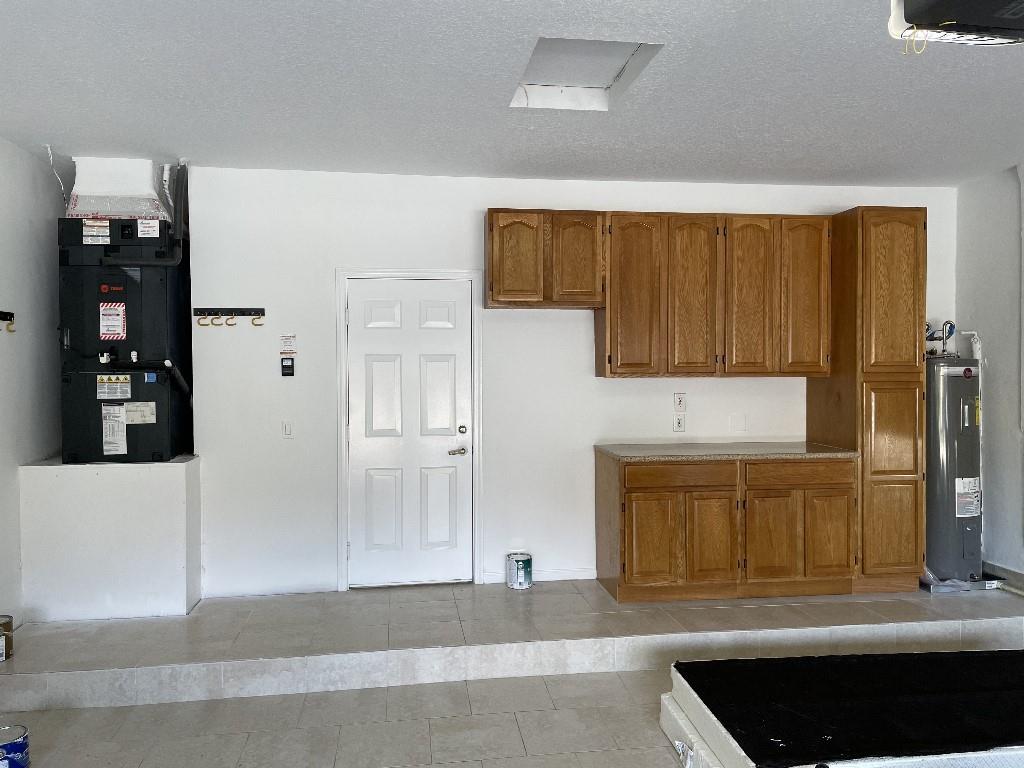 12 foot ceilings. New garage door, toilets, A/C, and water heater. Tiled garage with cabinets and granite counter loading space.