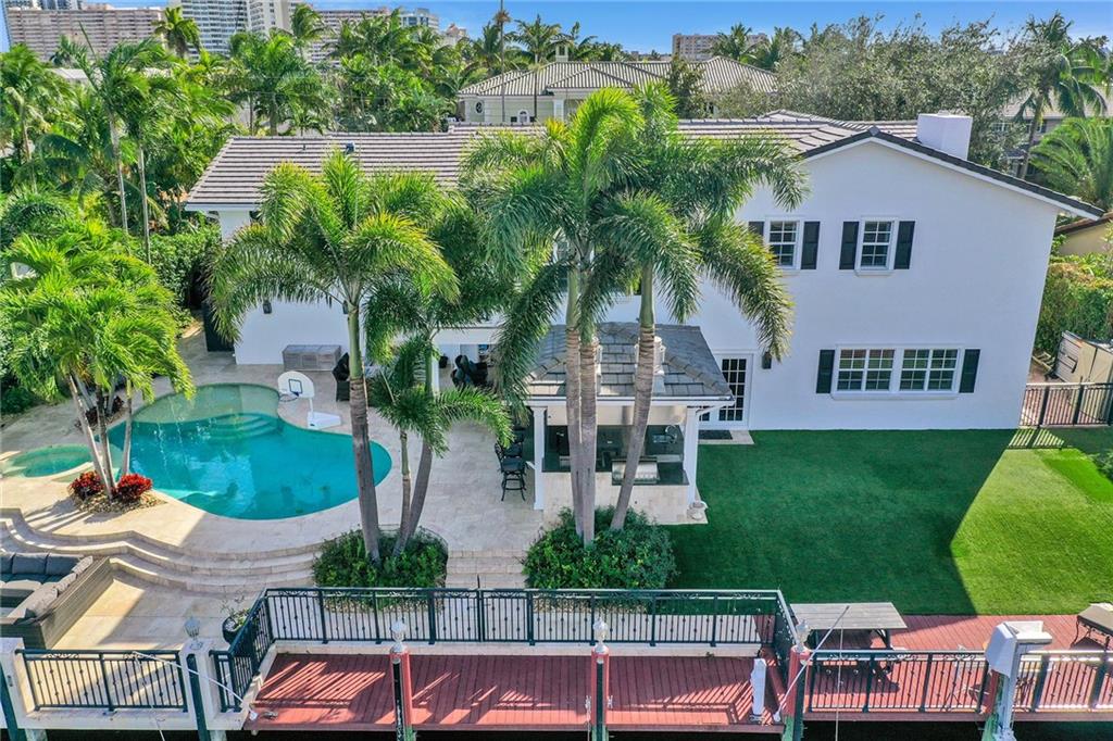 No expense spared in this exceptional expansion and remodel of this "Traditional Coastal" home. Located one house from the Intracoastal with 115' of Deepwater Dock this home offers exceptional views, massive outdoor living space and dockage for up to 105' of vessels. Rebuilt like new over the last several years including: seawall and dock, roof, new pool and spa, all PVC sewer lines and all Hurricane Impact Windows and Doors. Incredible master suite offers large sitting room, high ceilings, two massive walk in closets and private balcony overlooking the Intracoastal. Large living spaces perfect for entertaining. Five bedrooms + office + upstairs kids family room. All baths redone and 4 of the bedrooms have private baths. Generator ready. Huge garage and massive driveway space.