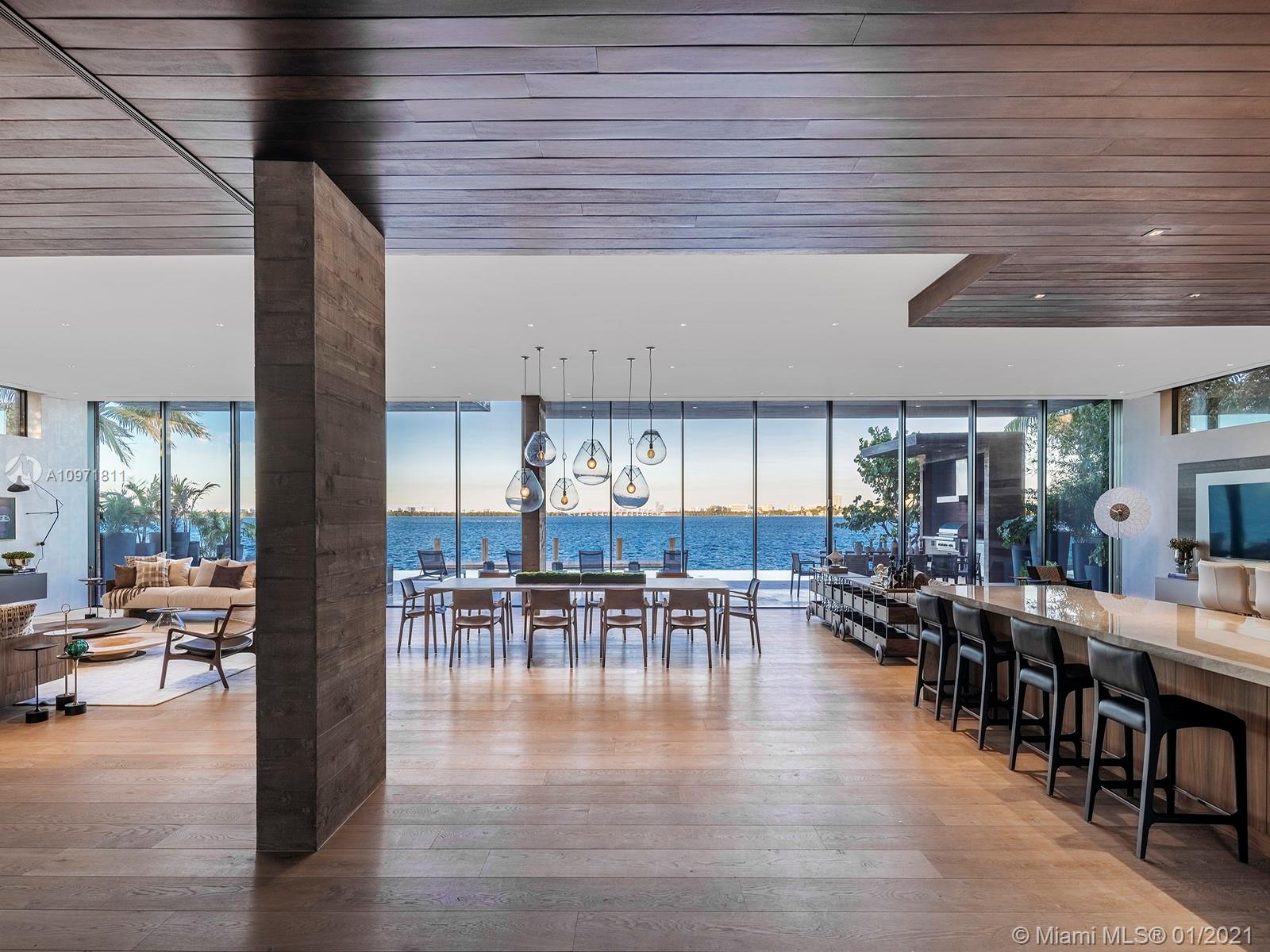 This magnificent Venetian Islands estate has 99 feet of Biscayne Bay frontage, showcased by 12-foot-high retractable Vitrocsa windows that blur the line between inside and out. The sweeping, open-plan interior leads directly to deep terraces, a zero-edge pool with integrated spa, a cabana kitchen, and an Ipe wood dock. Rich materials and bespoke details make the large, 7,112 sq. ft. home feel handcrafted and intimate. The large office features a privacy glass feature and private bath, with courtyard views. Upstairs, two guest rooms feature wide bay views, in addition to the secluded master suite which also offers two balconies, an Ornare closet, and a private gym. The home has been impeccably furnished by Design Solutions and Fisker International with custom pieces by Jader Almeida.
